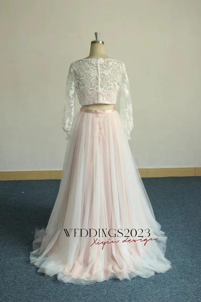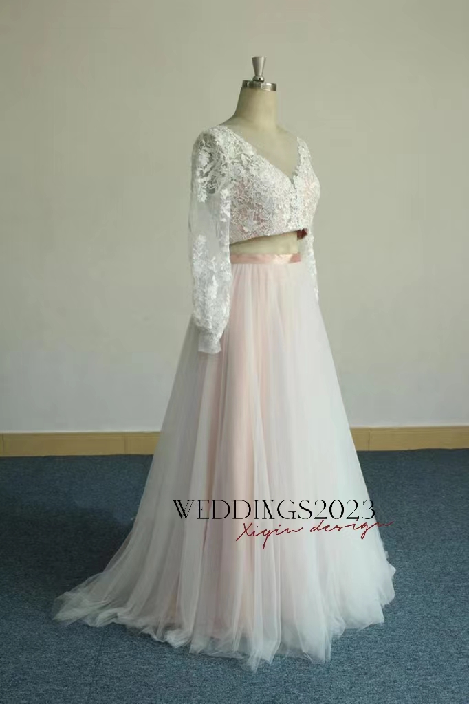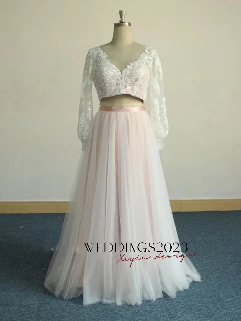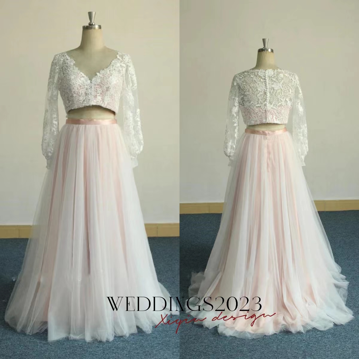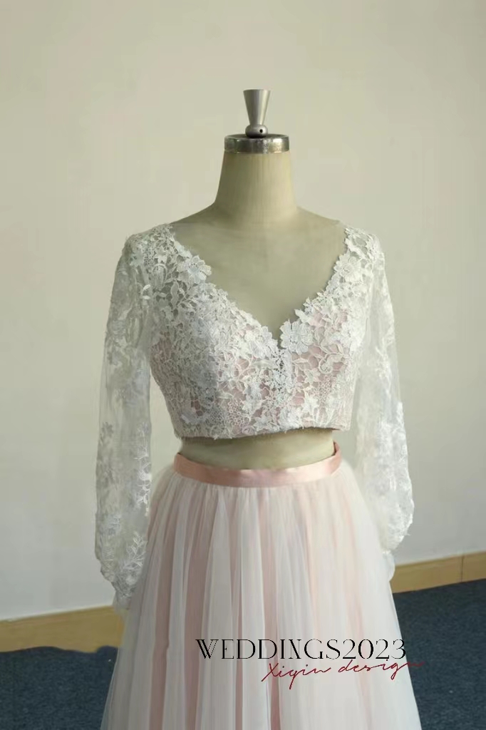 Bridal Boho Crop Top and Wedding Dress Skirt Set Halter V Neck Lace Top with A Line Tulle Skirt Bridal Separates Boho W-56032