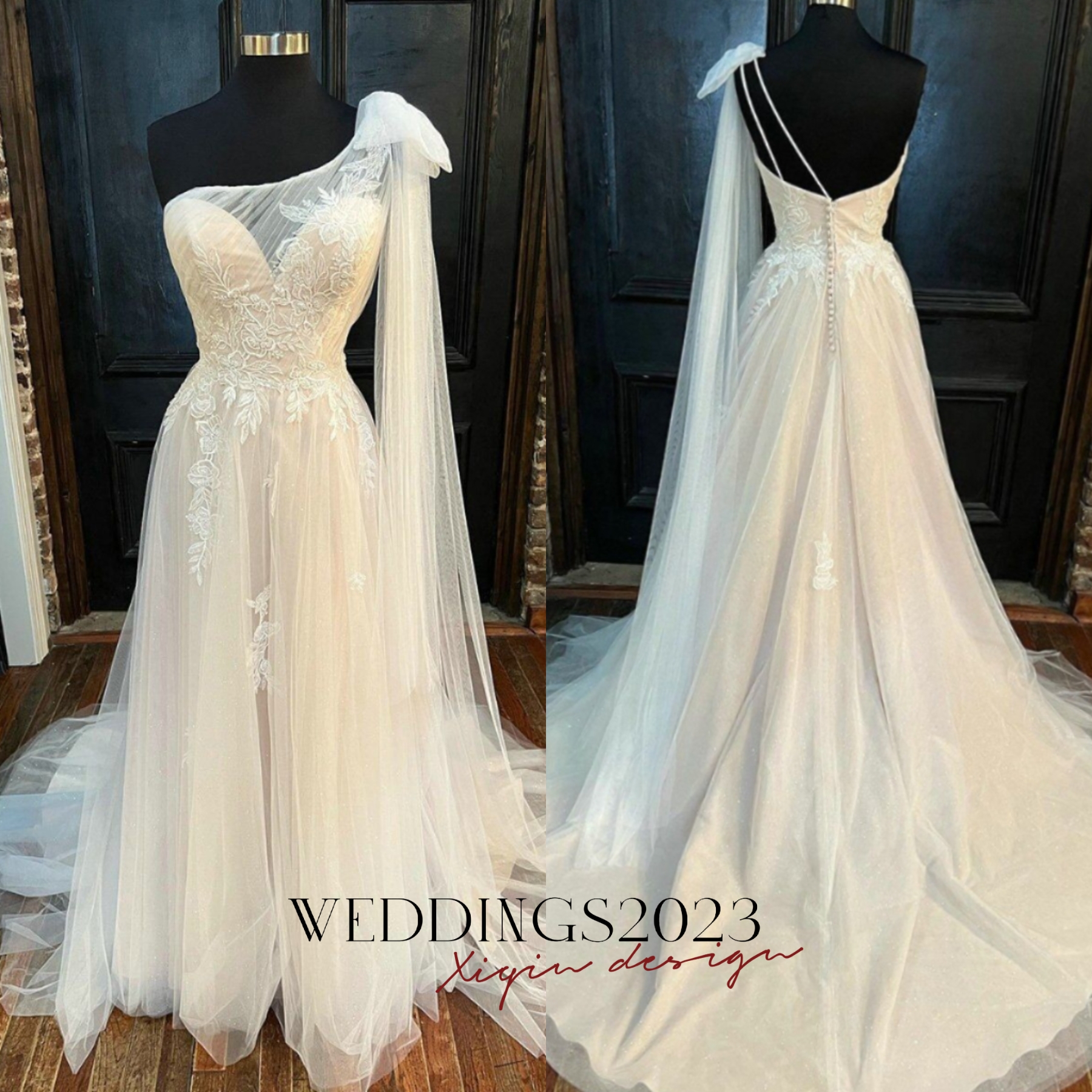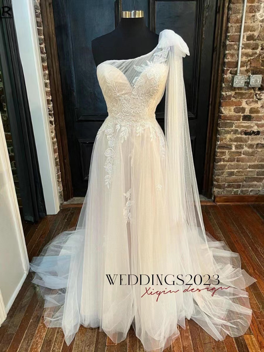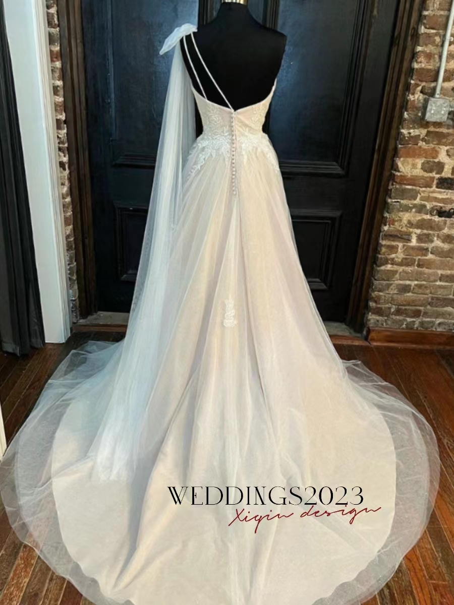 Real Image One Shoulder Pleat Ribbons Wedding Dresses A-Line Illusion Appliques Lace Bridal Gowns W-56049