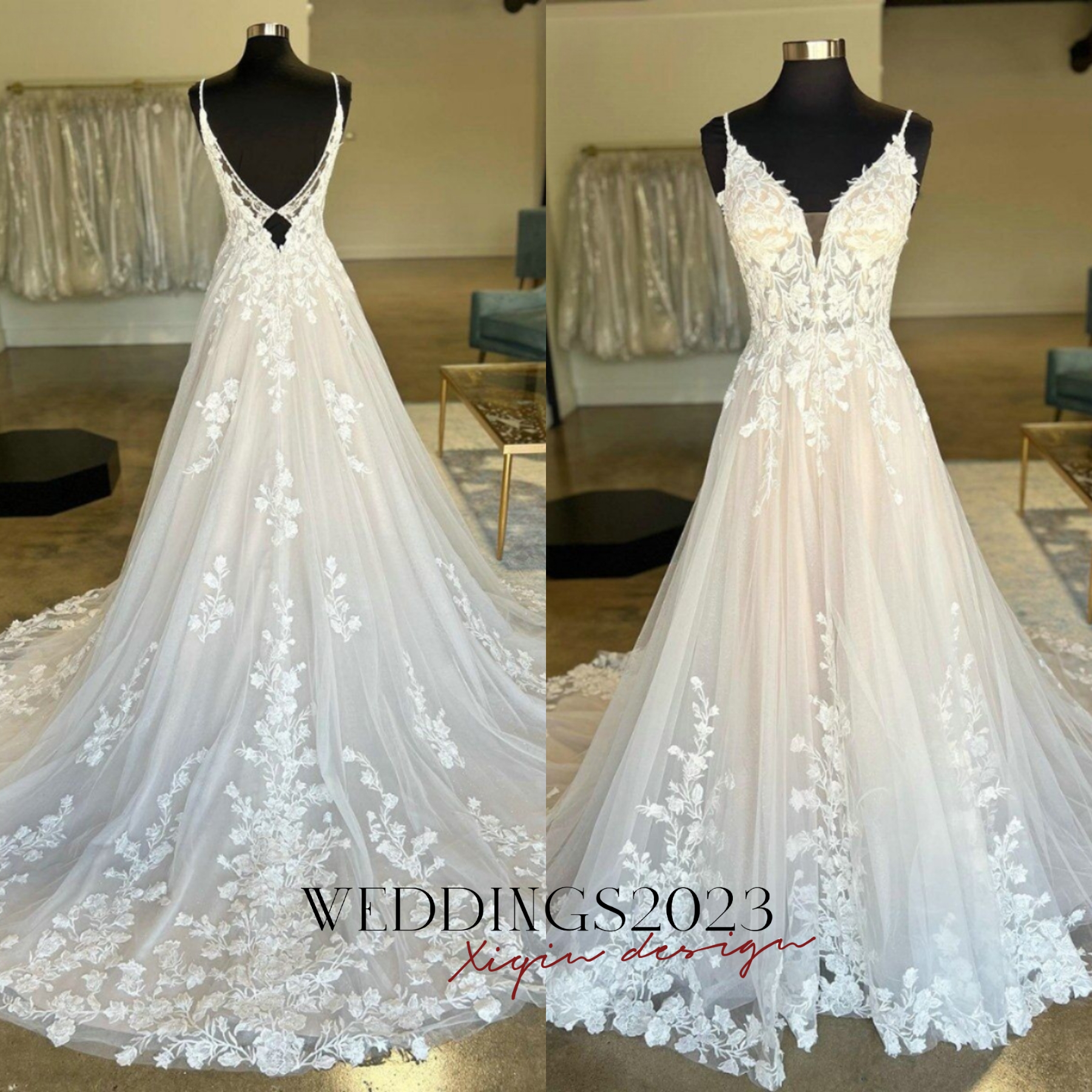 The backless design adds a touch of sensuality, while the A-line silhouette flatters all body types, making it an ideal choice for brides seeking both comfort and grace. The long tulle skirt gracefully flows with each step you take, creating a dreamy and ethereal look that is perfect for a garden wedding.