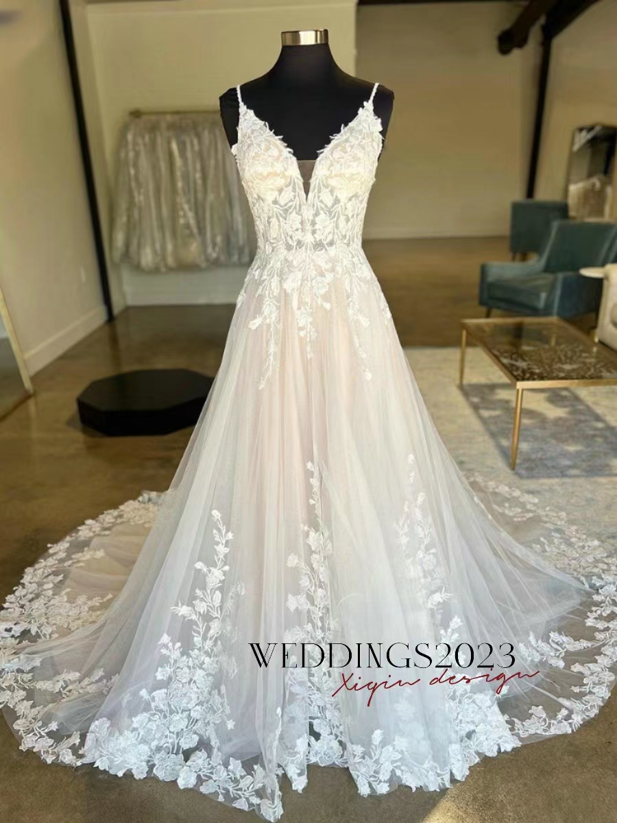 Charming Applique Lace Illusion V-Neck Backless Wedding Dresses Sexy A-Line Spaghetti Straps Appliques Lace Bridal Gowns W-56045