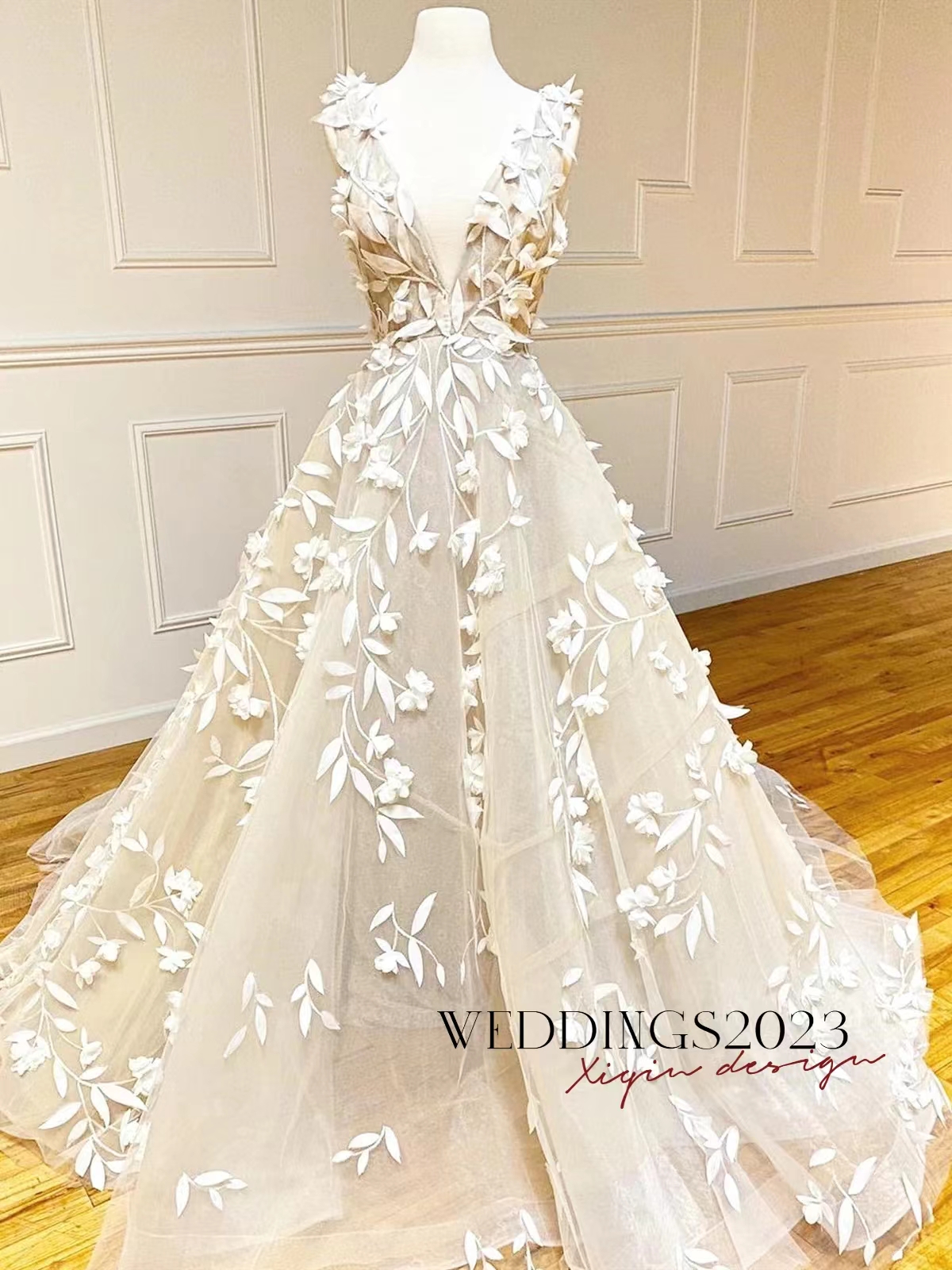 Deep V Neck Champagne Lace Floral Long Prom Dresses V Neck Champagne Formal Evening Dresses Ball Gown W-56068