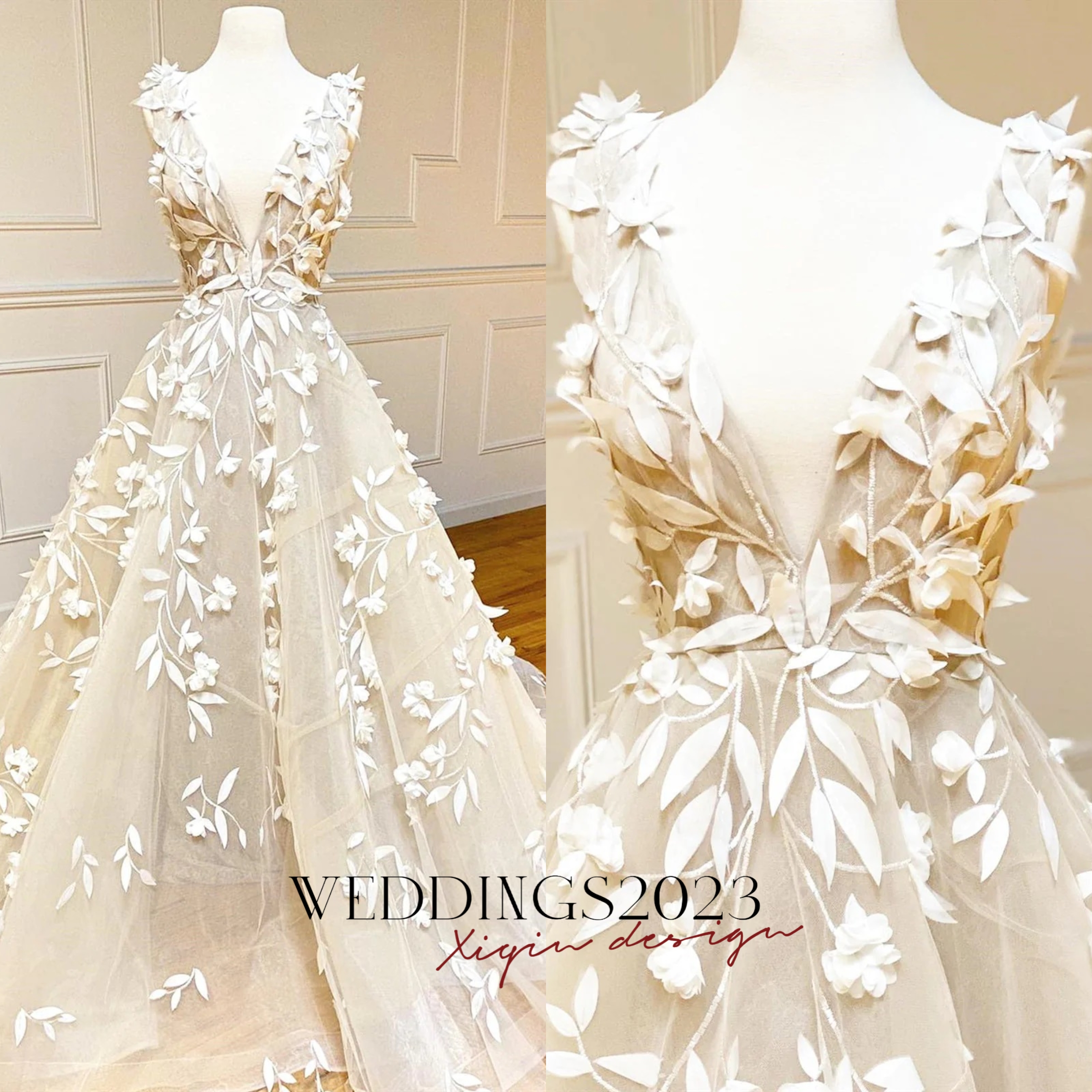 Capture the essence of romance and elegance with our Bohemian Floral Wedding Dress. This exquisite vintage-inspired gown features intricate 3D floral and leaf lace detailing, creating a breathtaking visual effect that will leave you and your guests in awe. Crafted with the highest quality materials, this dress boasts a perfect combination of timeless charm and modern style.