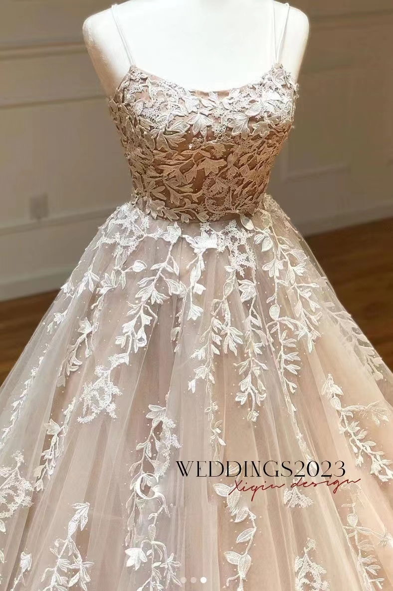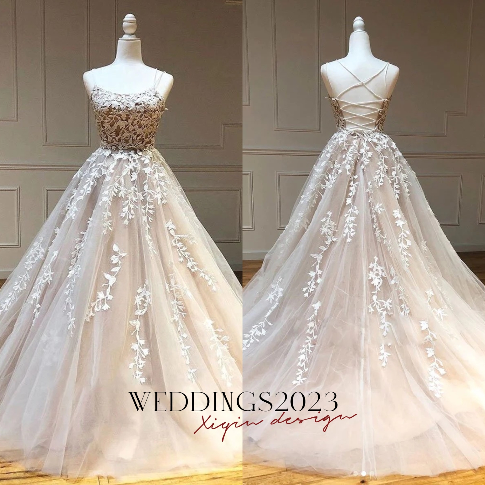 Exclusive Lace Wedding Dress Delicate Applique Spaghetti Straps Dress with Long Train but still in light weight!Capture the hearts of your guests and create unforgettable memories as you walk down the aisle in our Bohemian Floral Wedding Dress. Embrace the beauty of nature and your own inner goddess with this one-of-a-kind gown that combines vintage charm with modern sophistication.