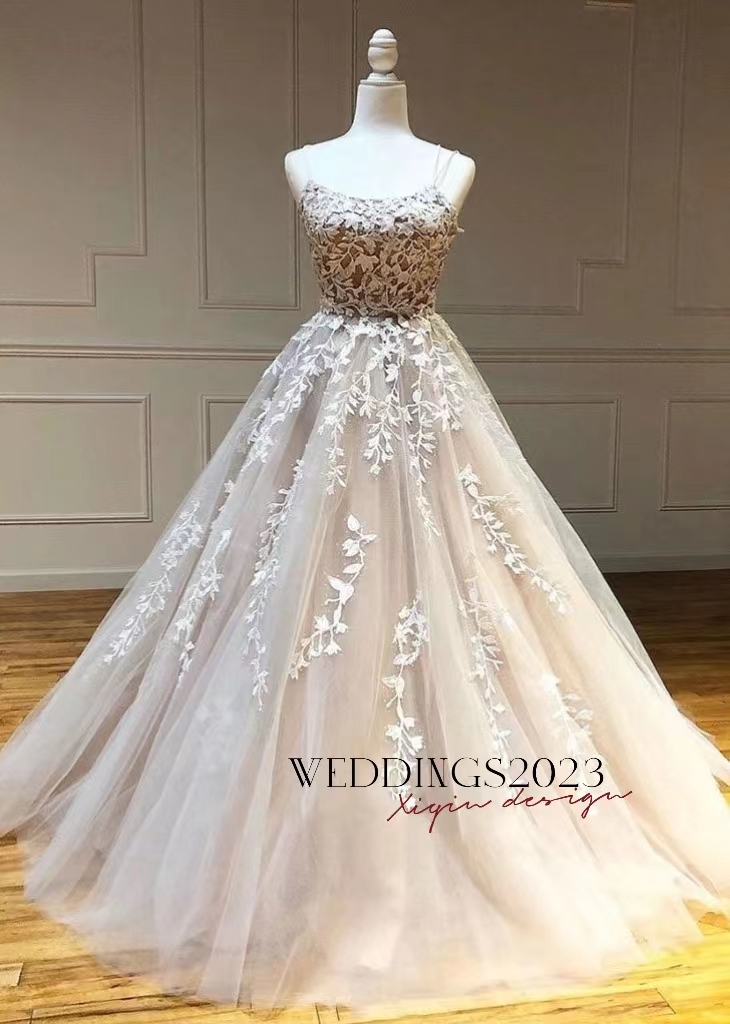 Champagne Tulle Scoop Wedding Dress Appliqued Lace Long Formal Ball Gown W-56069