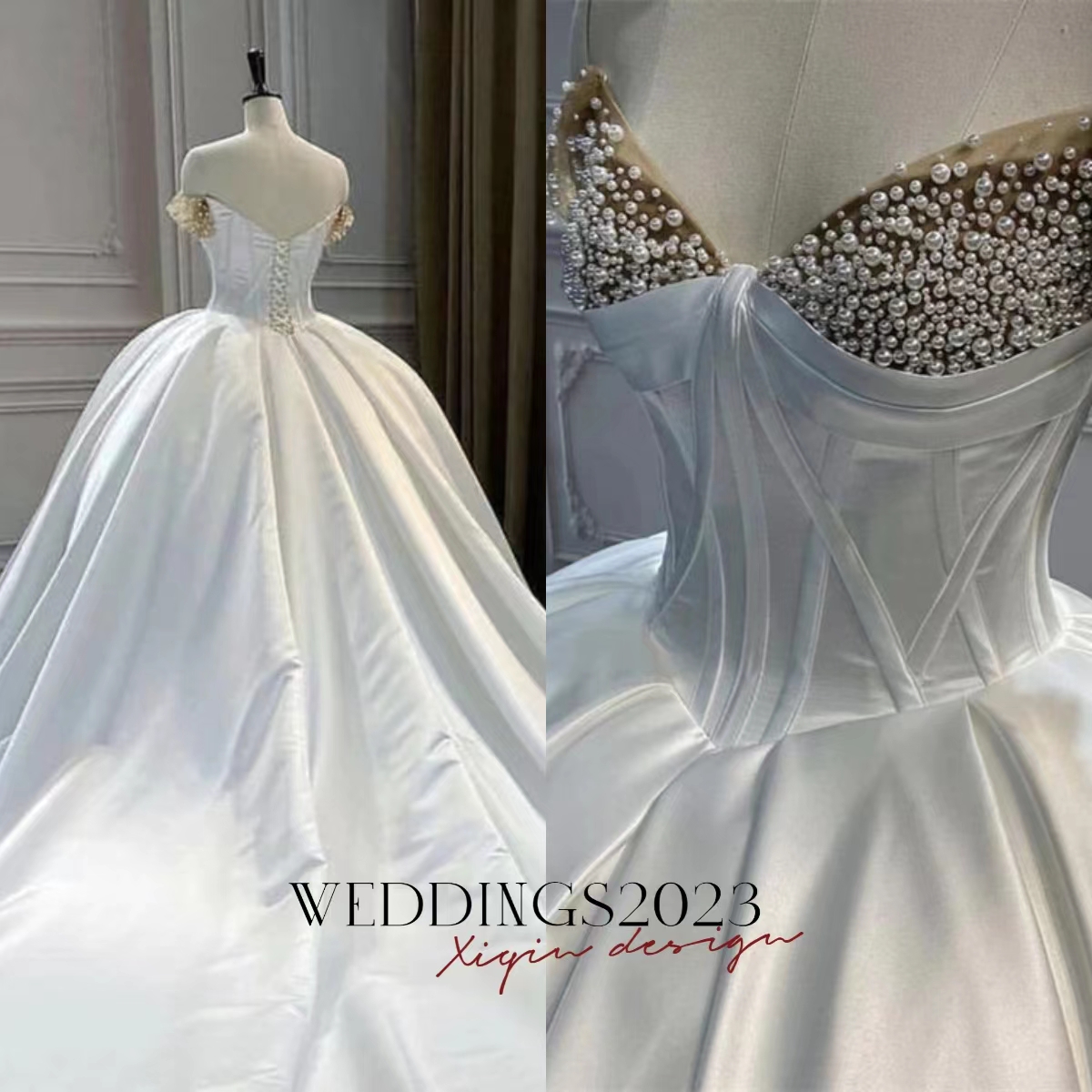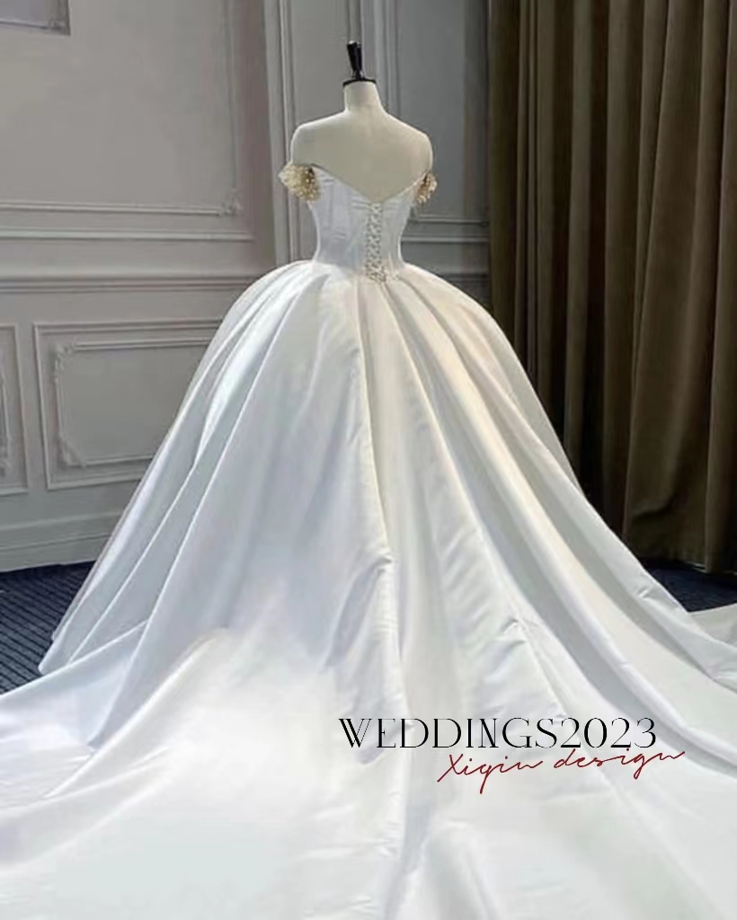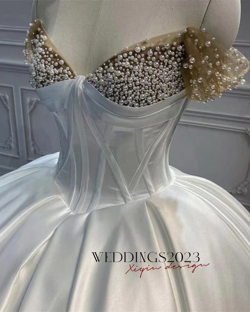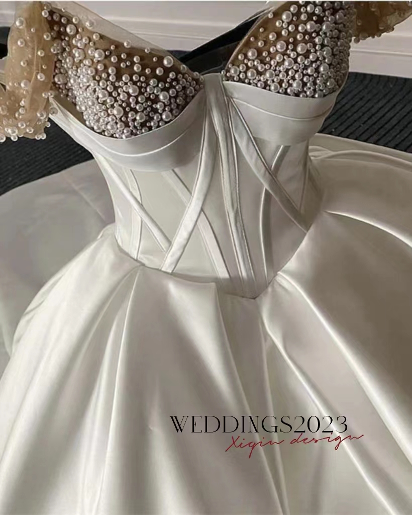 Charming Pearl Satin V-neck Wedding Dresses Short Sleeve Beading Ball Gown Satin Corset Cathedral Train W-56071