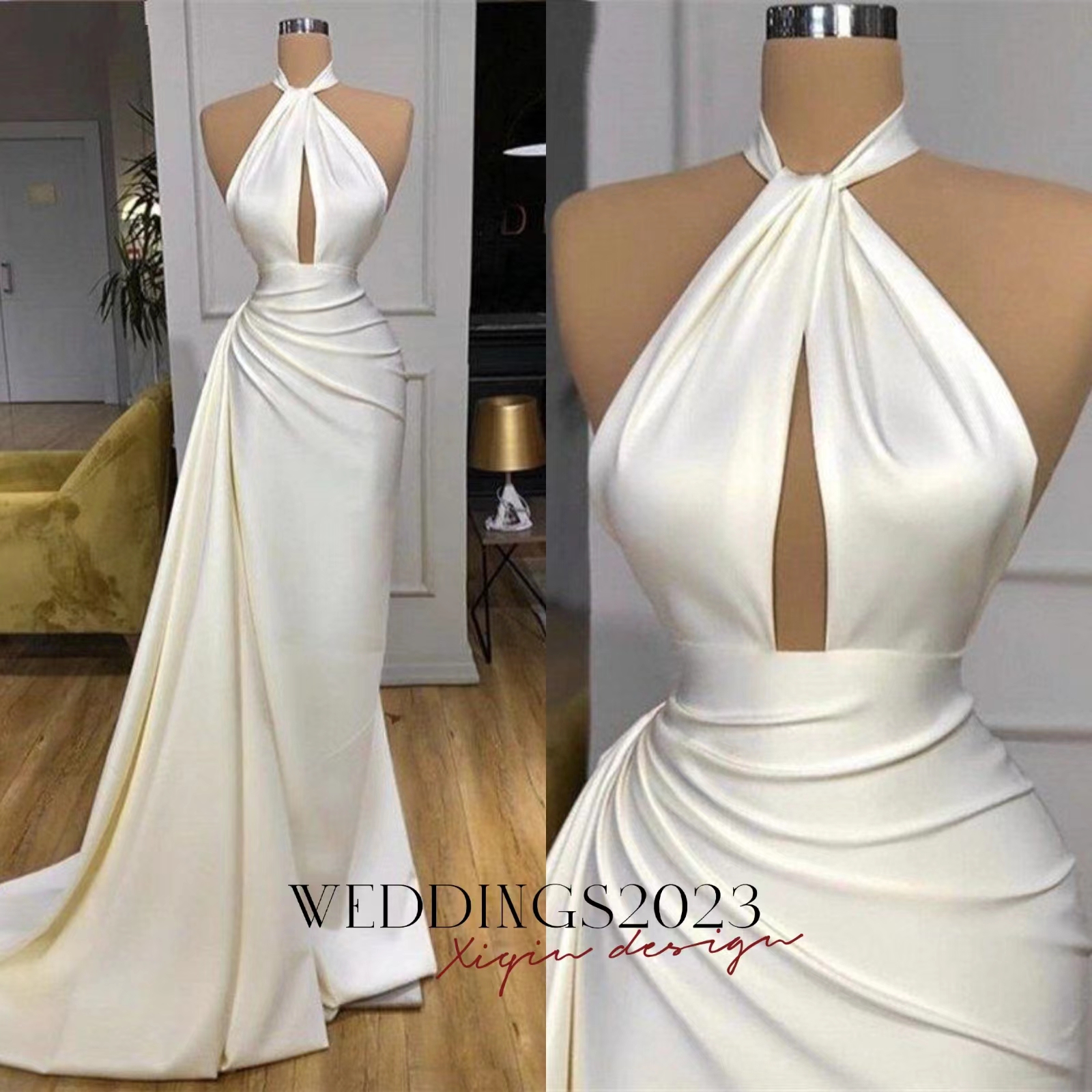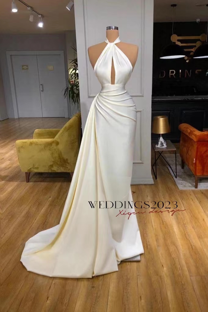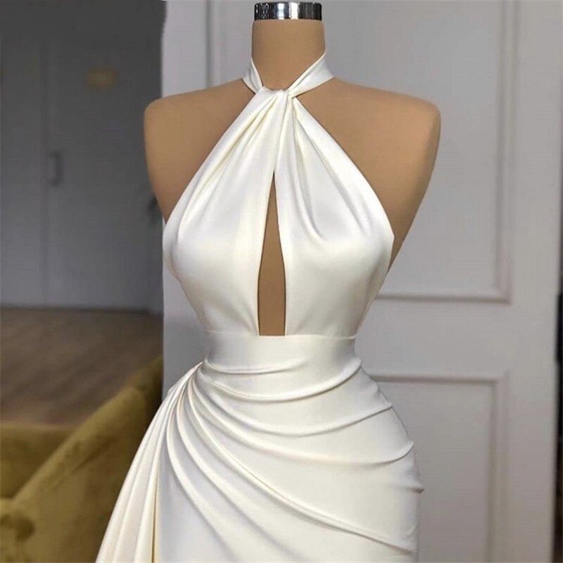 Glam Lvory Evening Dress Halter Satin Mermaid Prom Formal Gown W-56075