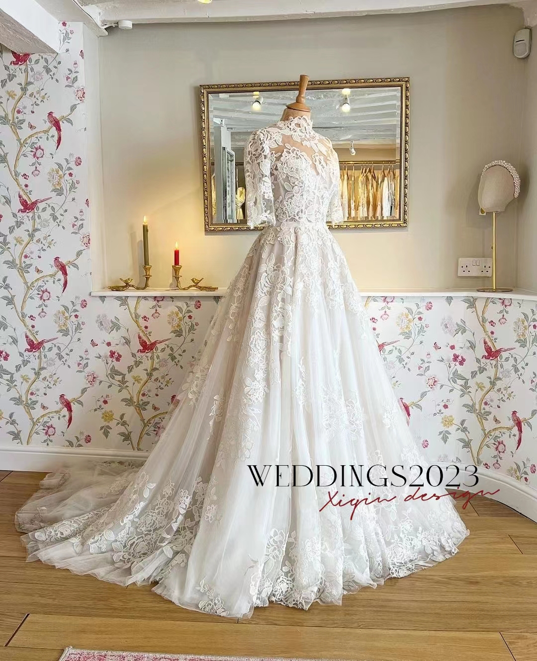 Beautiful A-Line Lace Applique Long Wedding Dress With Long Sleeves Cathedral Train W-56084
