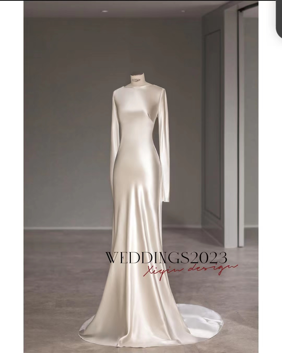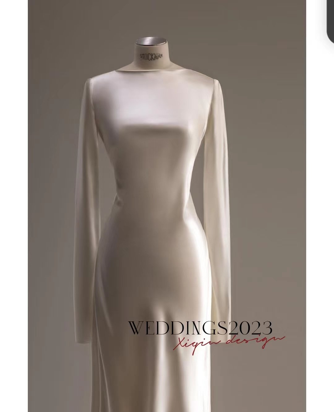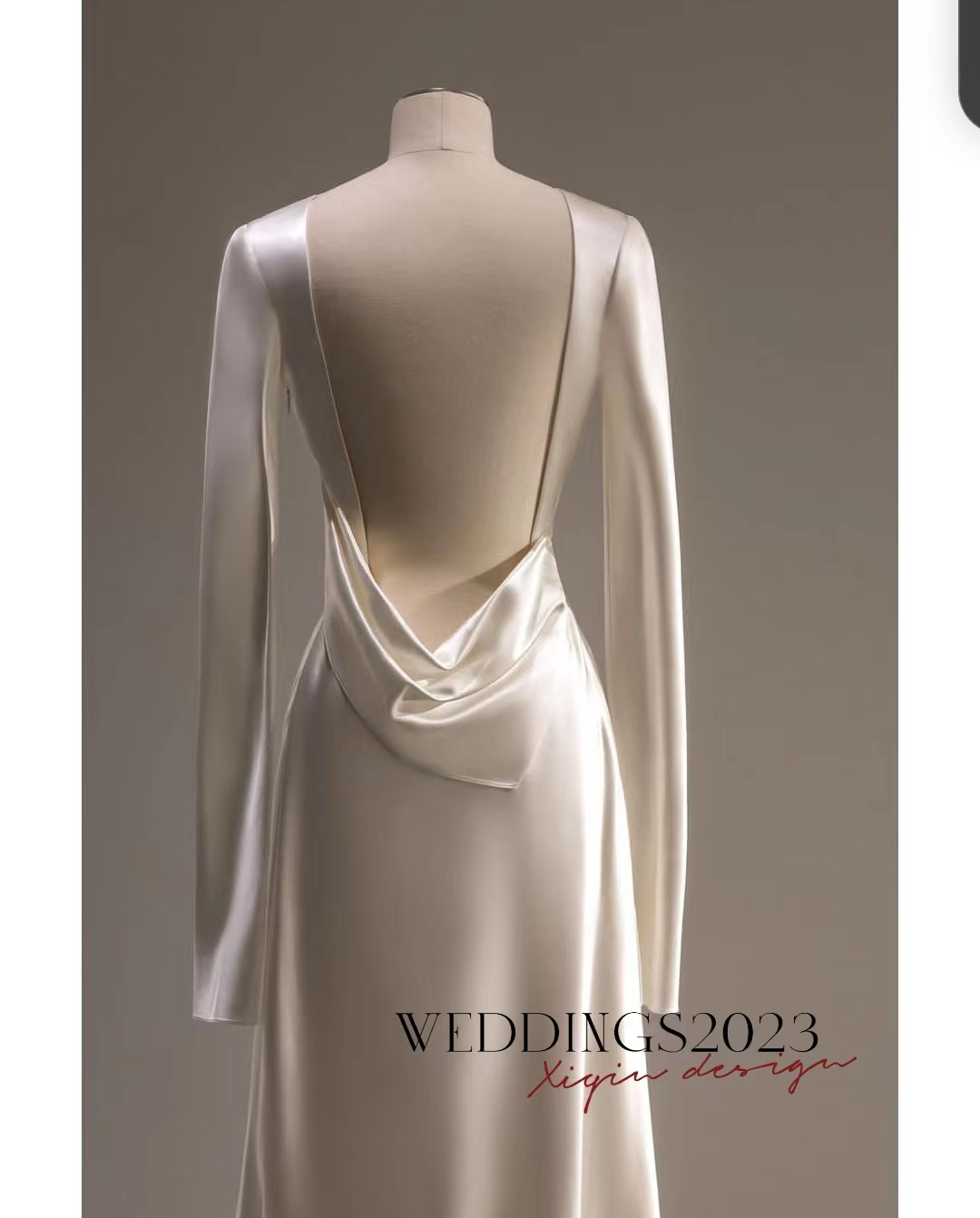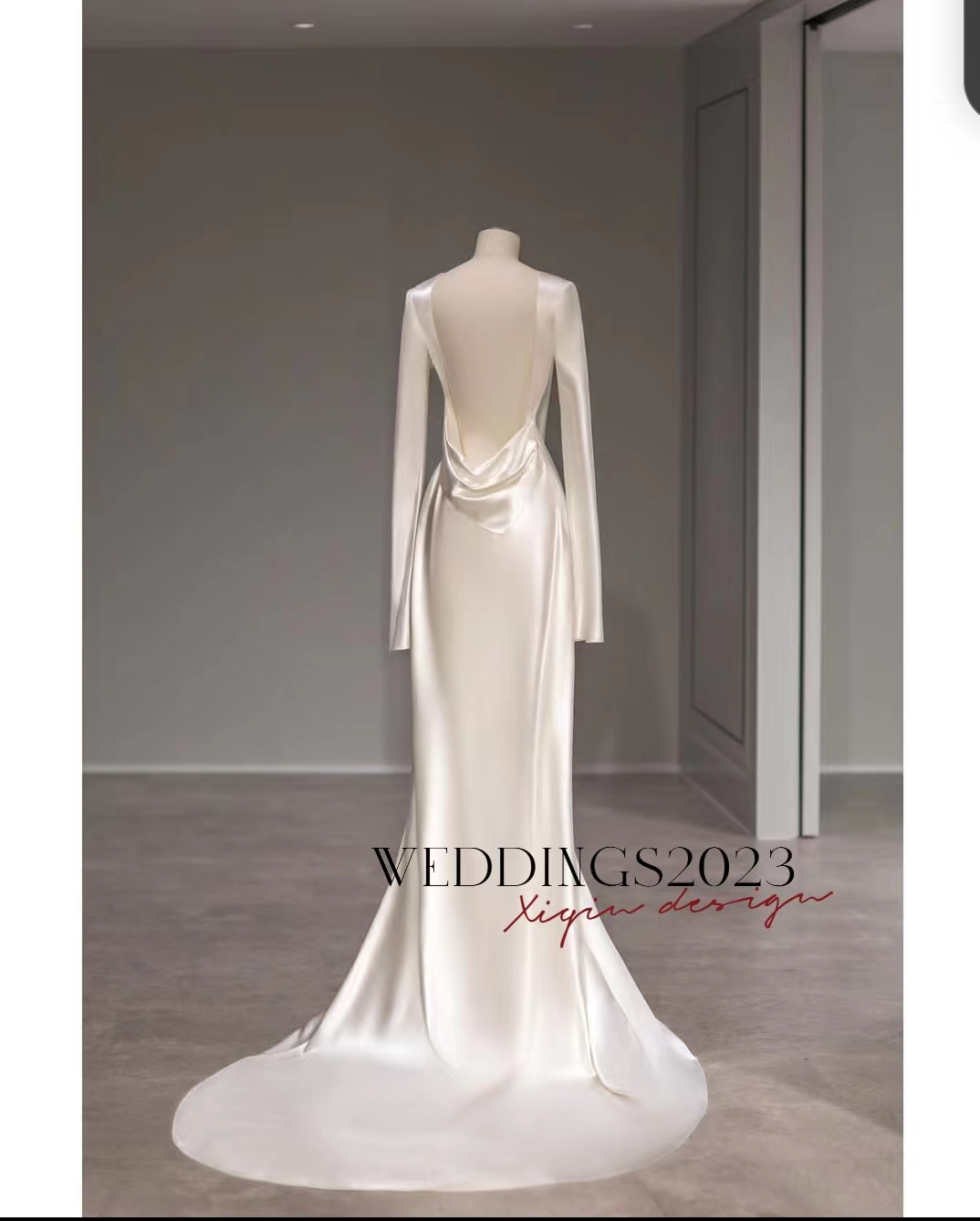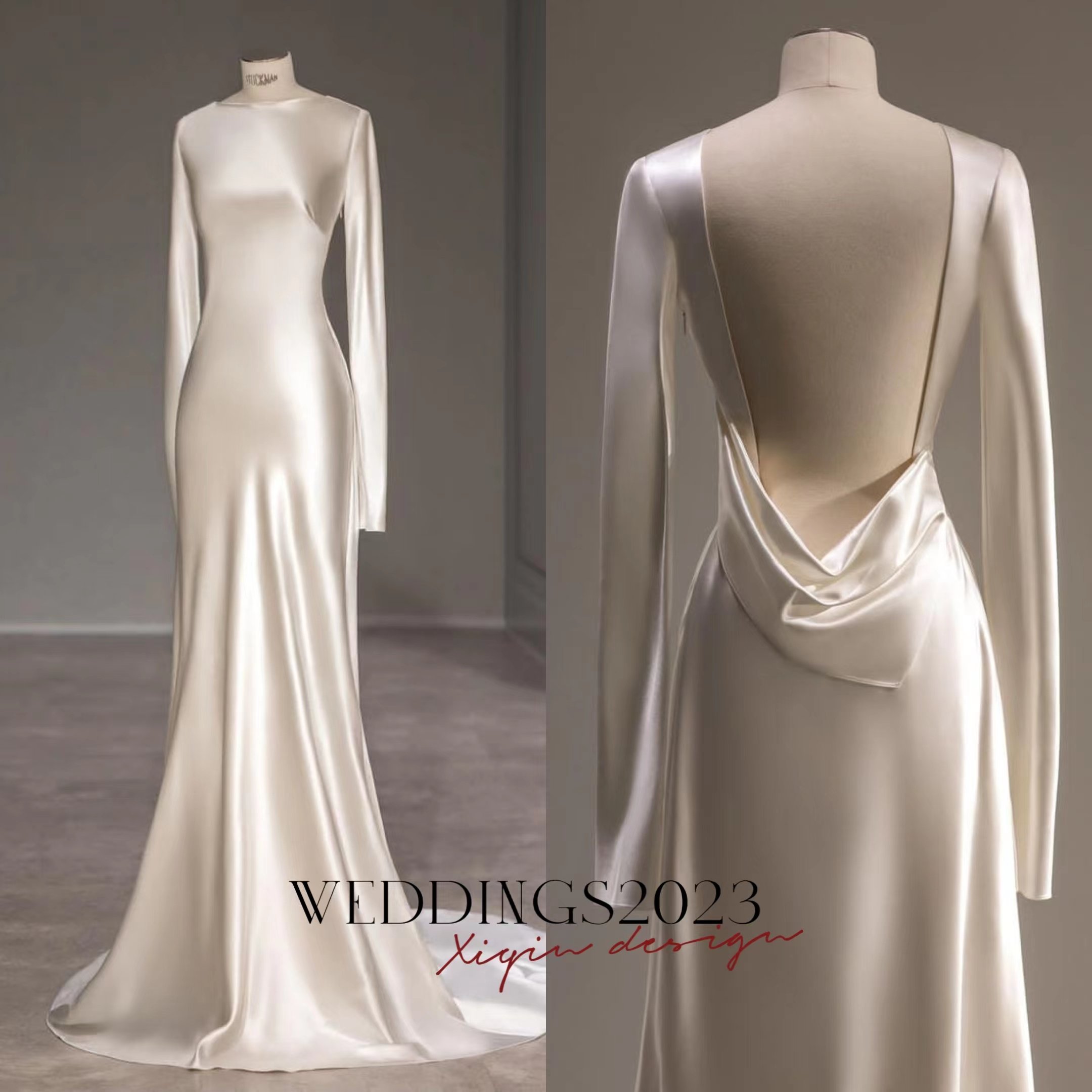 Elegant From Crepe With Long Sleeves And Open Back Satin Wedding Gown Beach Wedding Dress Elopement Dress City Hall Wedding W-51802
