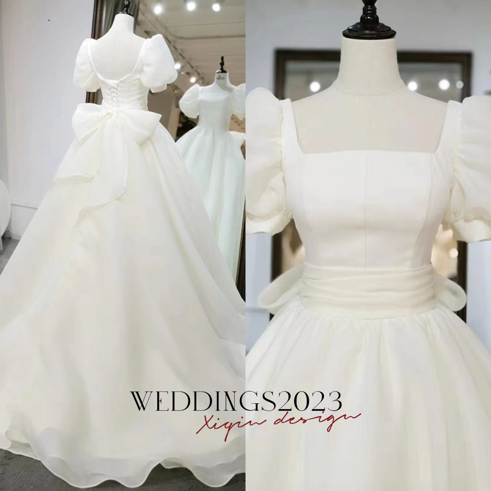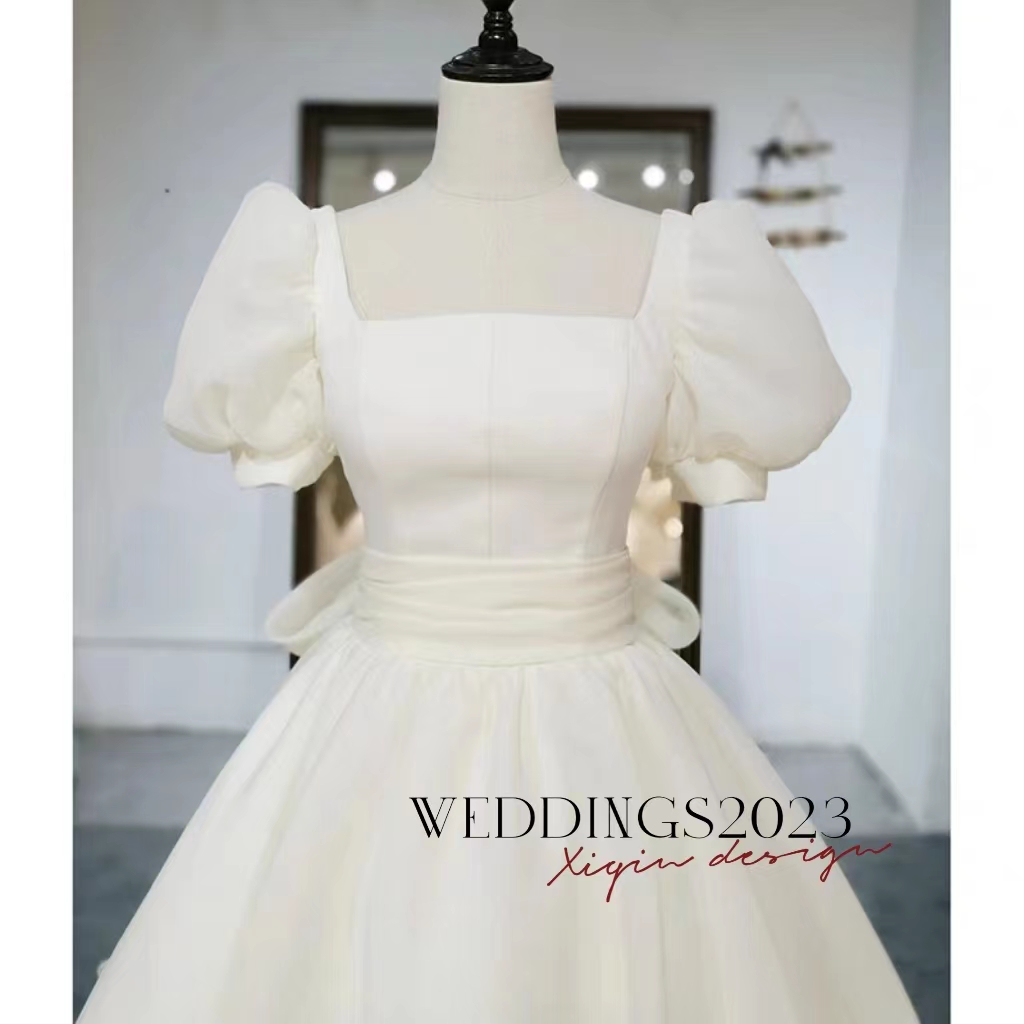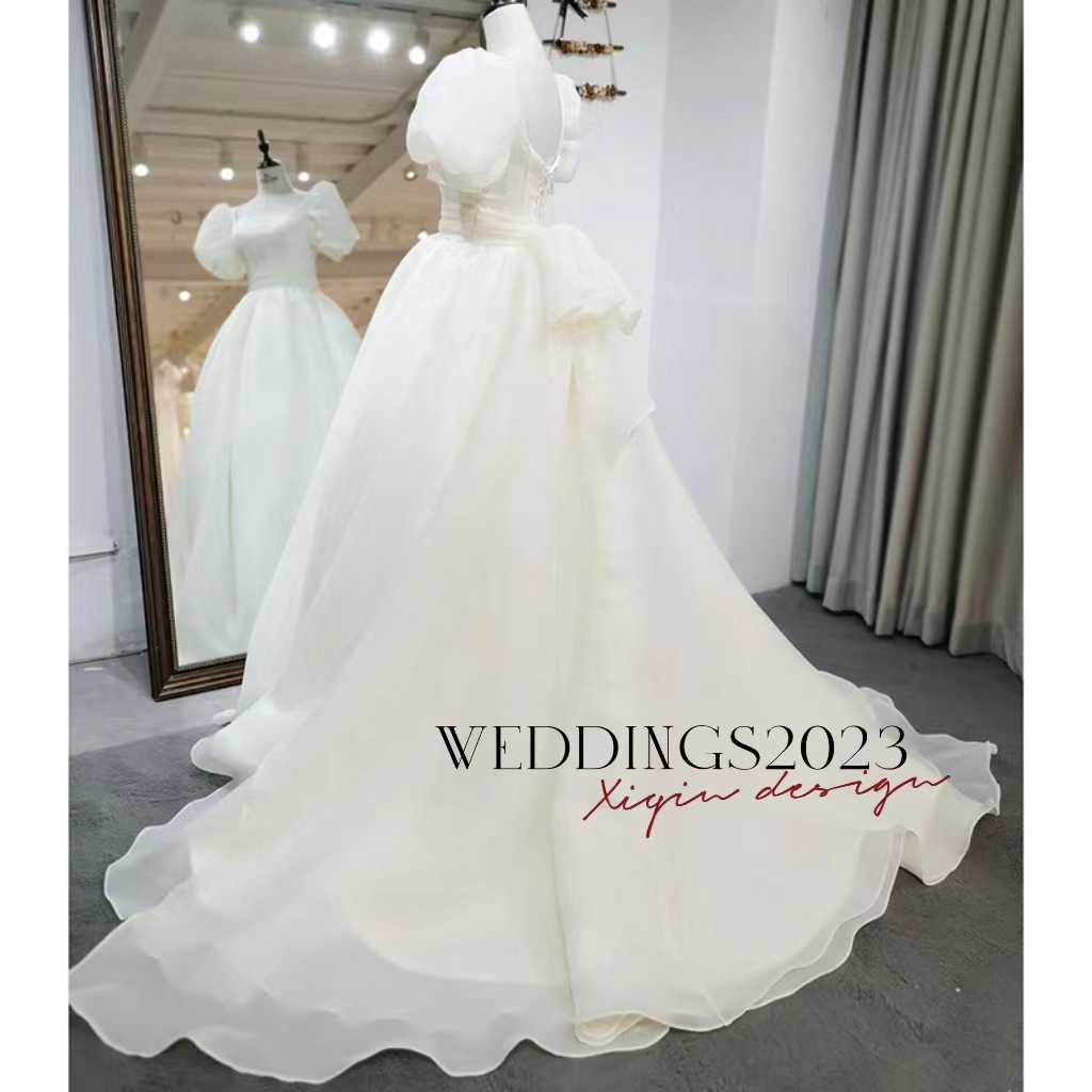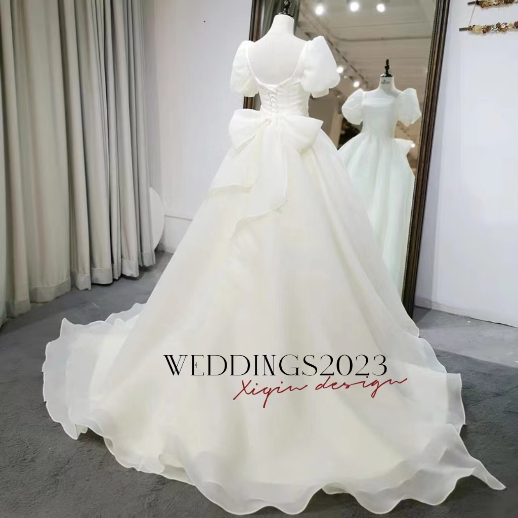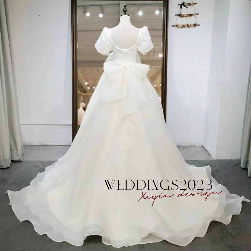 A-Line Puffy Sleeves Organza Wedding Dress Backless With Bow Chapel Train Lace-Up Gown Bridal Dress W-51816