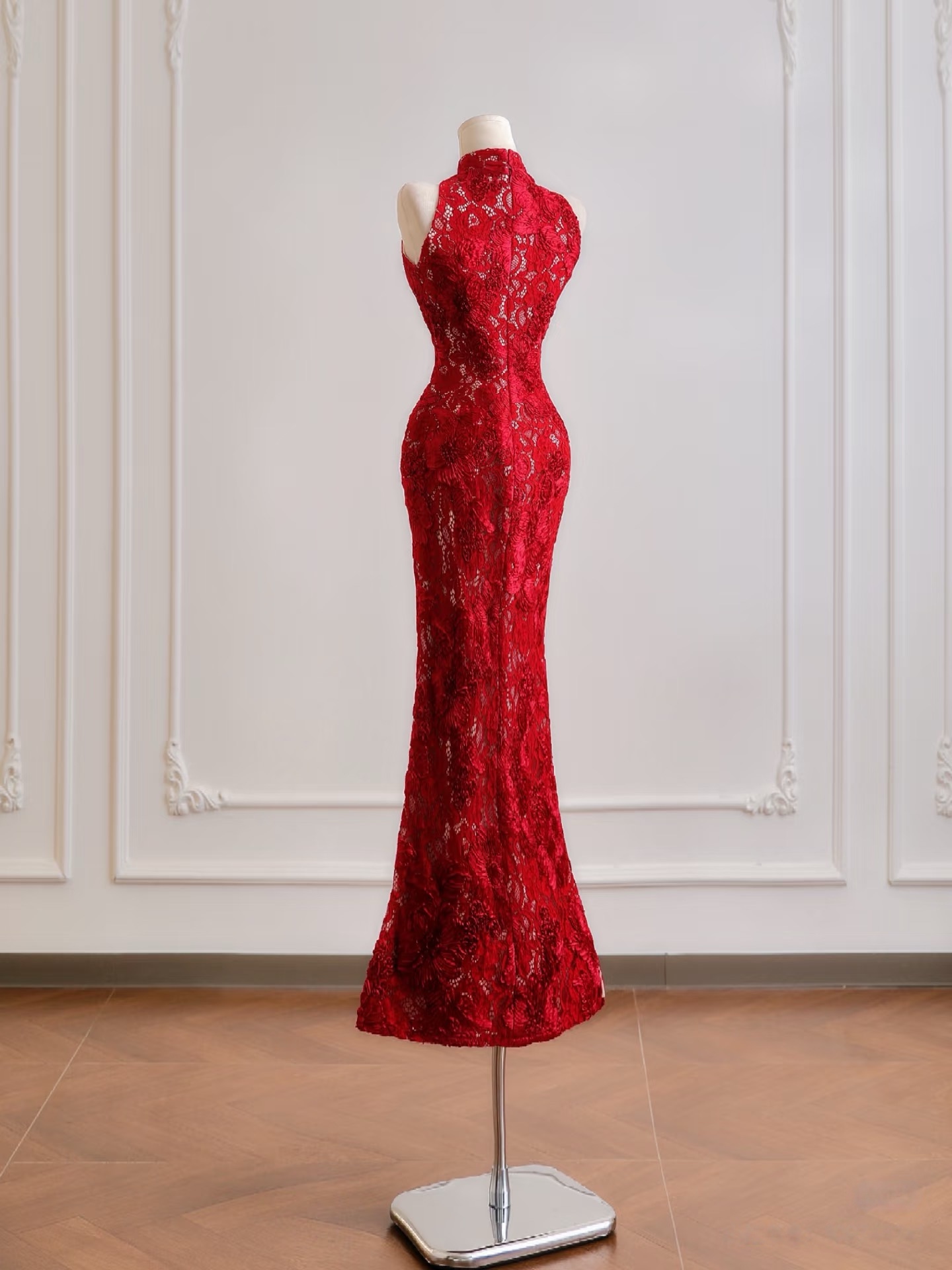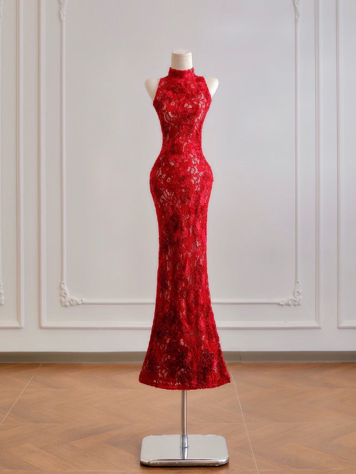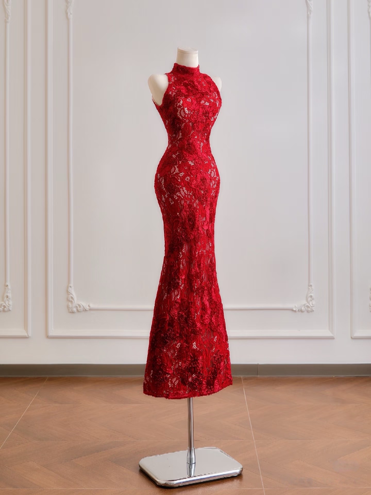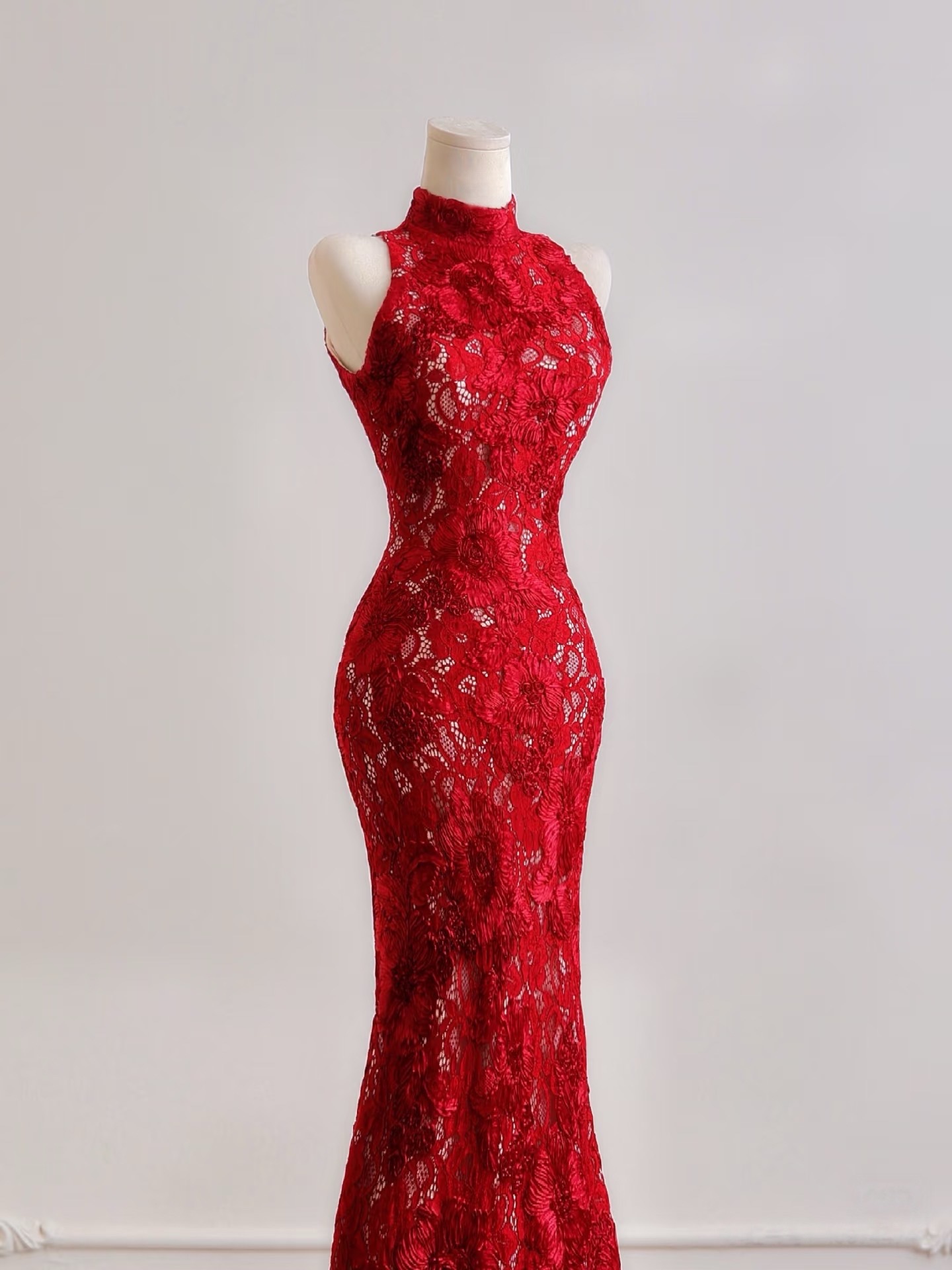 High Neck Lace Sleeveless Mermaid Floor Length Zipper Back Prom Dress