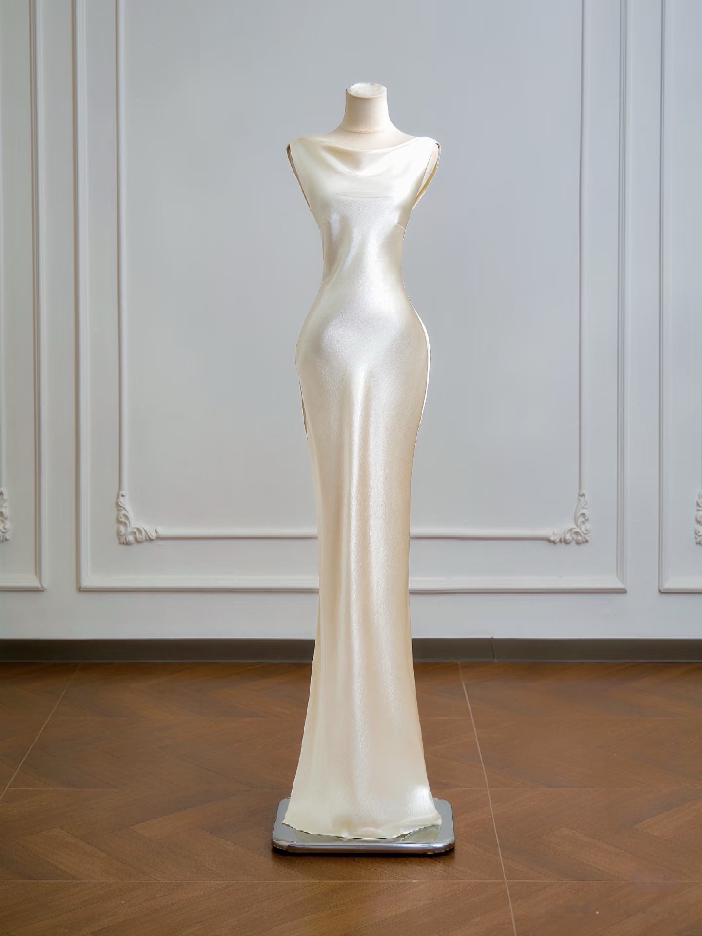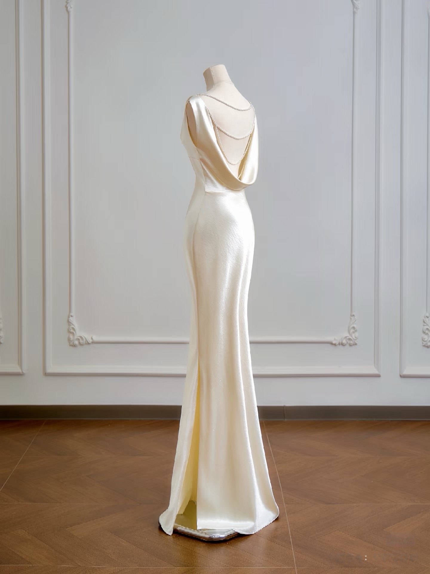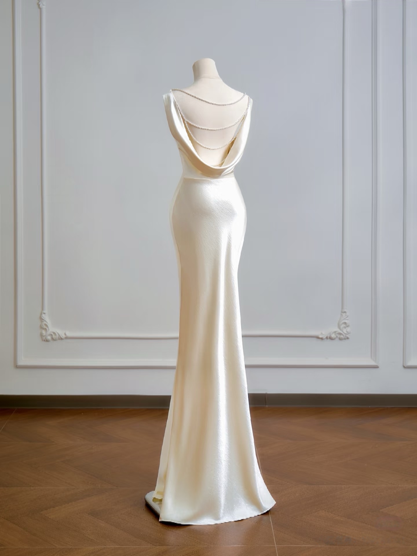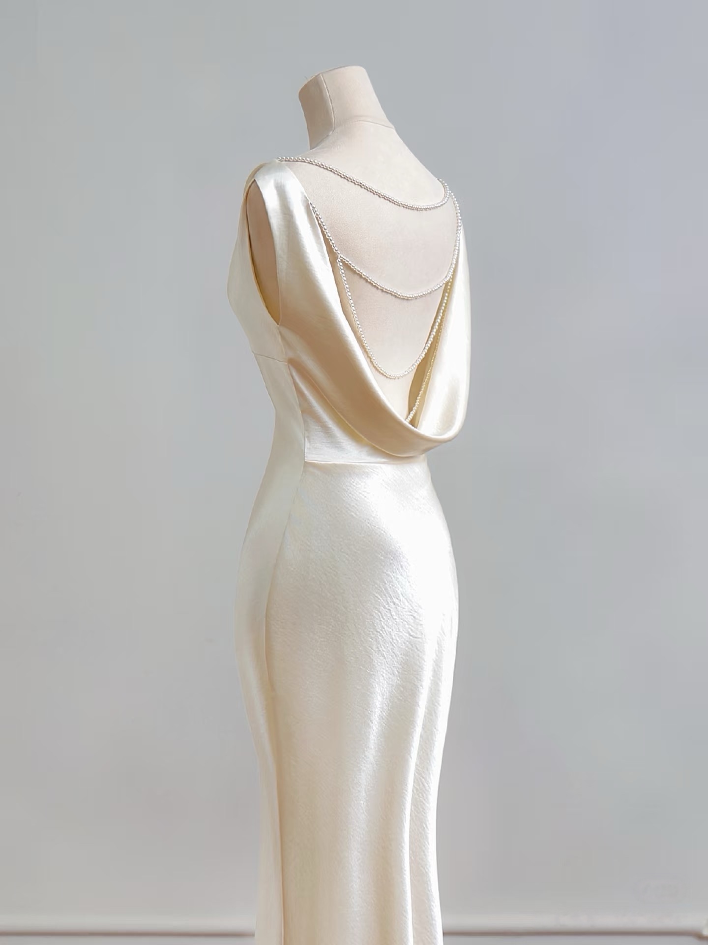 Ivory Sleeveless Mermaid Floor Length Backless Back with Pearl Prom Dress