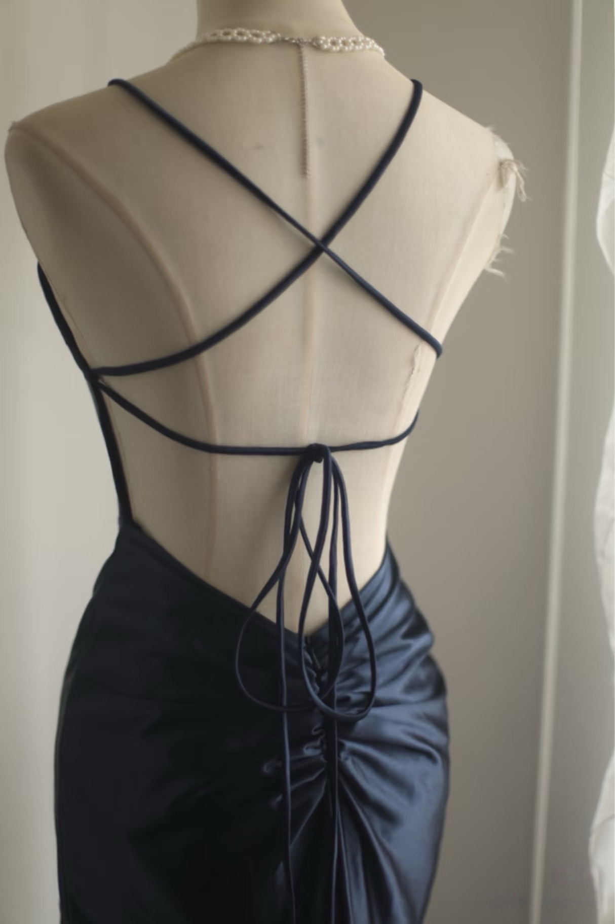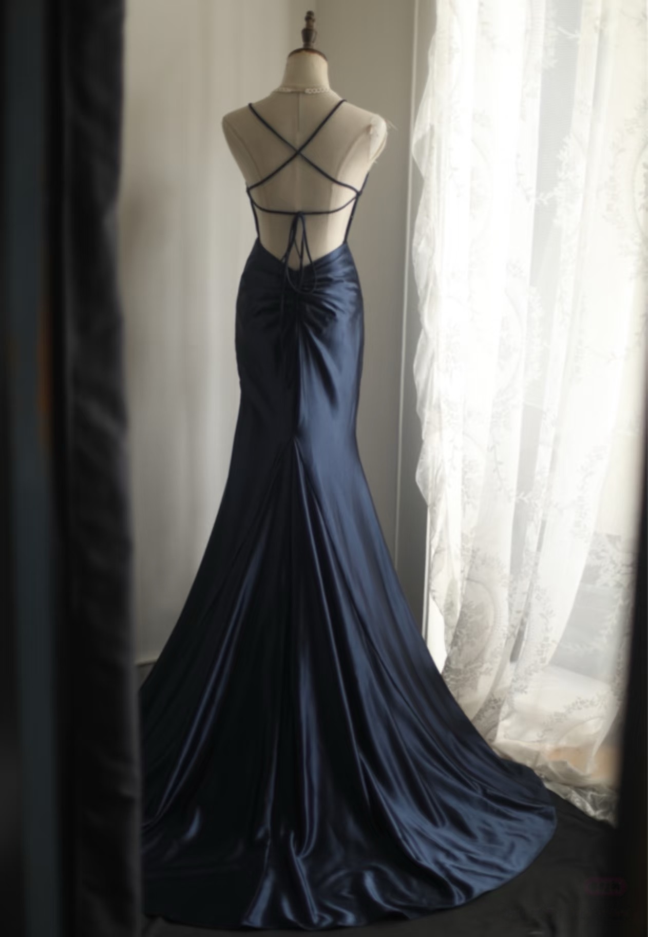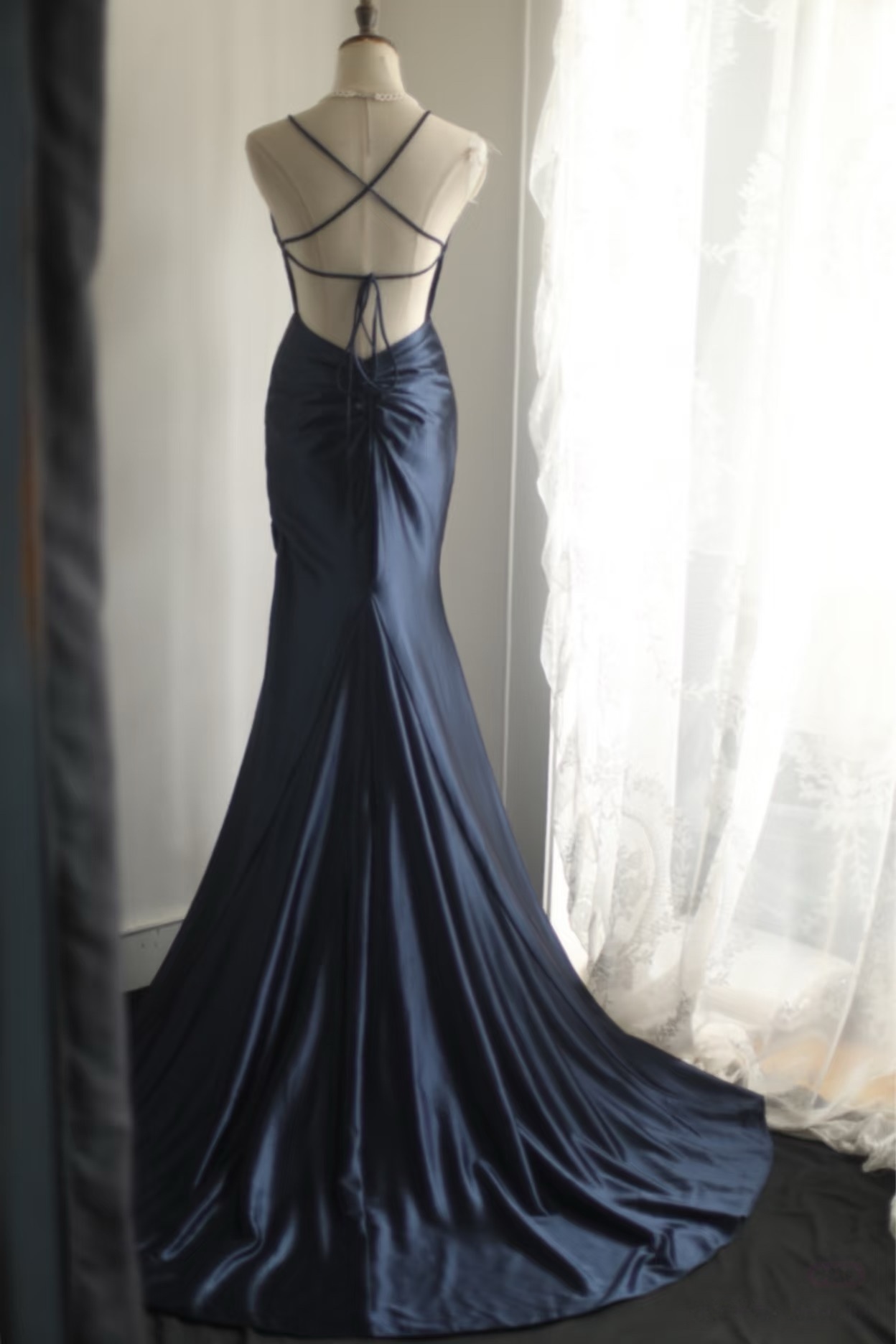 Navy Blue V Neck Mermaid Backless Back Lace up Satin Prom Dresses