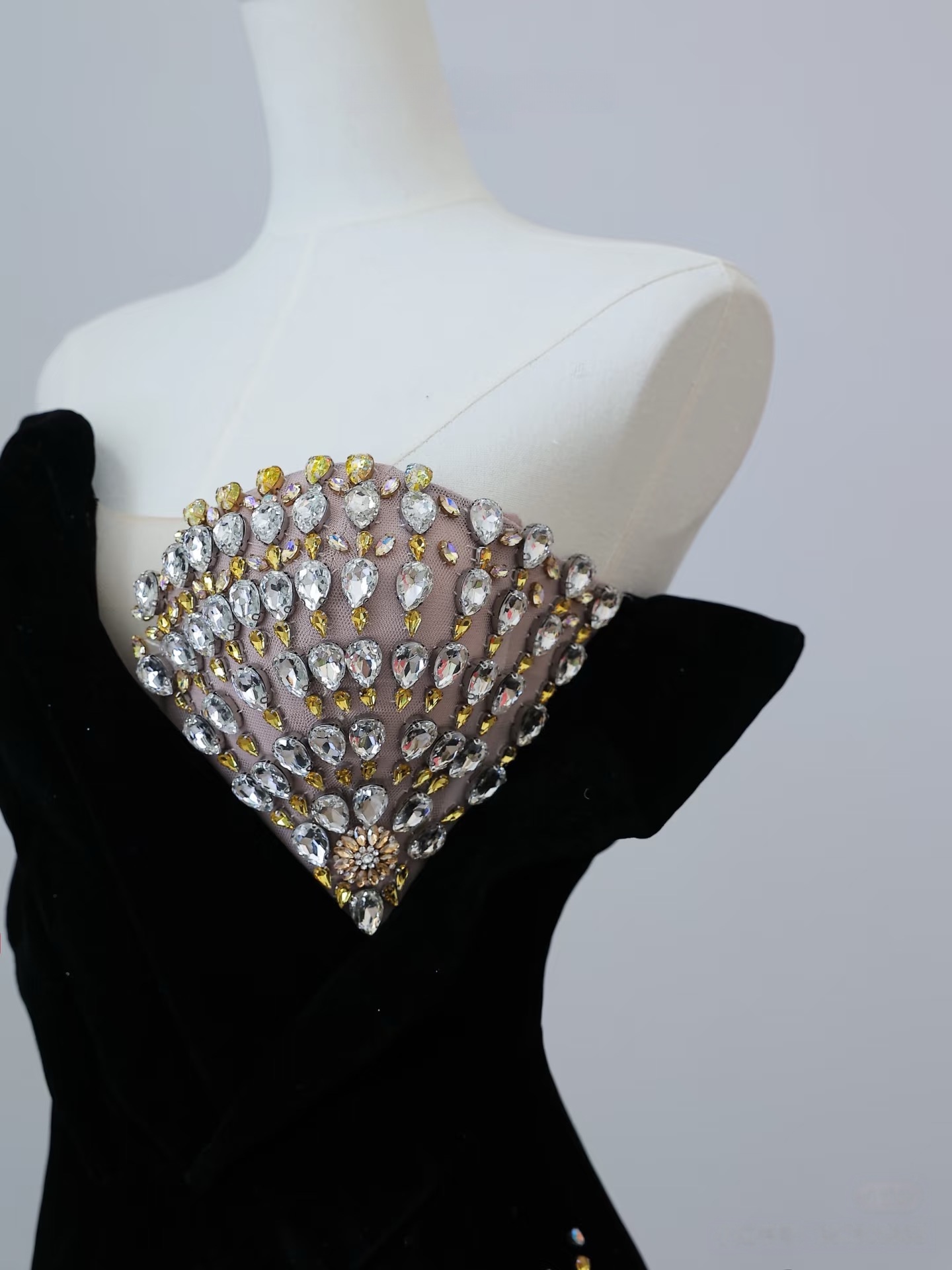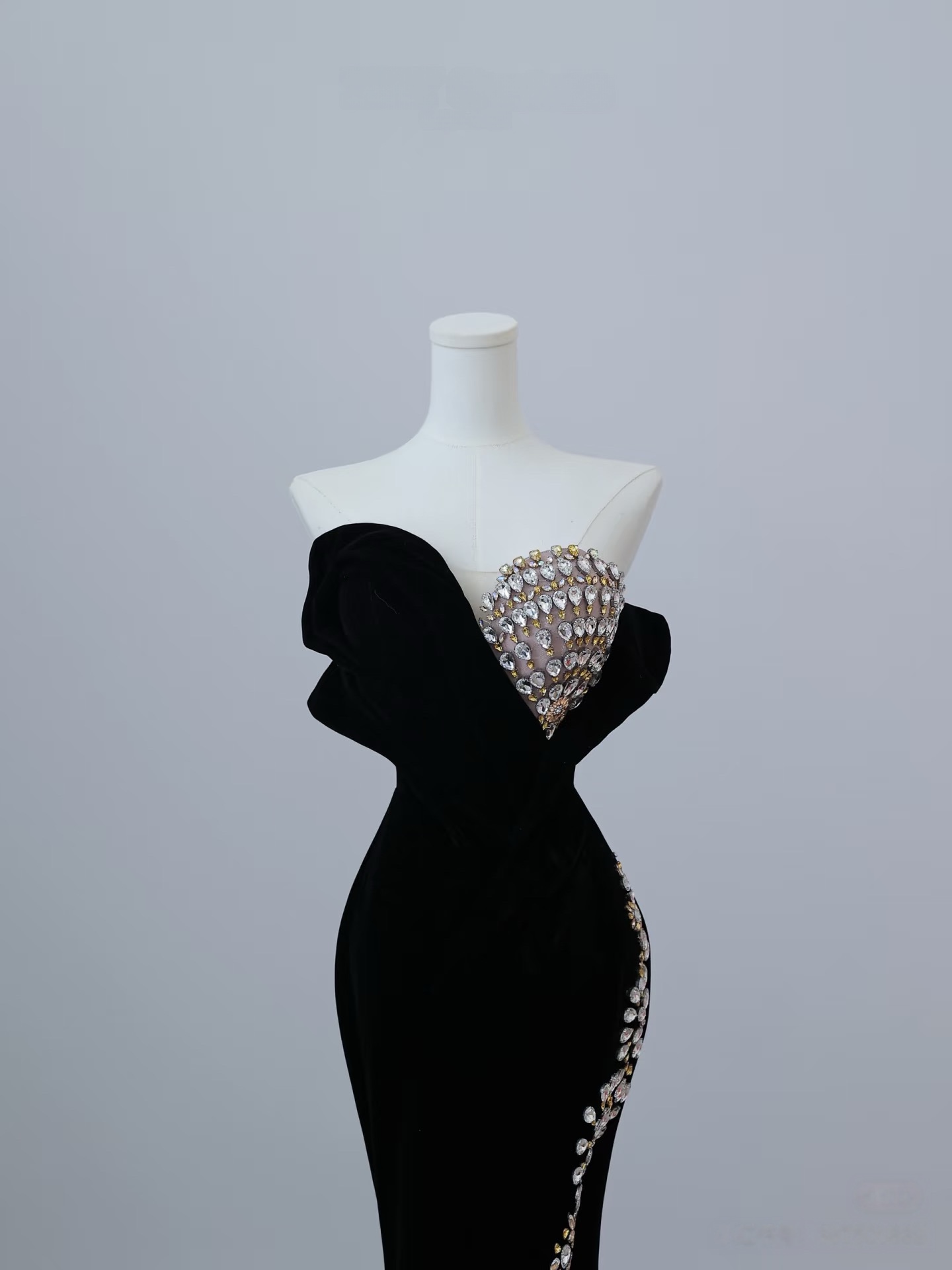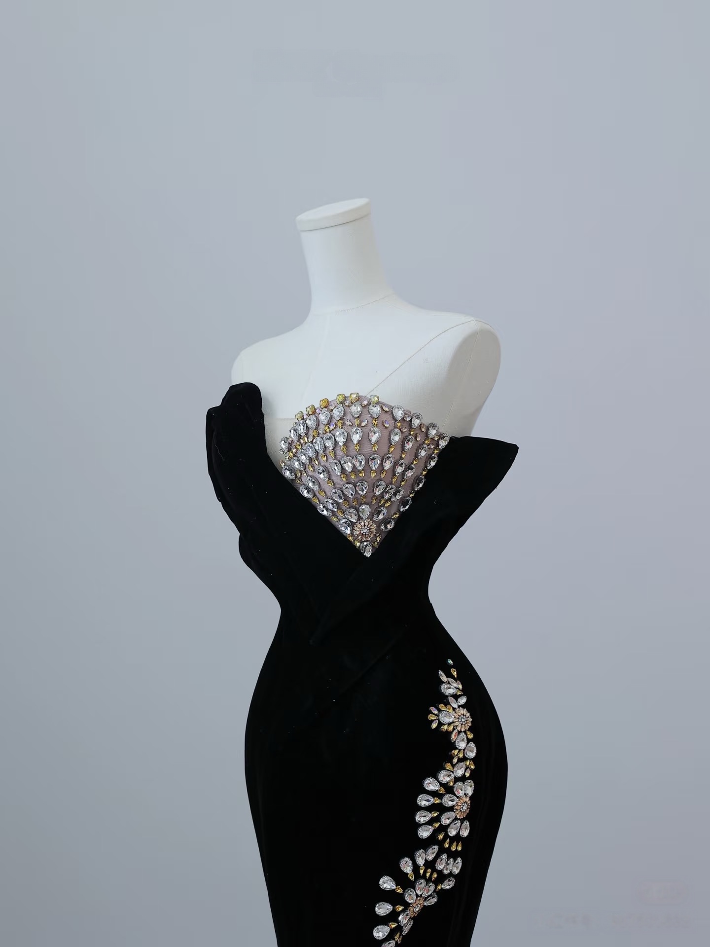 Sexy Black Strpless Velvet Rhinestones Mermaid Floor Length Prom Dress