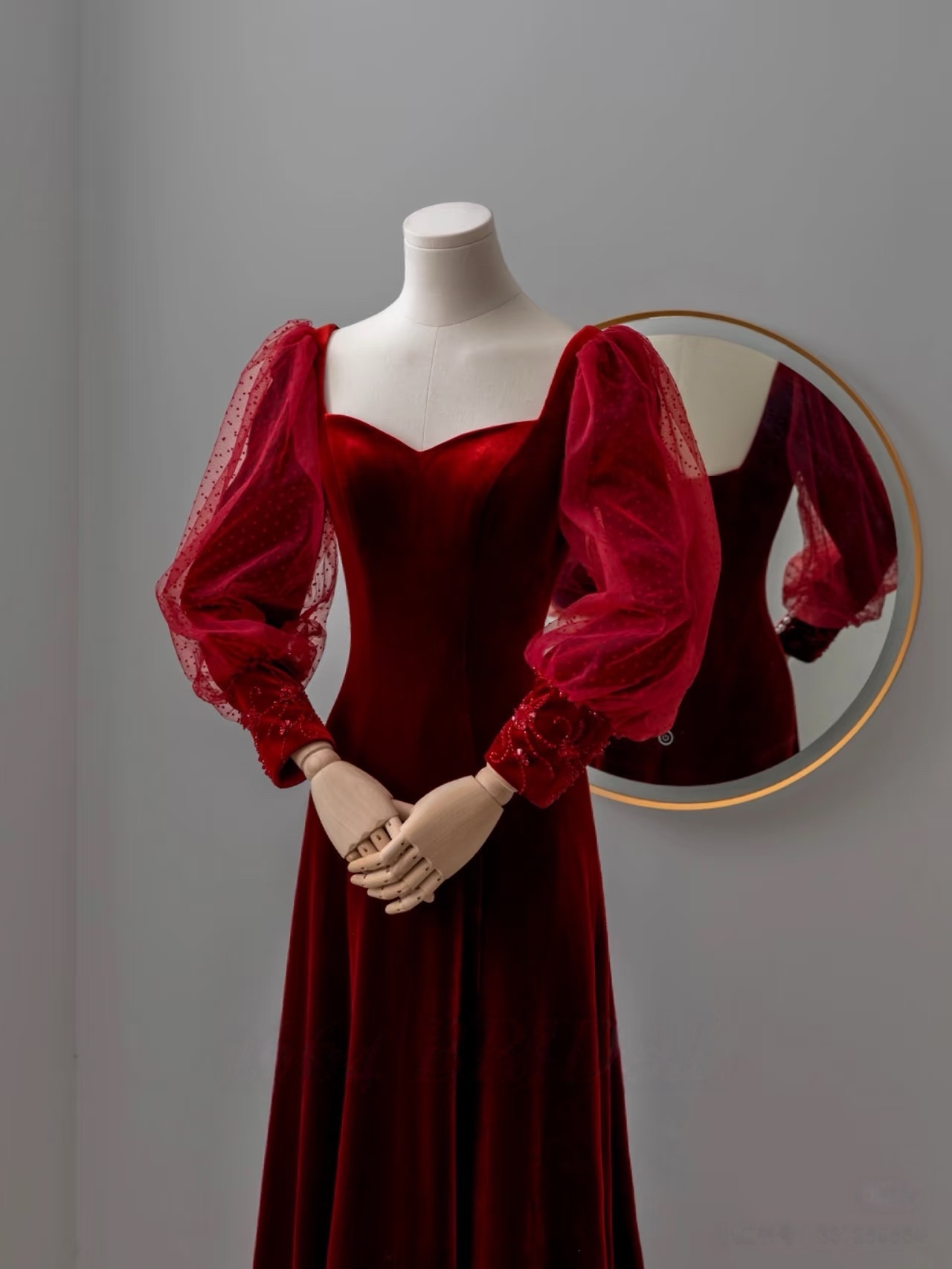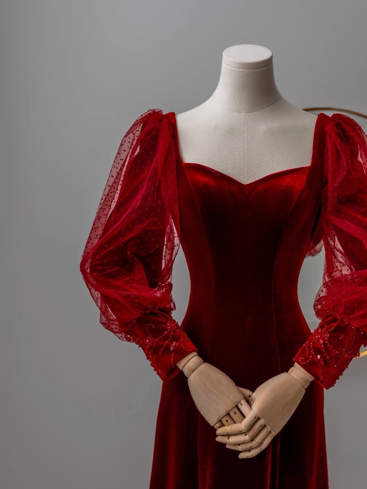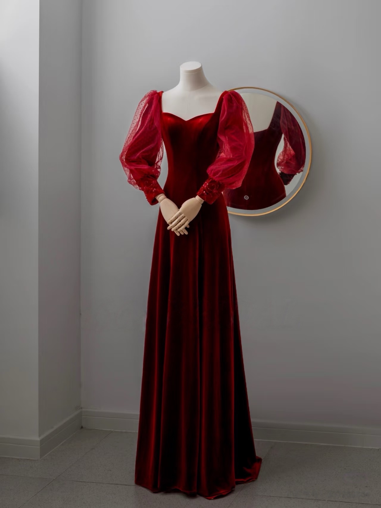 Burgundy Velvet Elegant Long Sleeve Wedding Party Vestidos Square Collor Slim Waist Mesh Design Prom Dresses Formal Robe Evening Dress