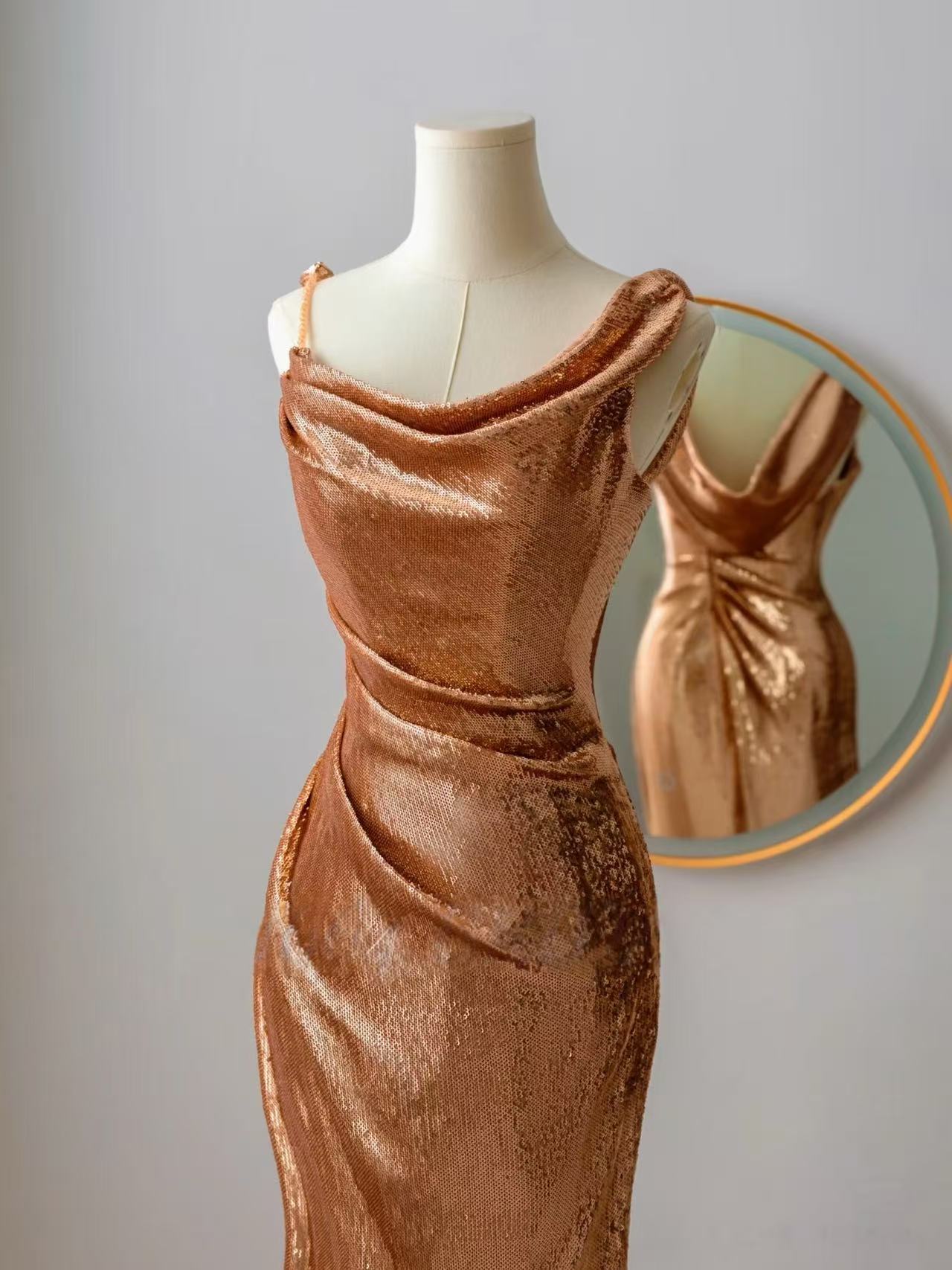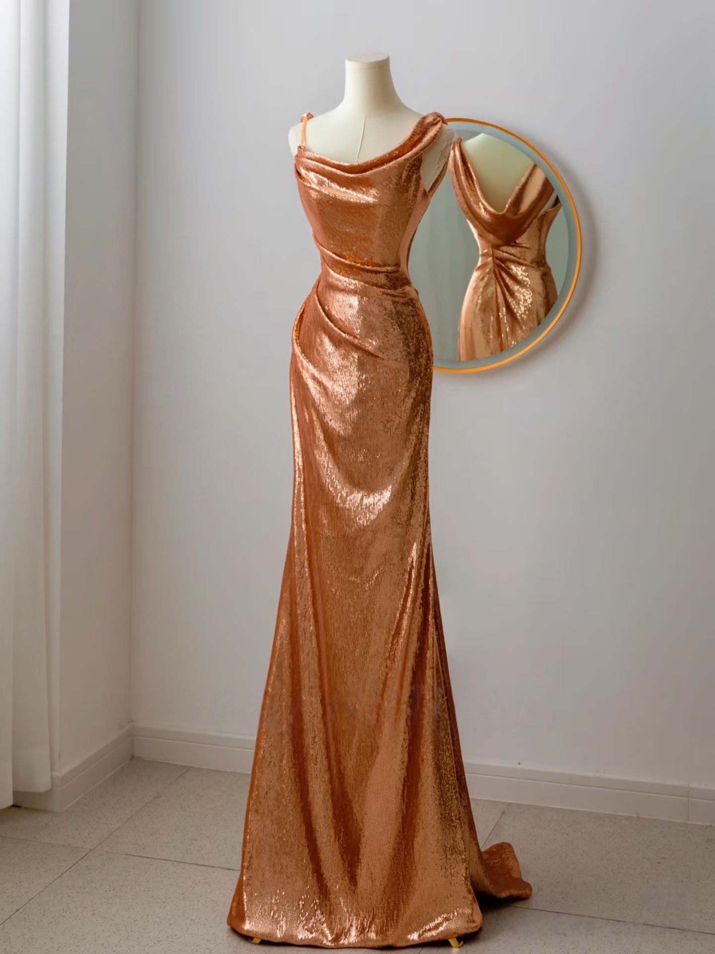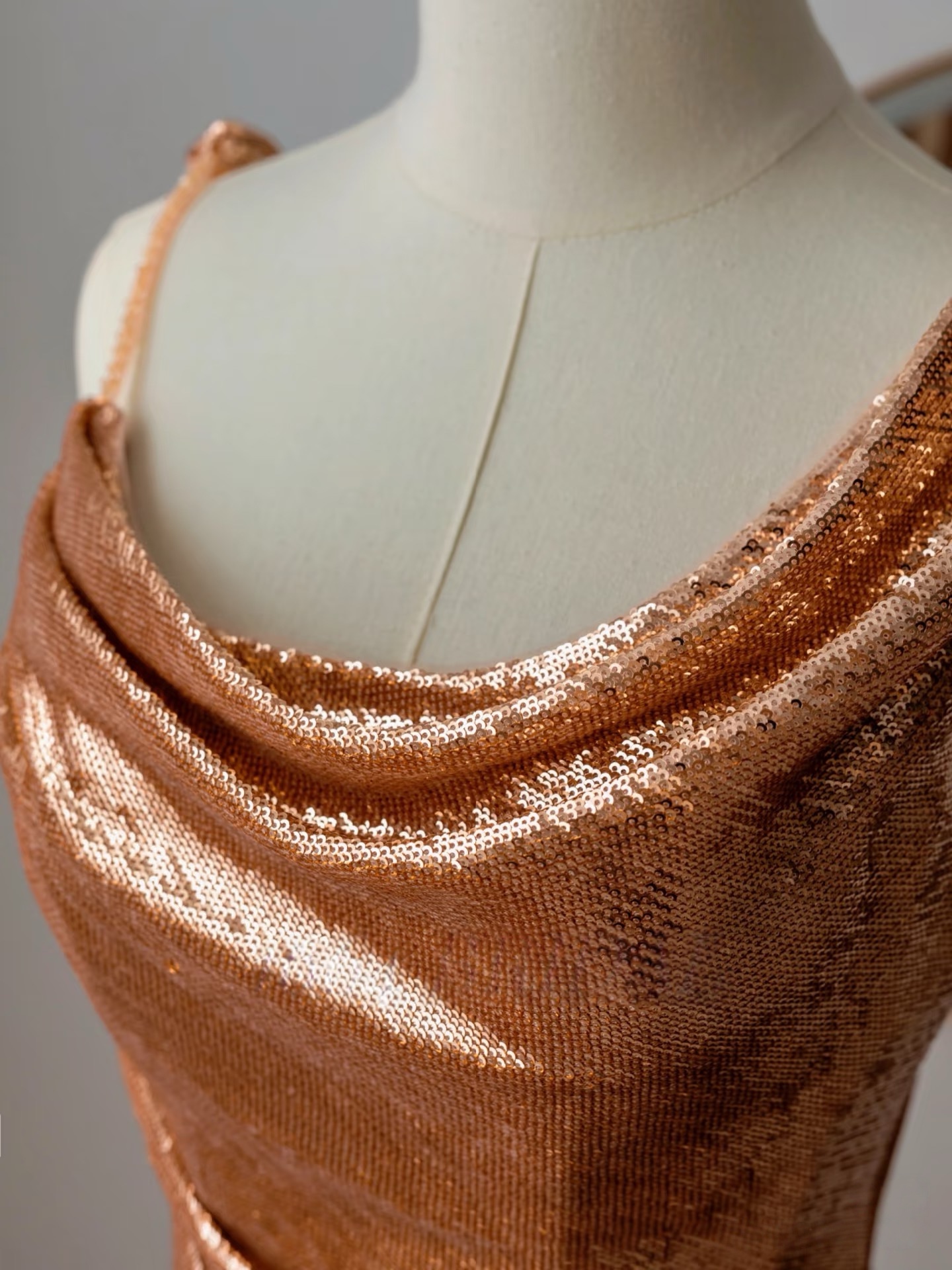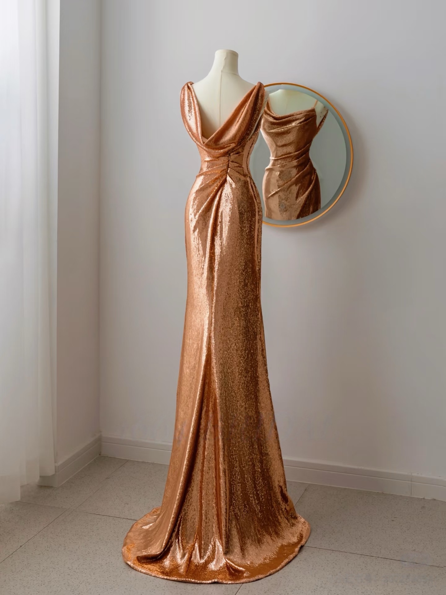 Gold Sparkly Sequins with Open Cowl Back Formal Prom Evening Dress