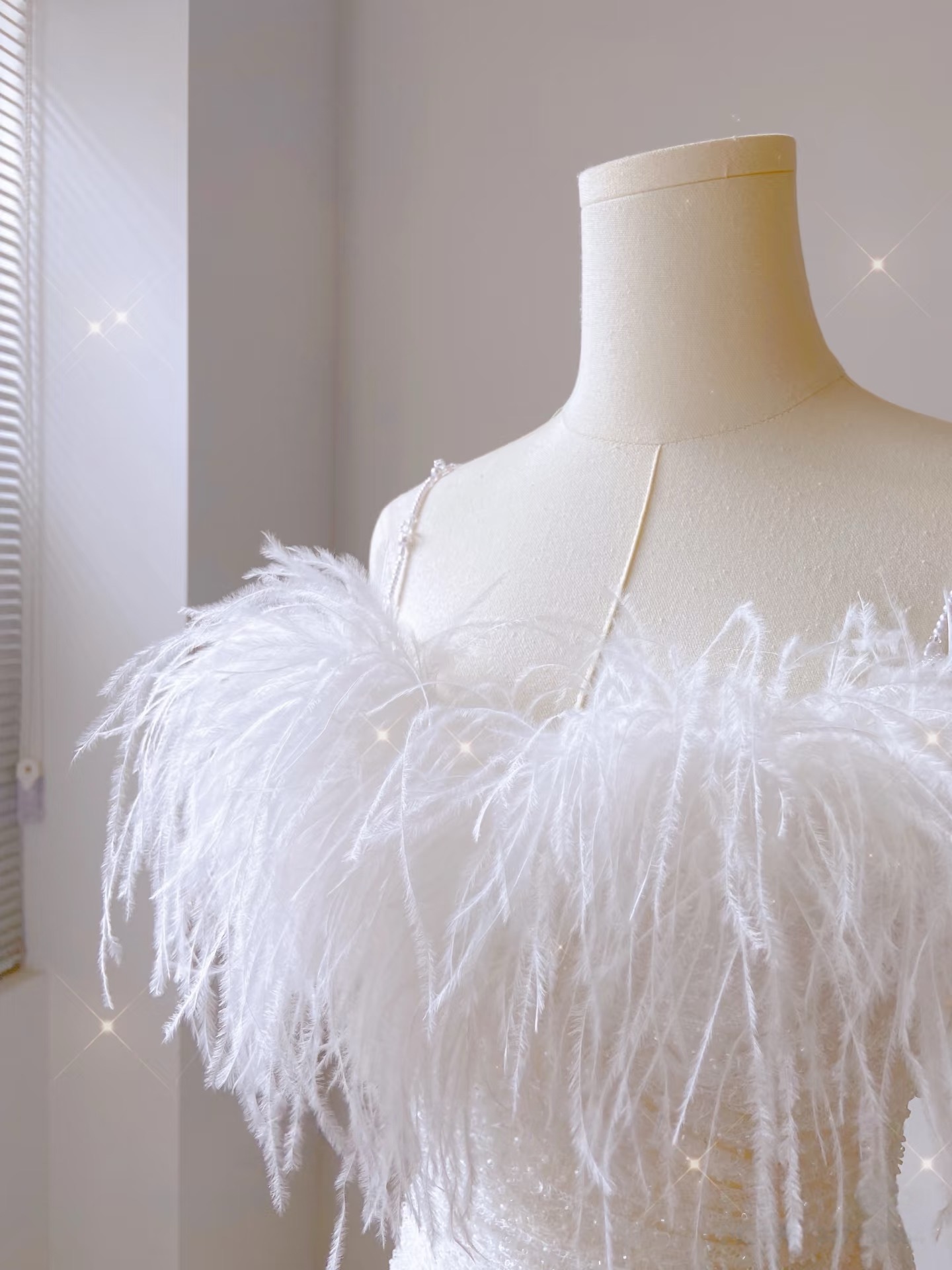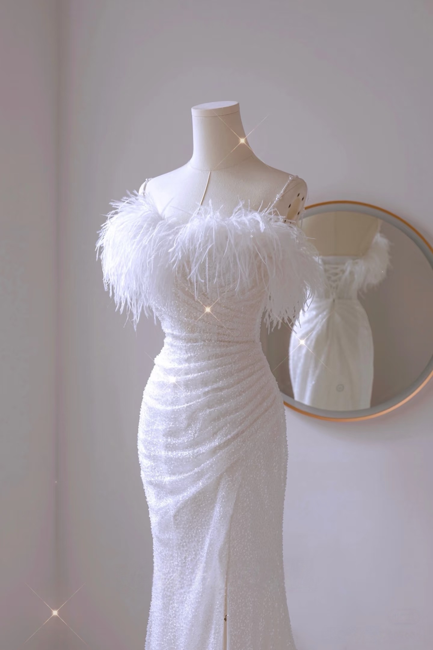 Ivory Mermaid Feather wedding dress, Modern bridal gown with sequin, Strapless bridal robe