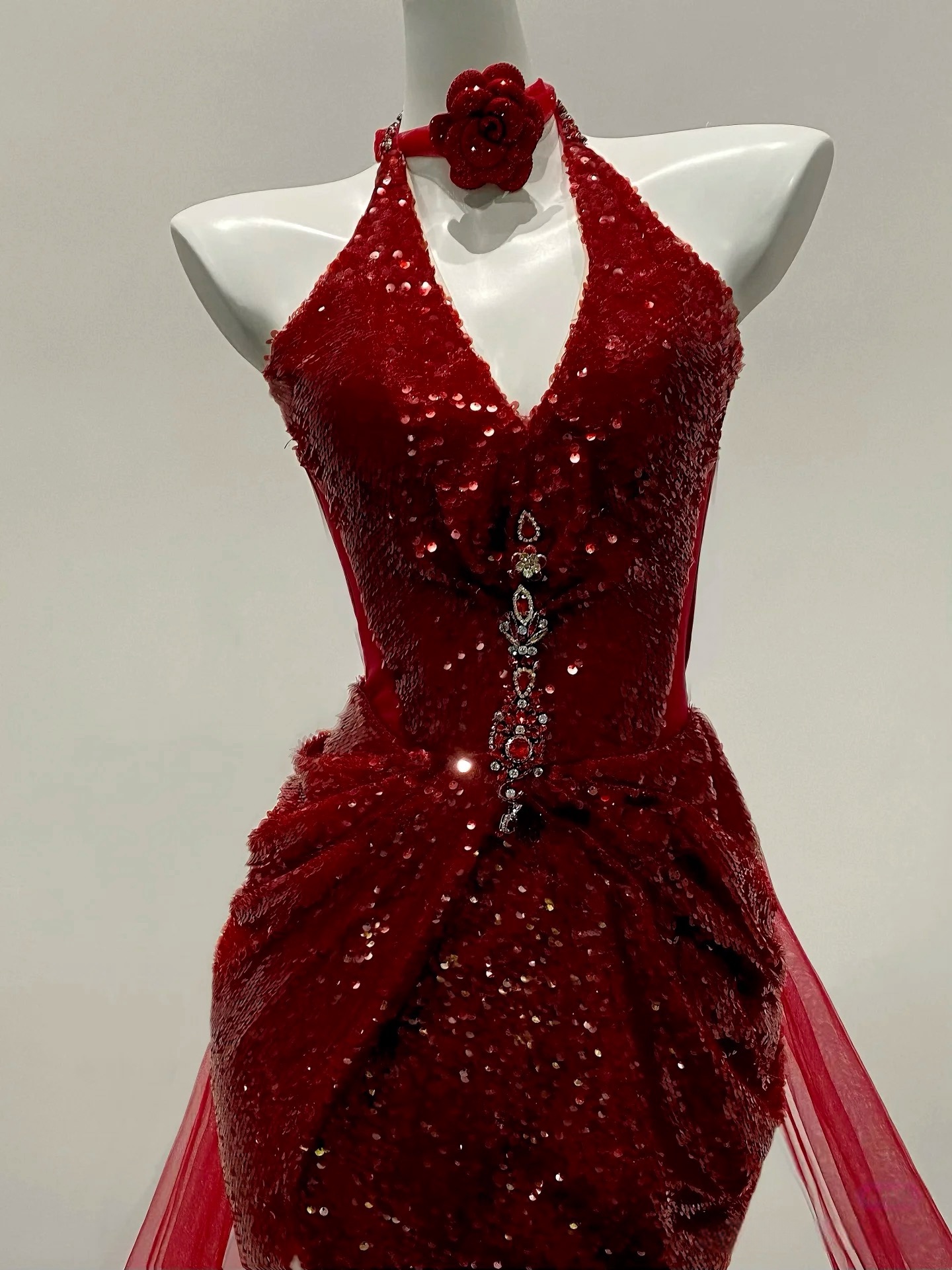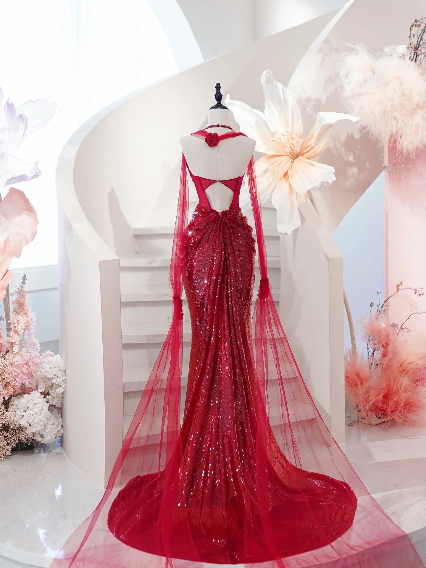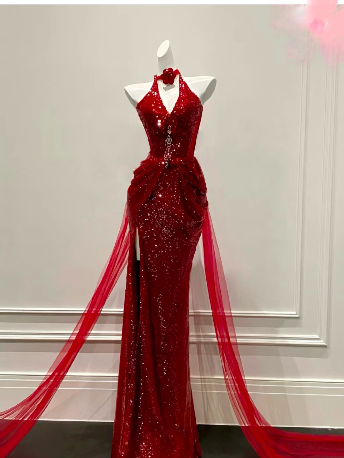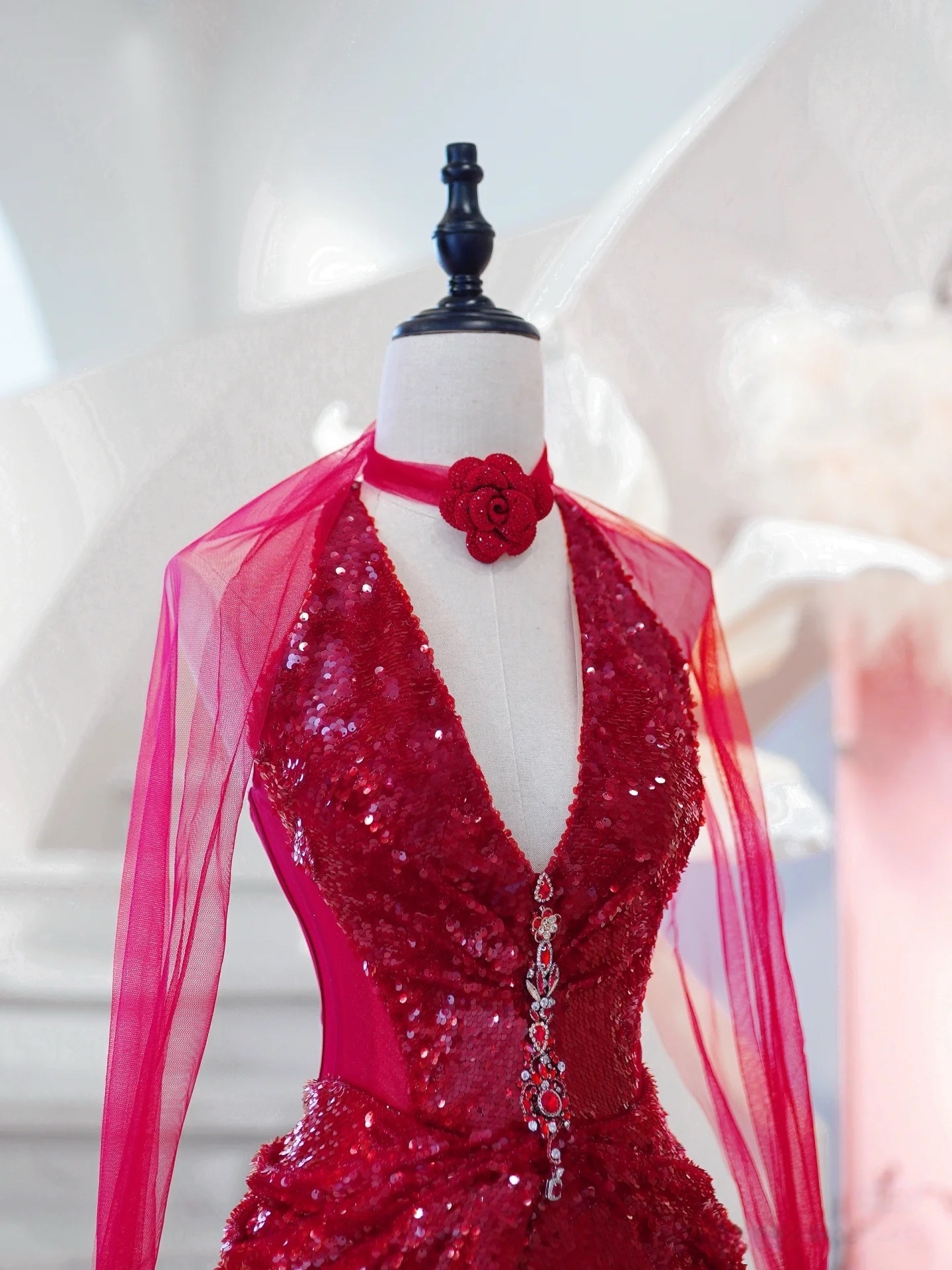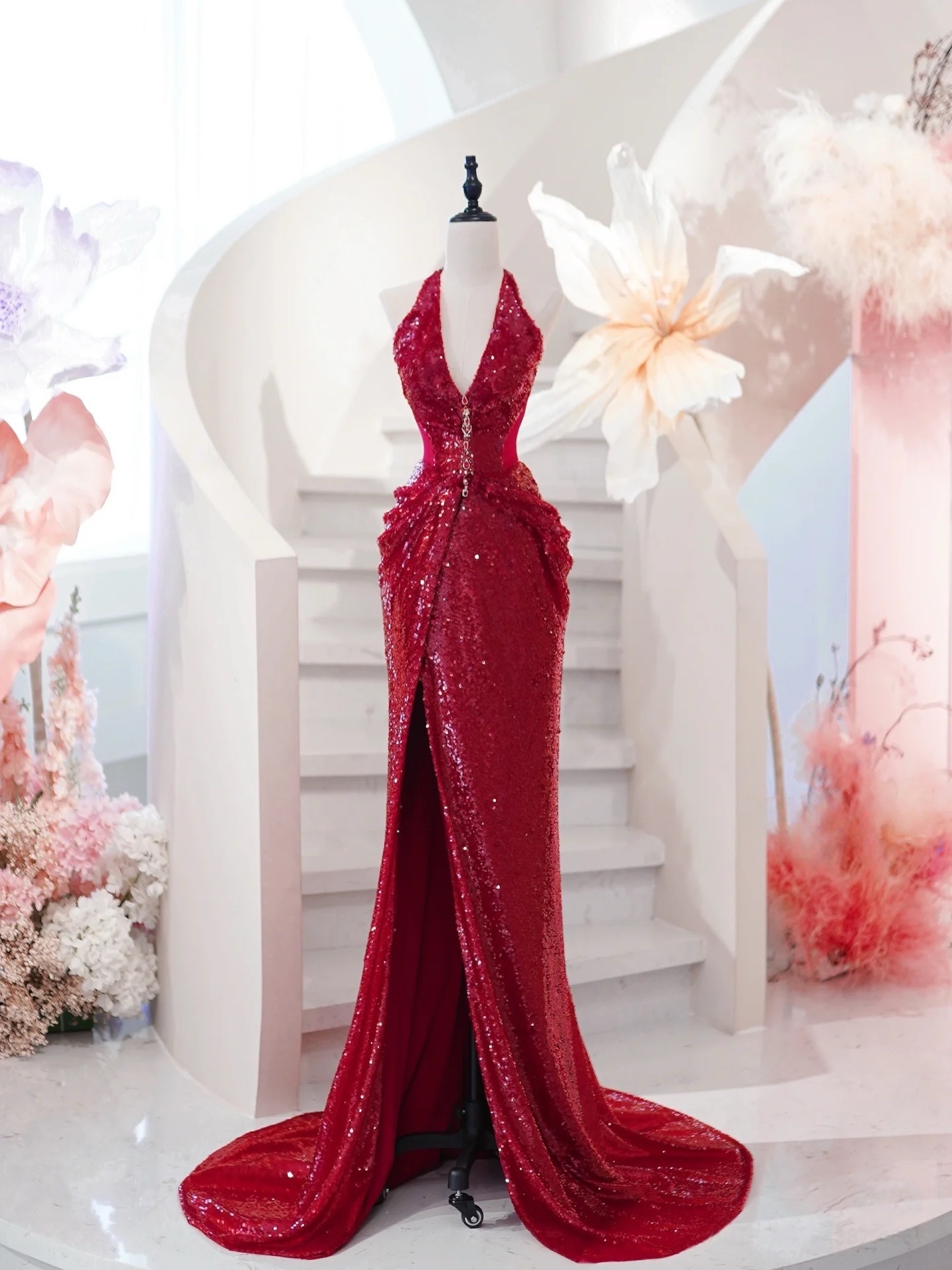 Burgundy Deep V Neck Silt Mermaid Glitter Tulle Galaxy Flowing Ball Gown Evening Dress