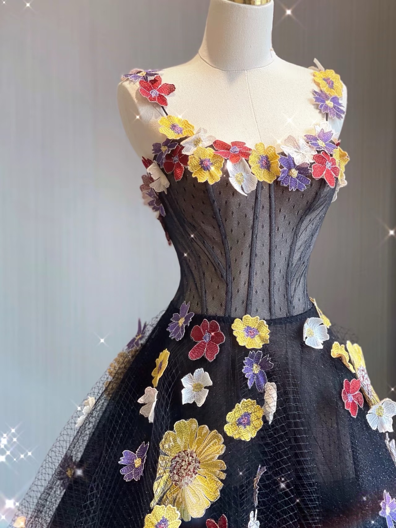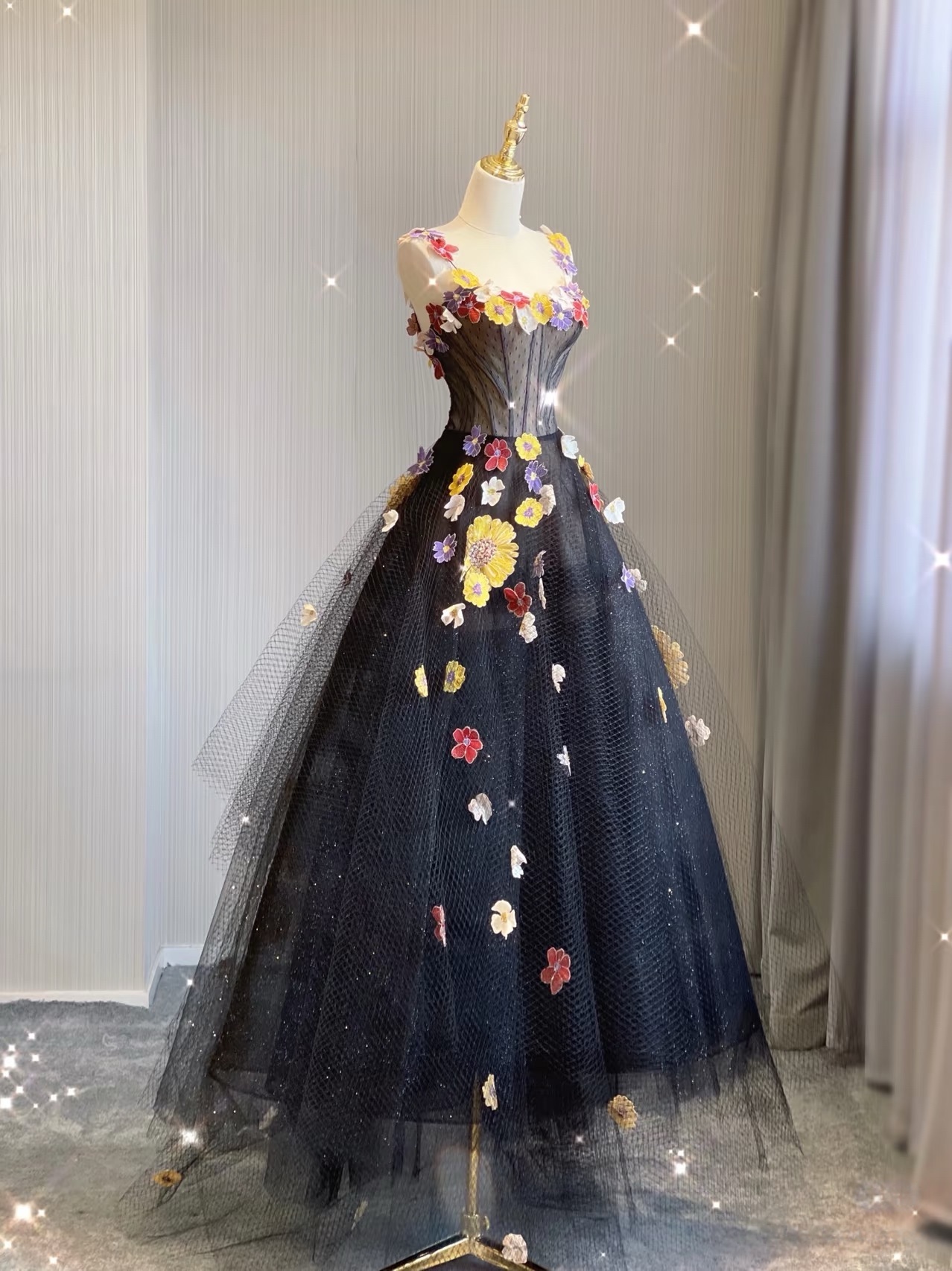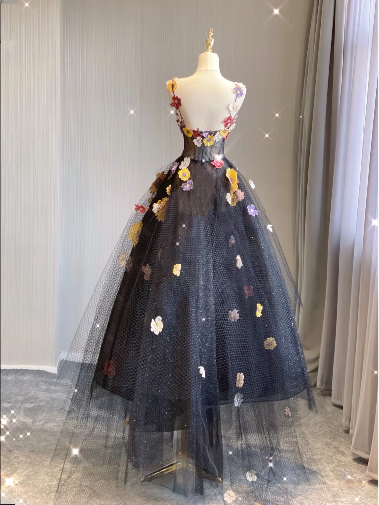 Black Floral Lace Tulle Applique Prom Dresses Spaghetti Strap Formal Dress with Flowers Puffy Quinceanera Dresses