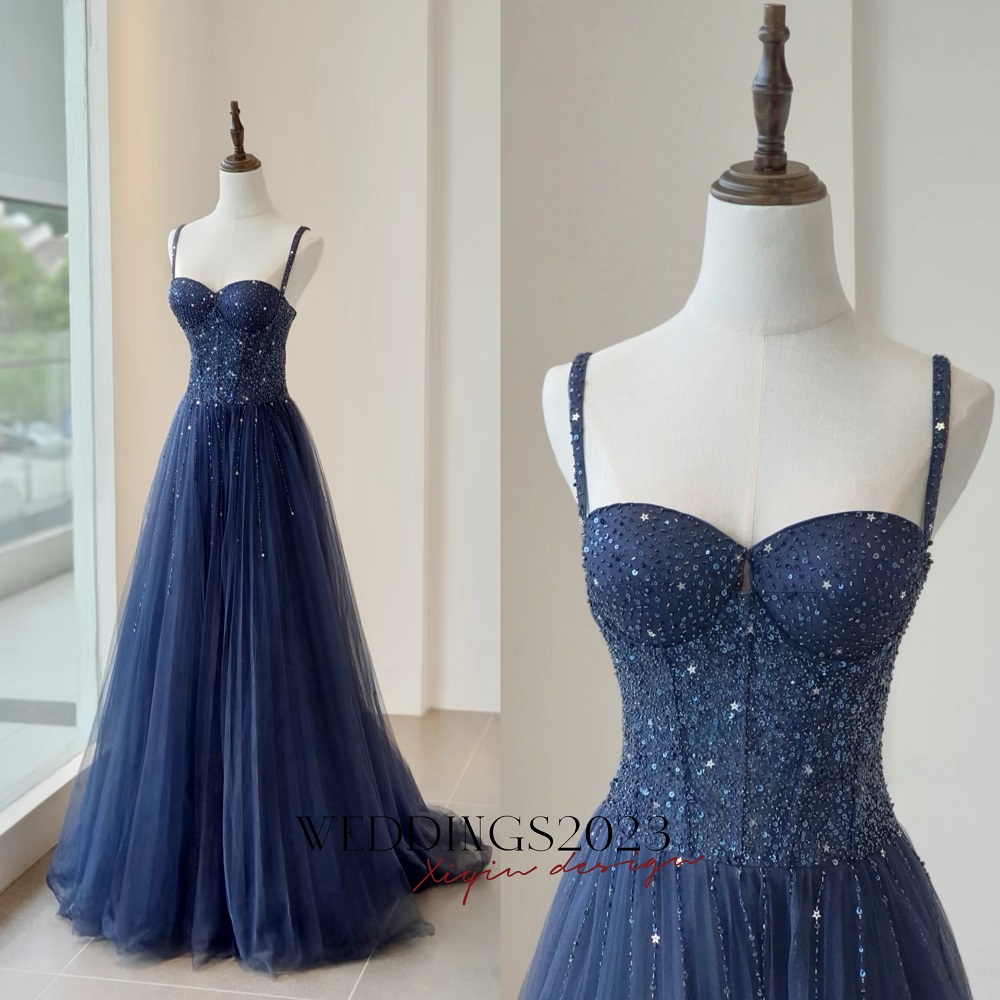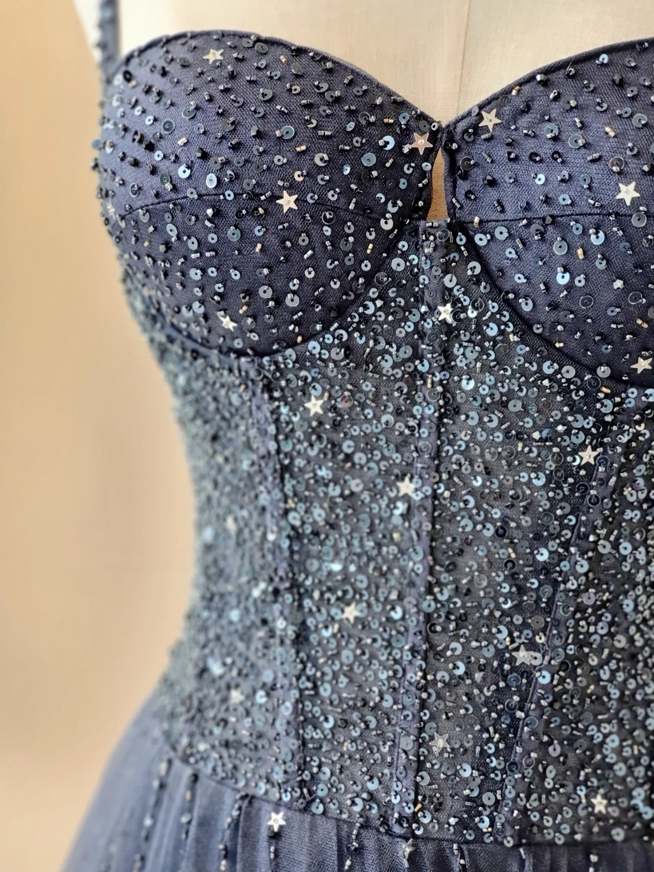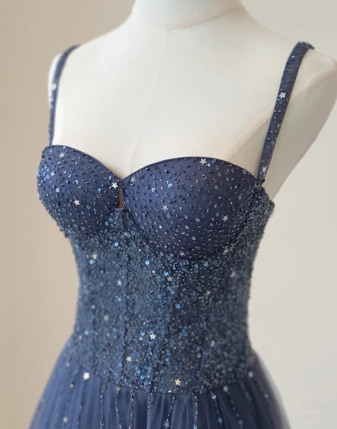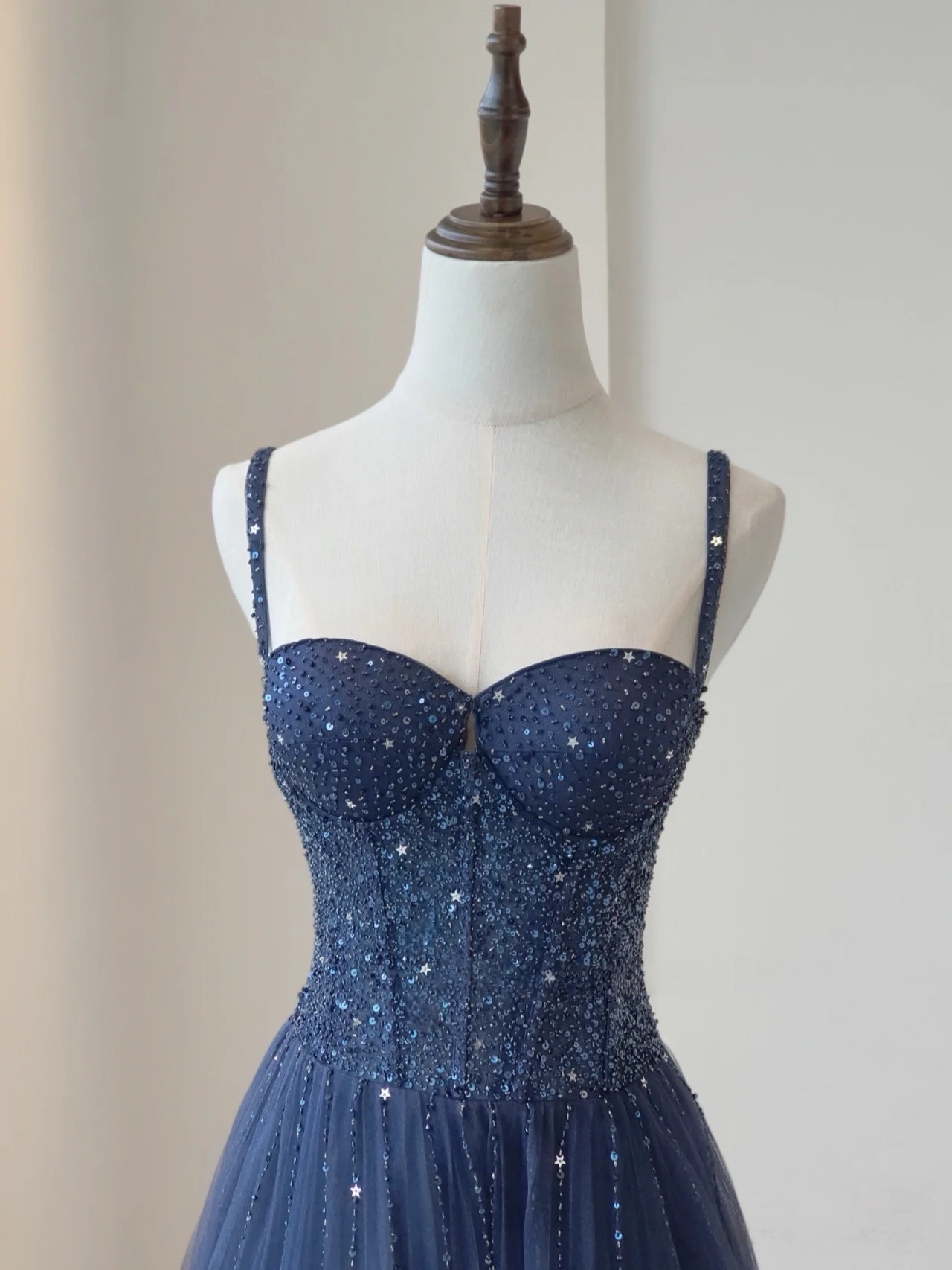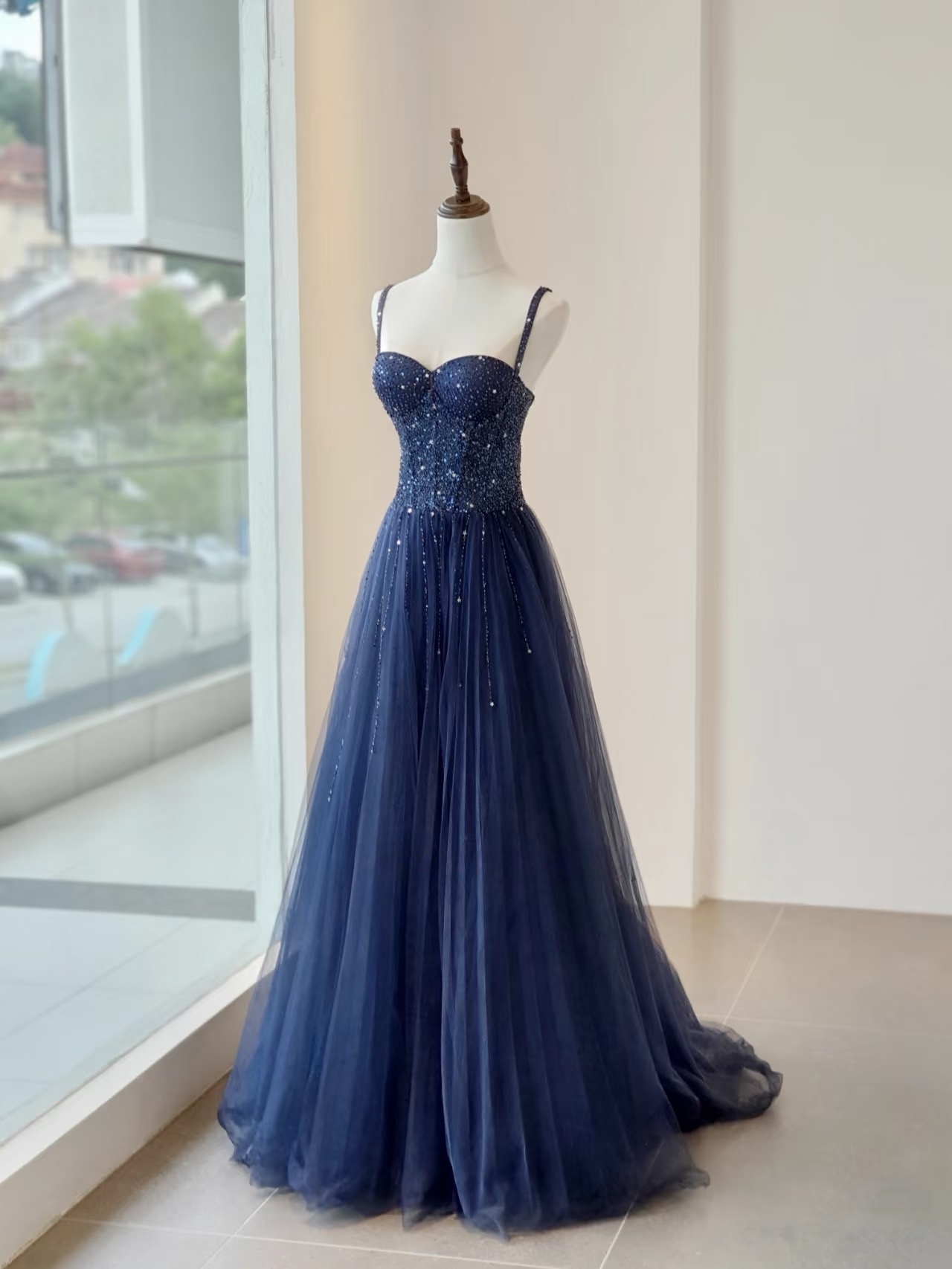 Chic A-line Shiny Dark Navy Long Prom Dresses,Blue Tulle Beaded Long Formal Dress, Gorgeous Evening Dress