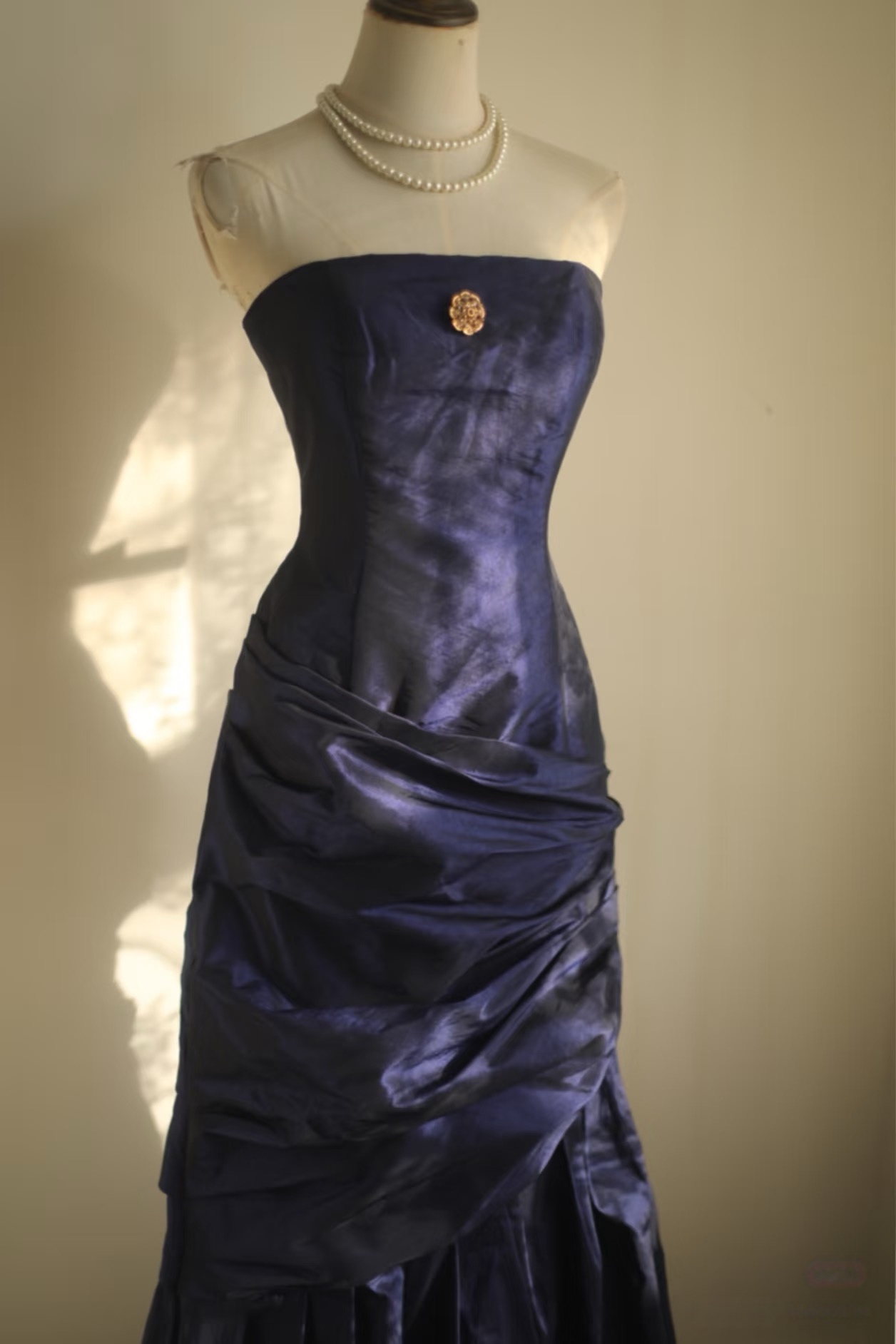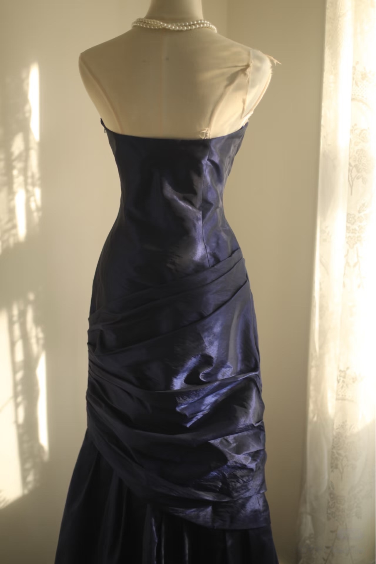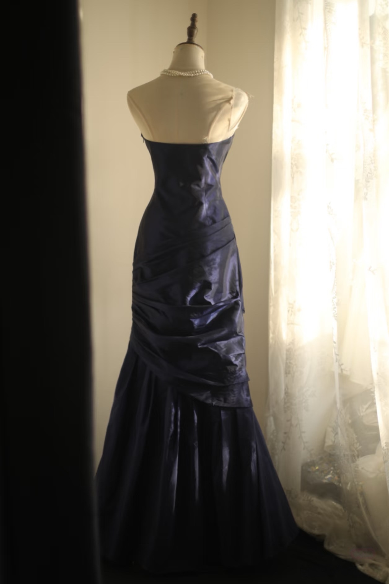 Vintage Navy Blue Long Evening Gown Strapless Taffeta Dresses for Party Events