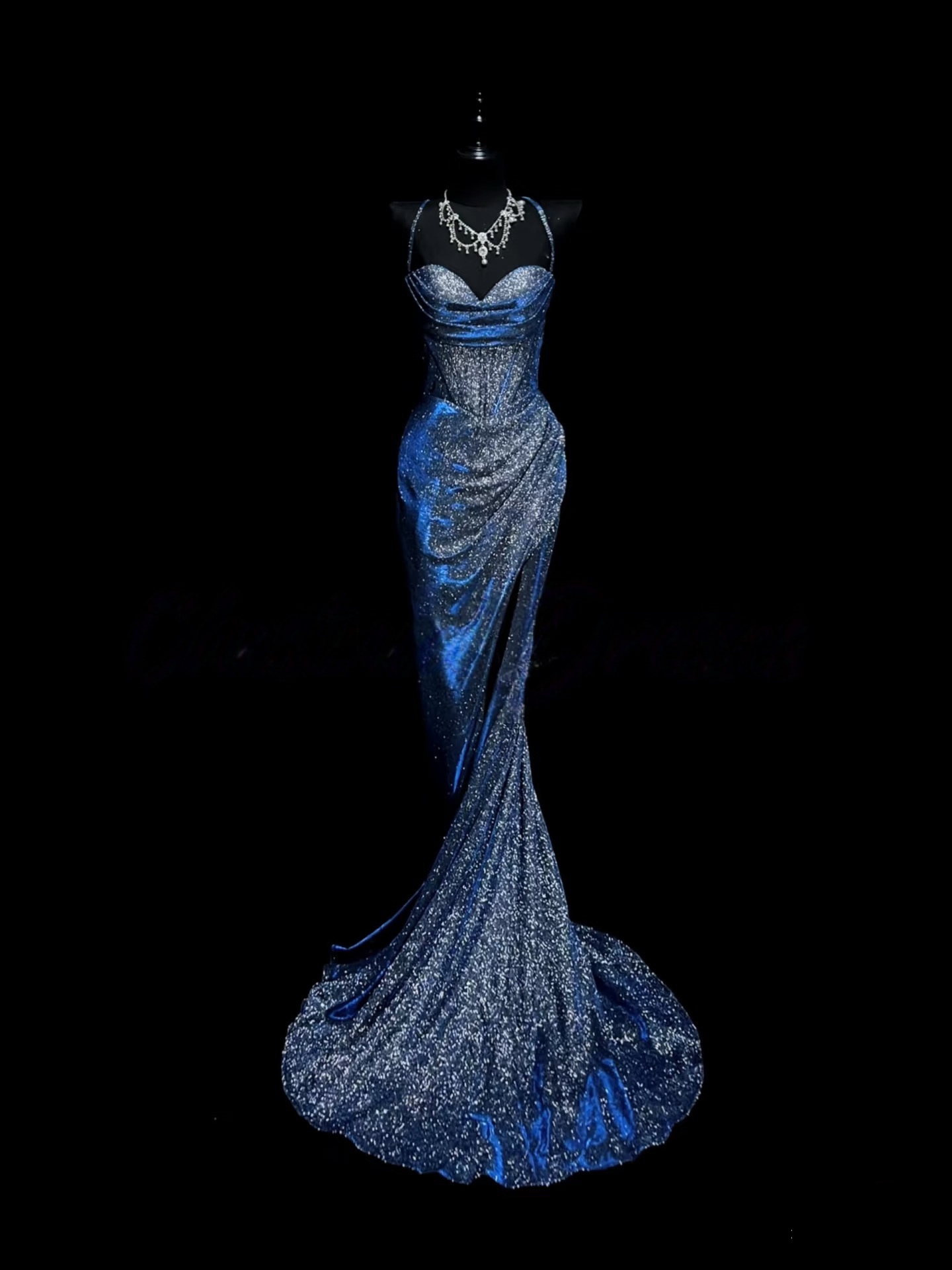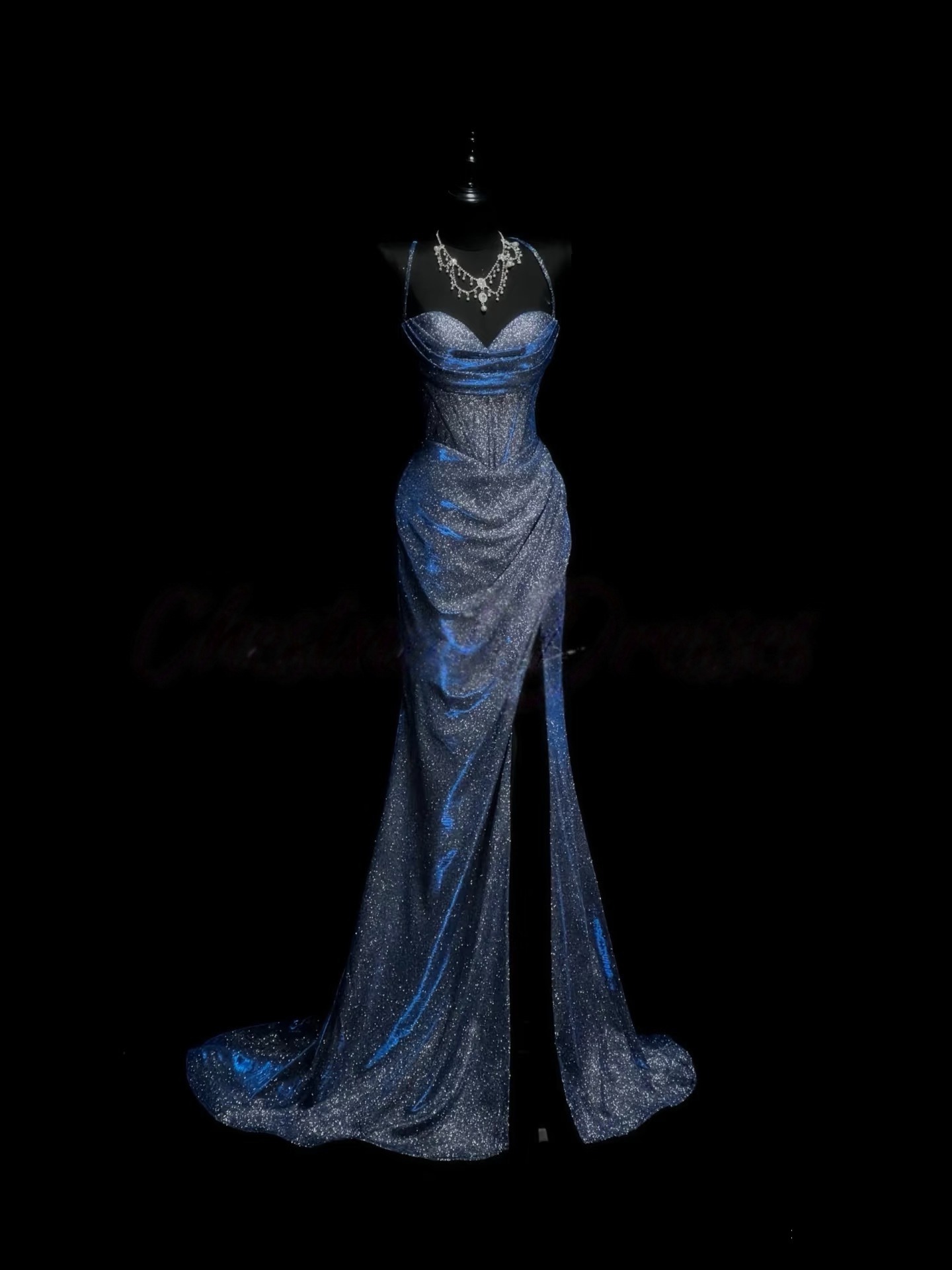 Classy Navy Blue SequinMermaid Spaghetti Straps Long Evening Gowns Prom Dress