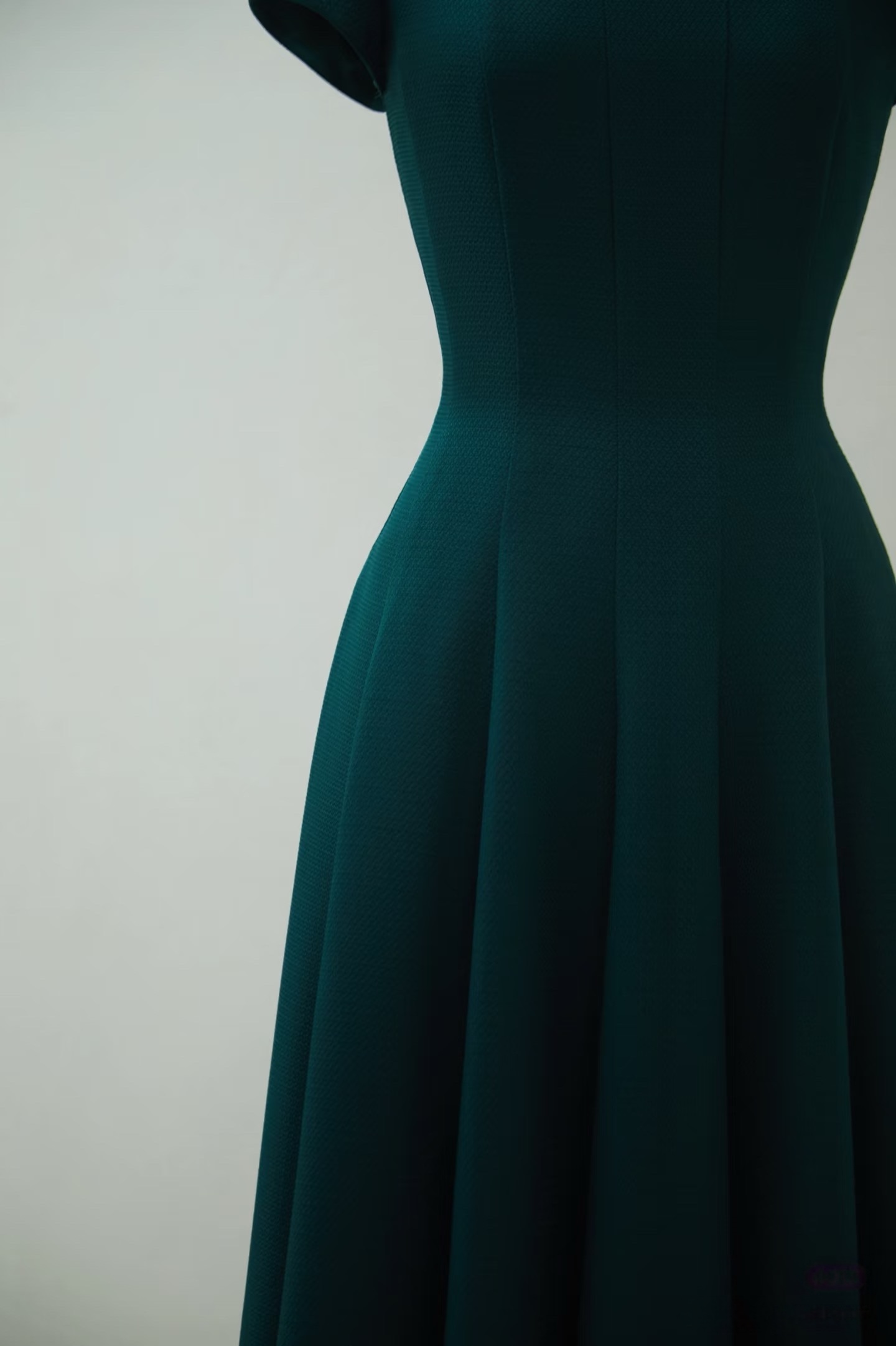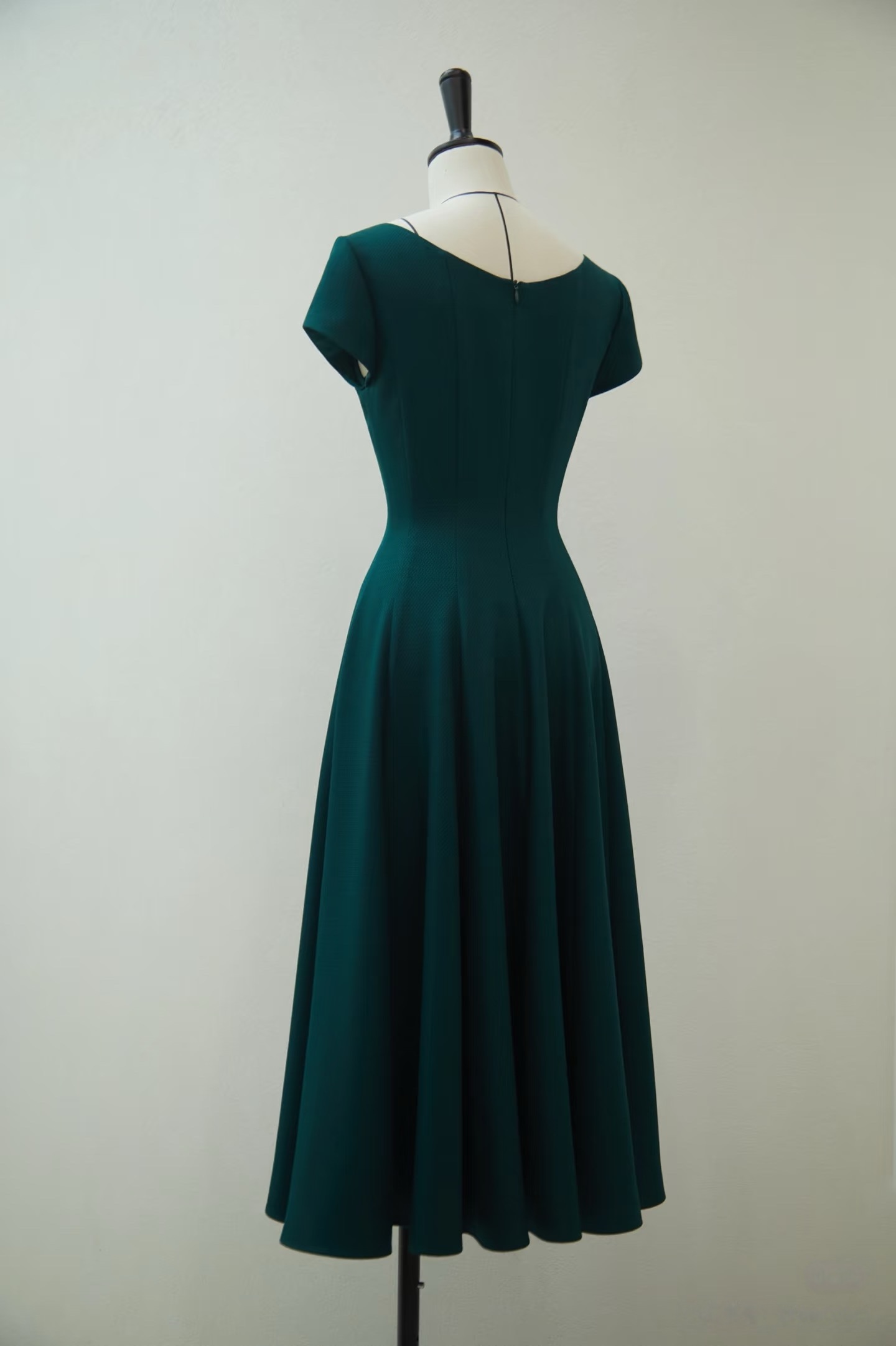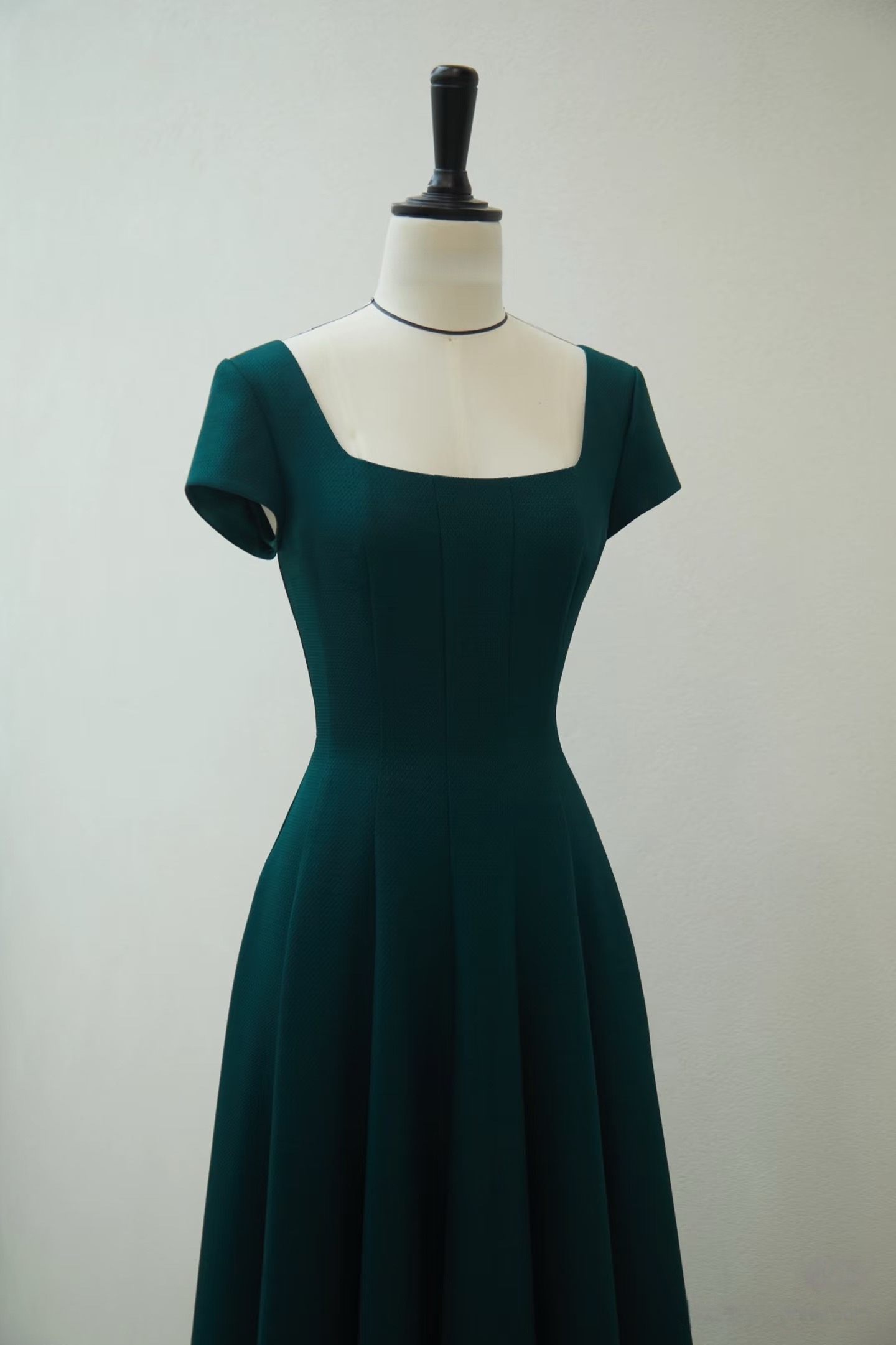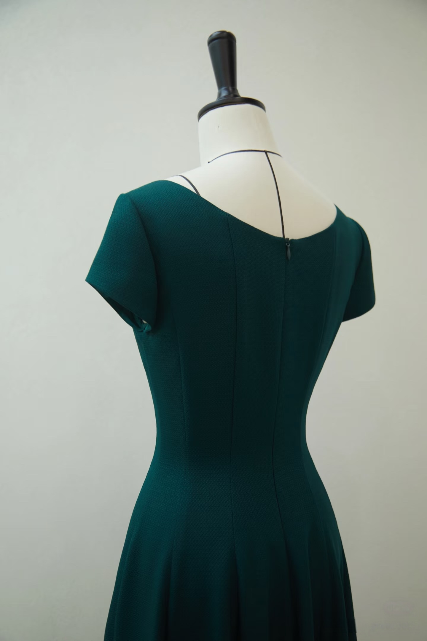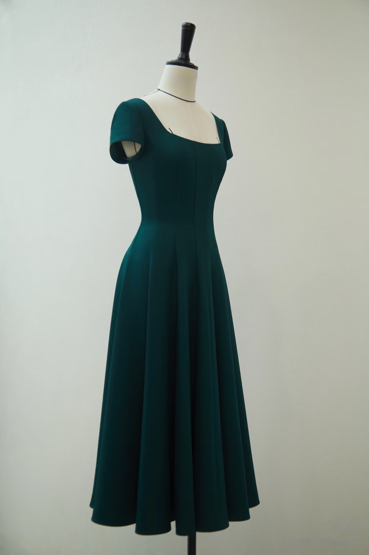 Simple style Dark Green Satin Cap Sleeves Sheath Tea length Evening Dress