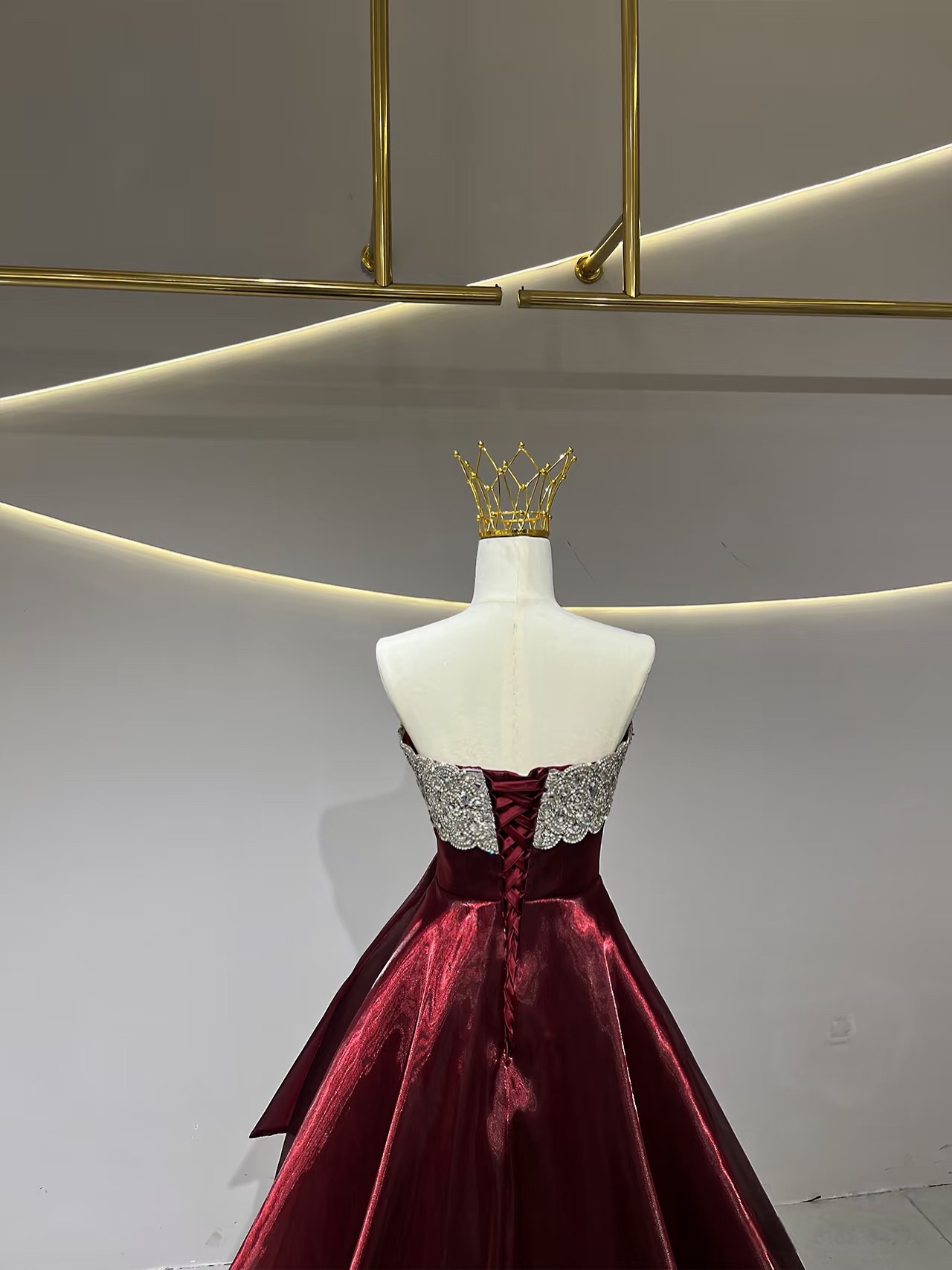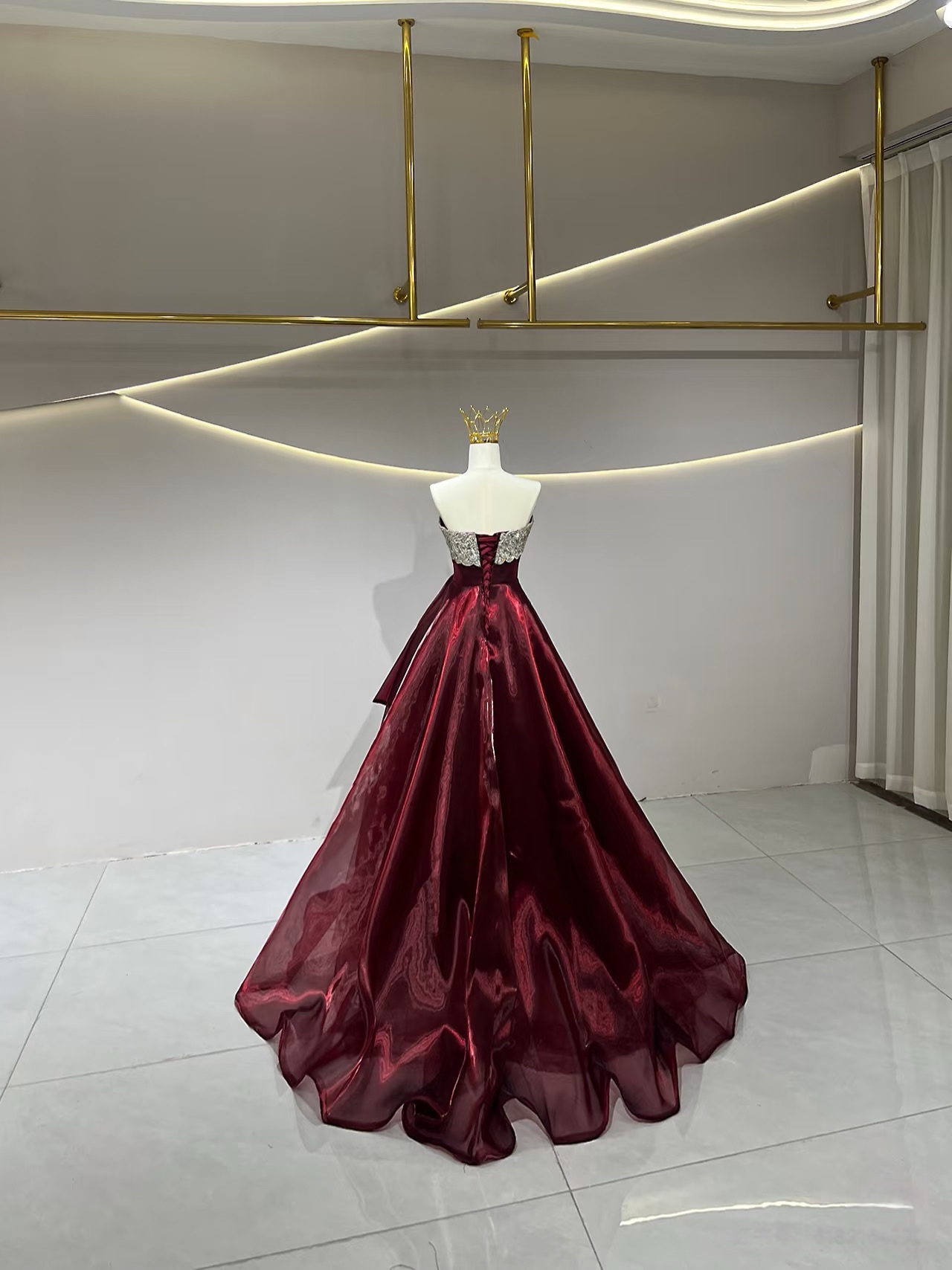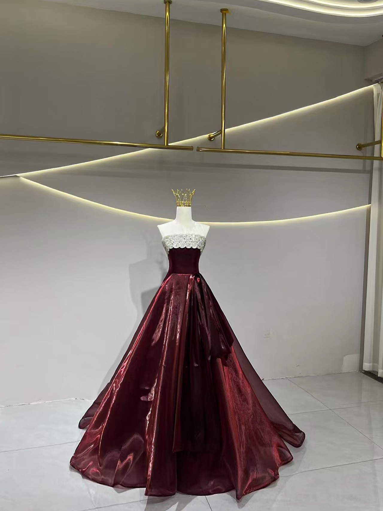 Burgundy A-Line Strapless Organza Long Prom Dress, Burgundy Long Evening Dress