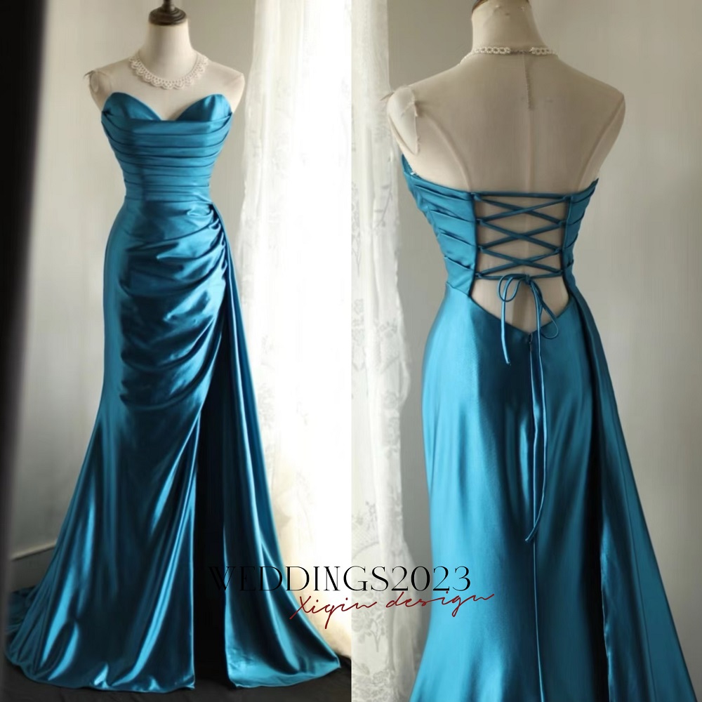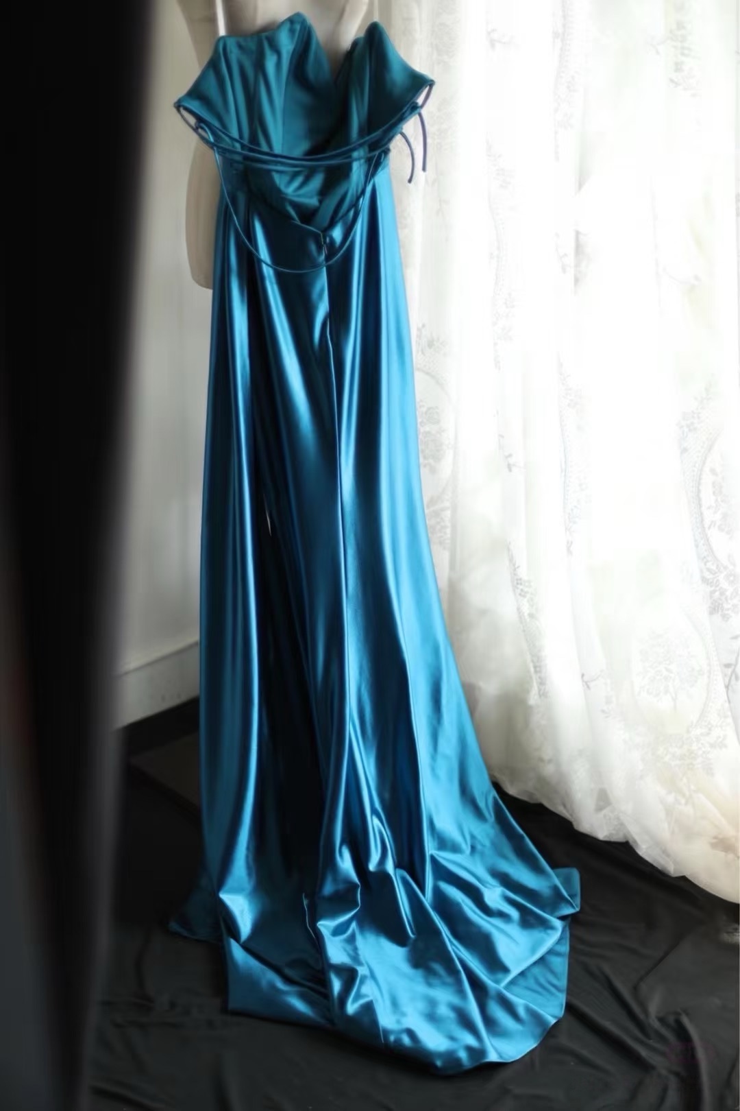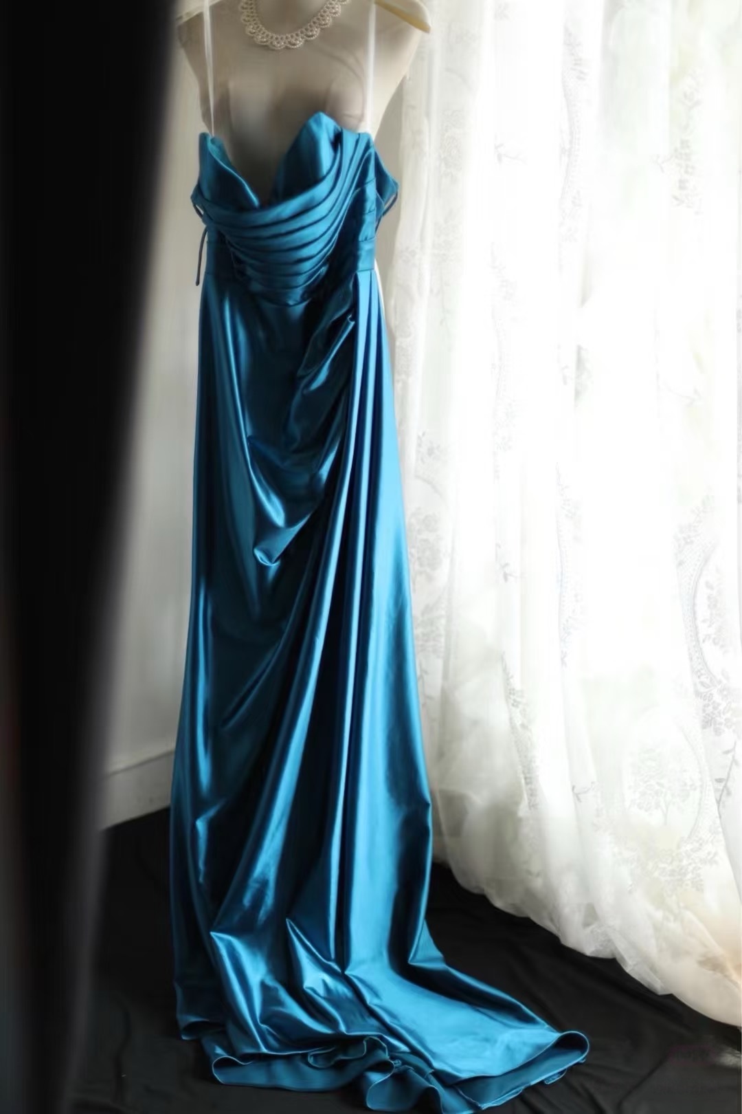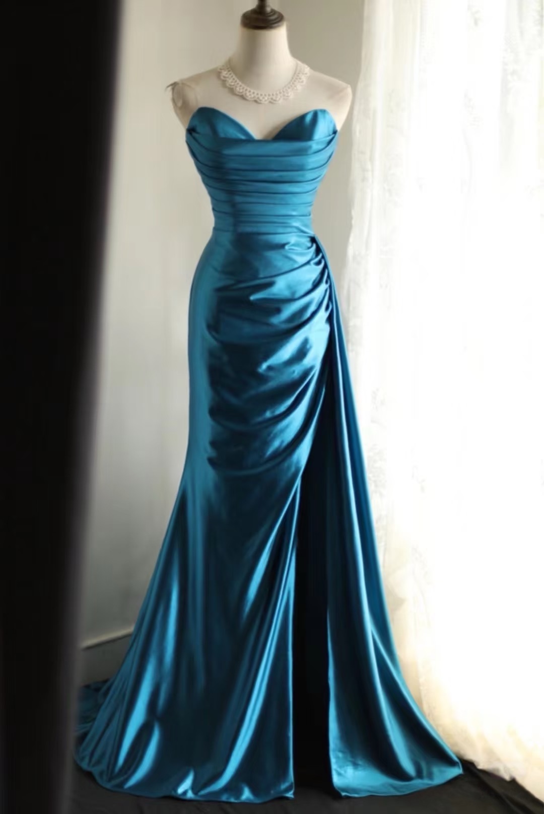Blue Satin Simple Prom Party Dresses Unique Long Evening Dress