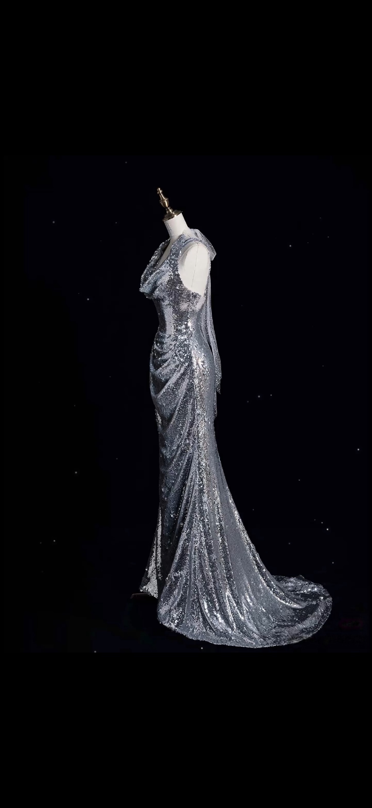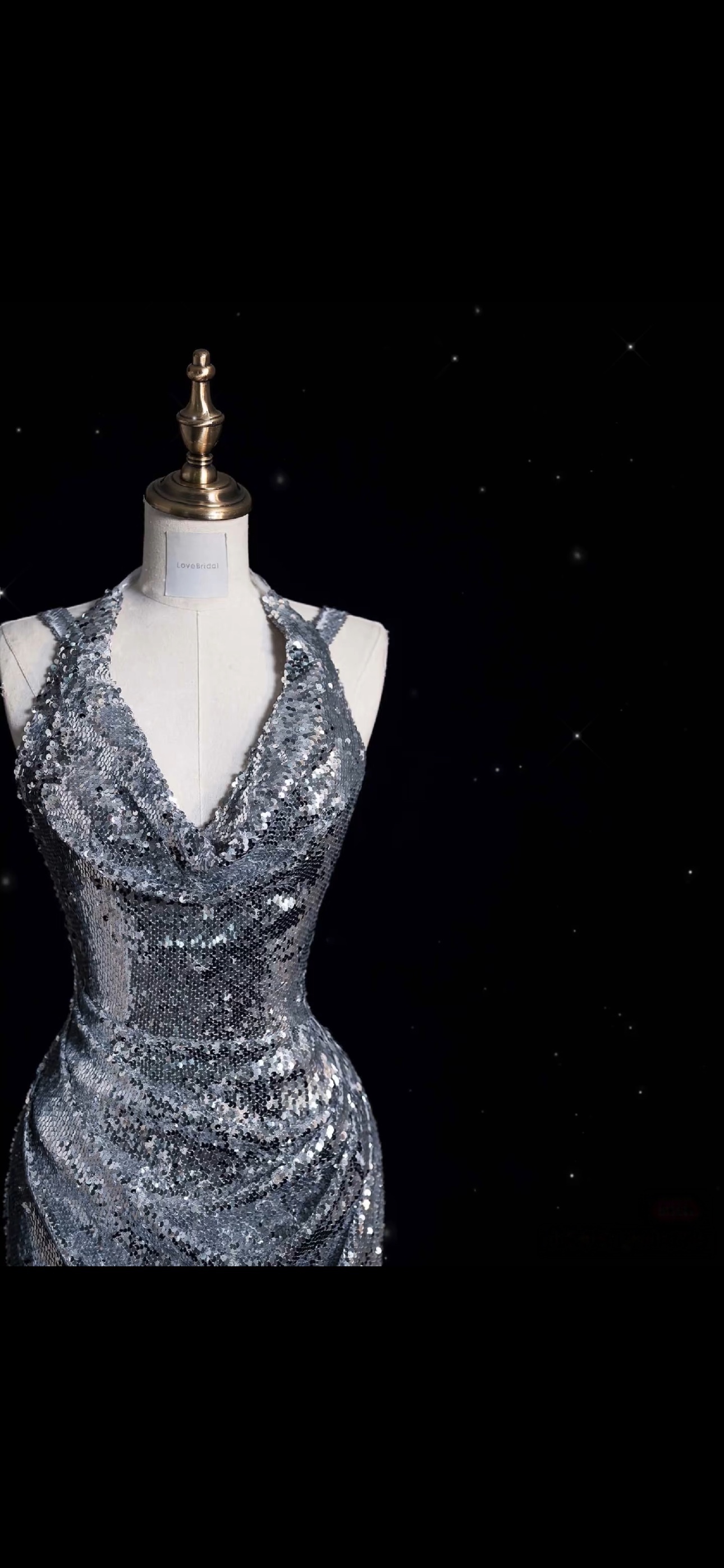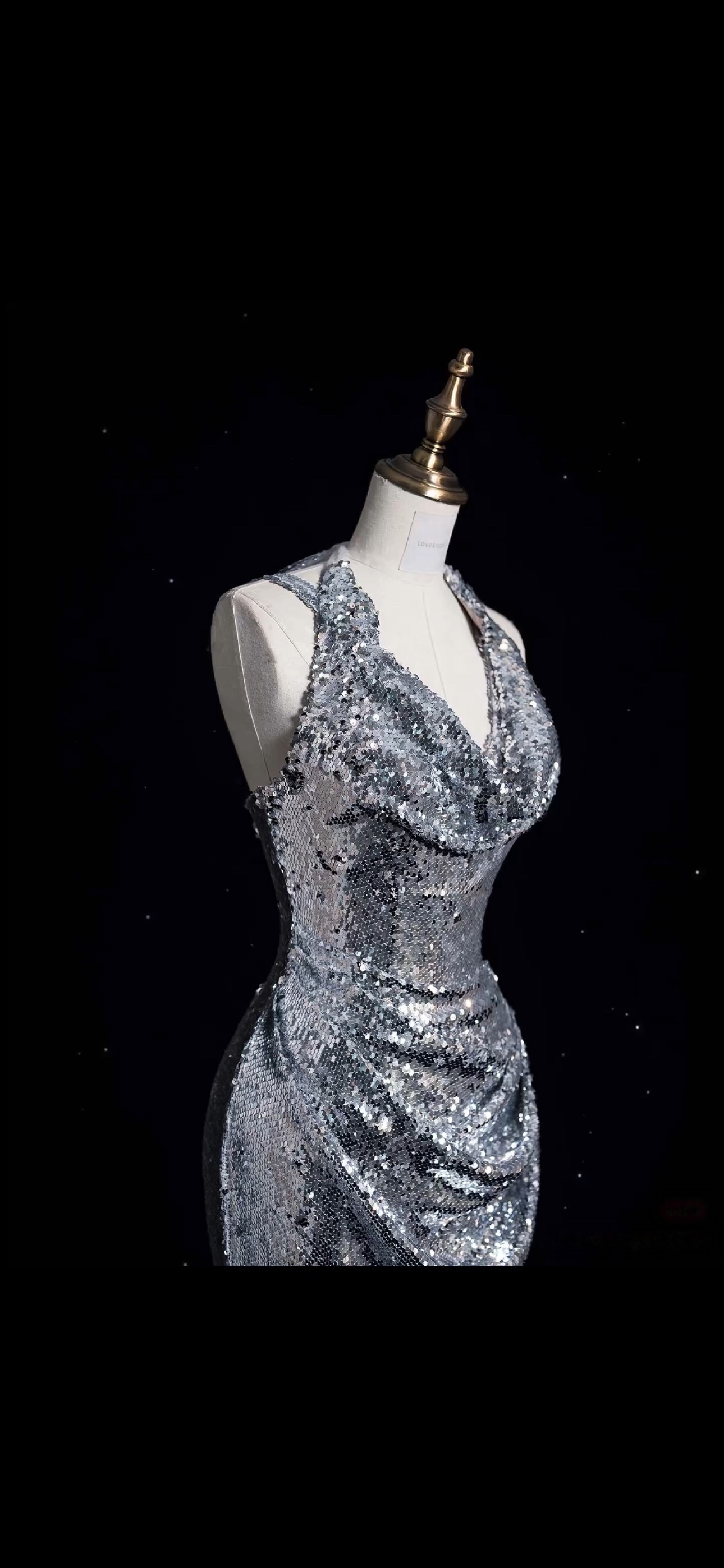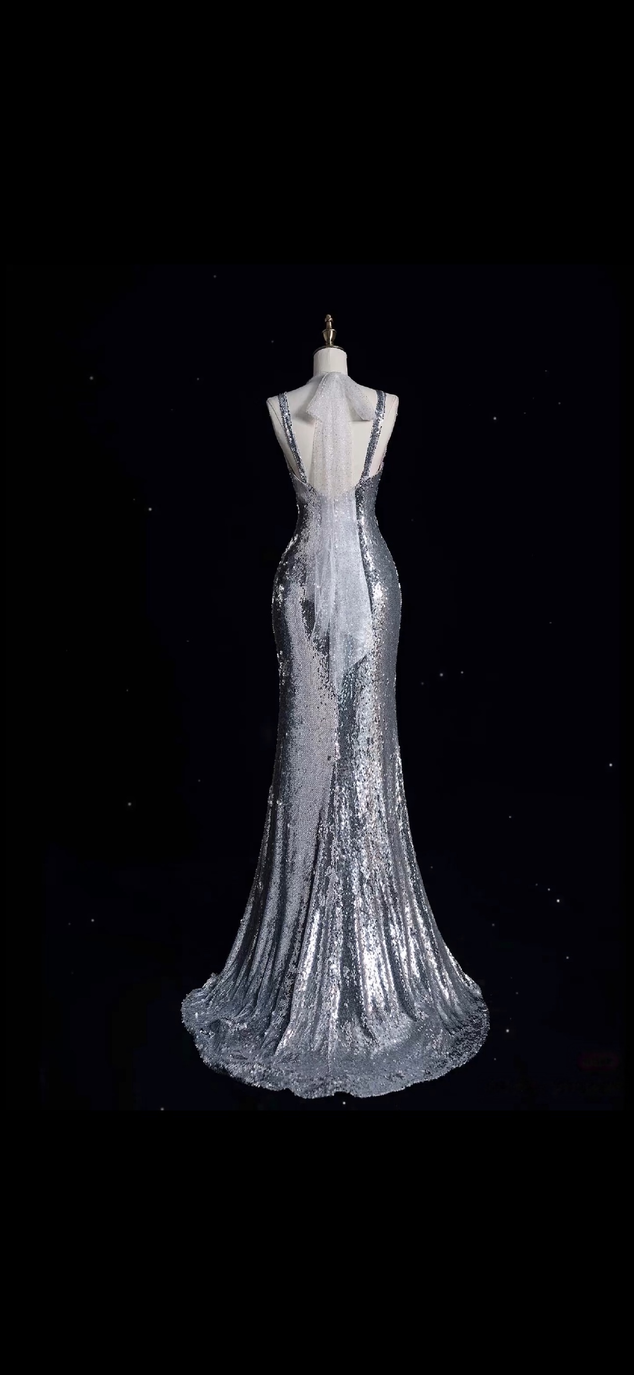 Sliver Shiny Prom Evening Dress V-neck Sleeveless Backless Sequin Pleated Floor