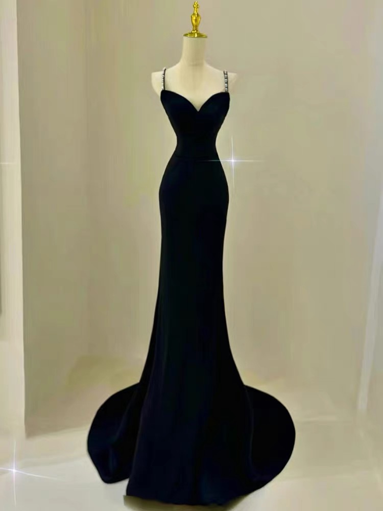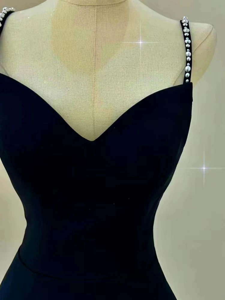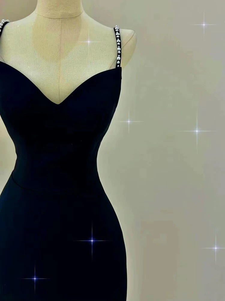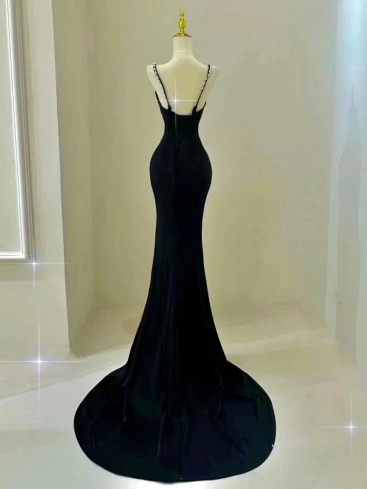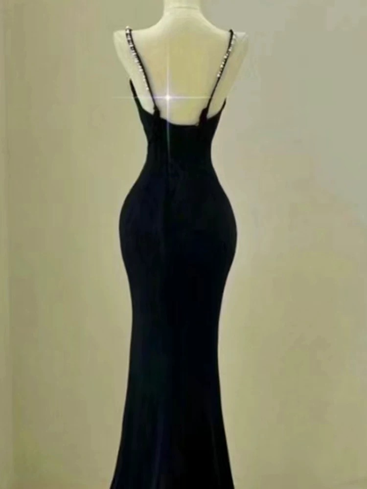 Tight Fitted Simple Velvet Black Beaded Spaghetti Evening Dress With Open Back