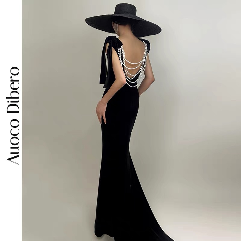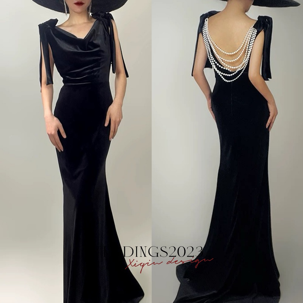 Black Mermaid Eembellished Velvet Open-back Maxi Dress,Floor Length Black Prom Dress