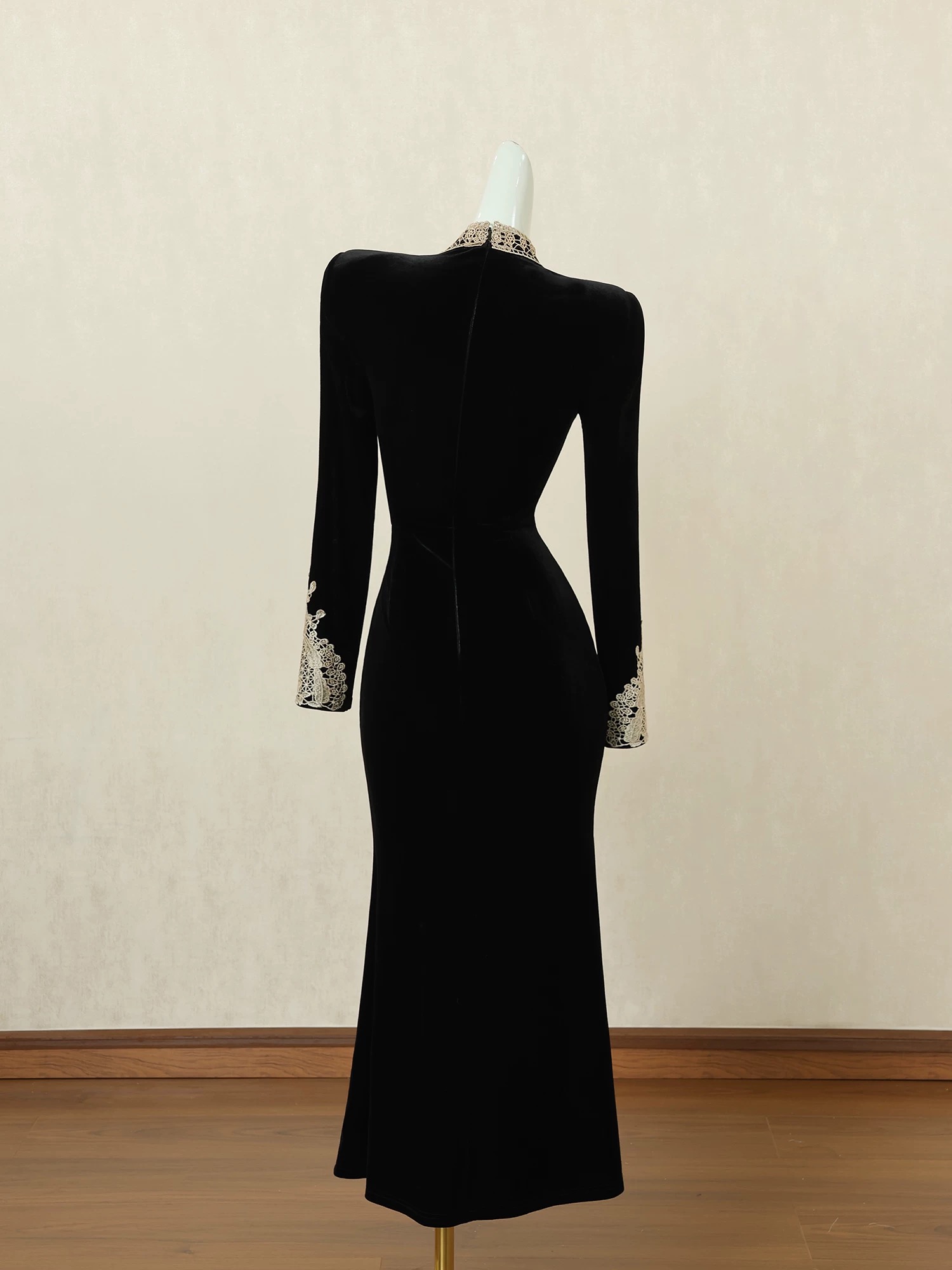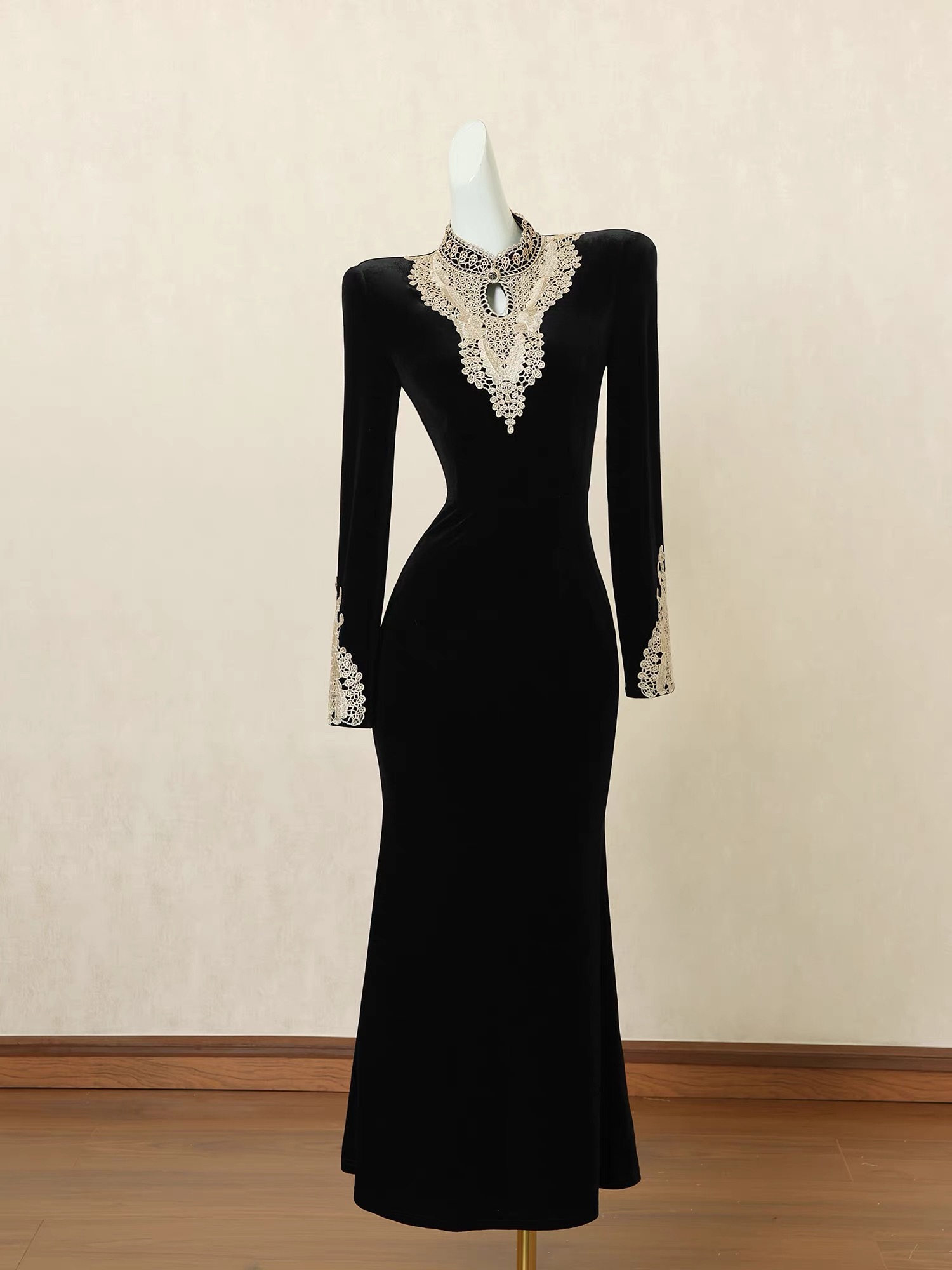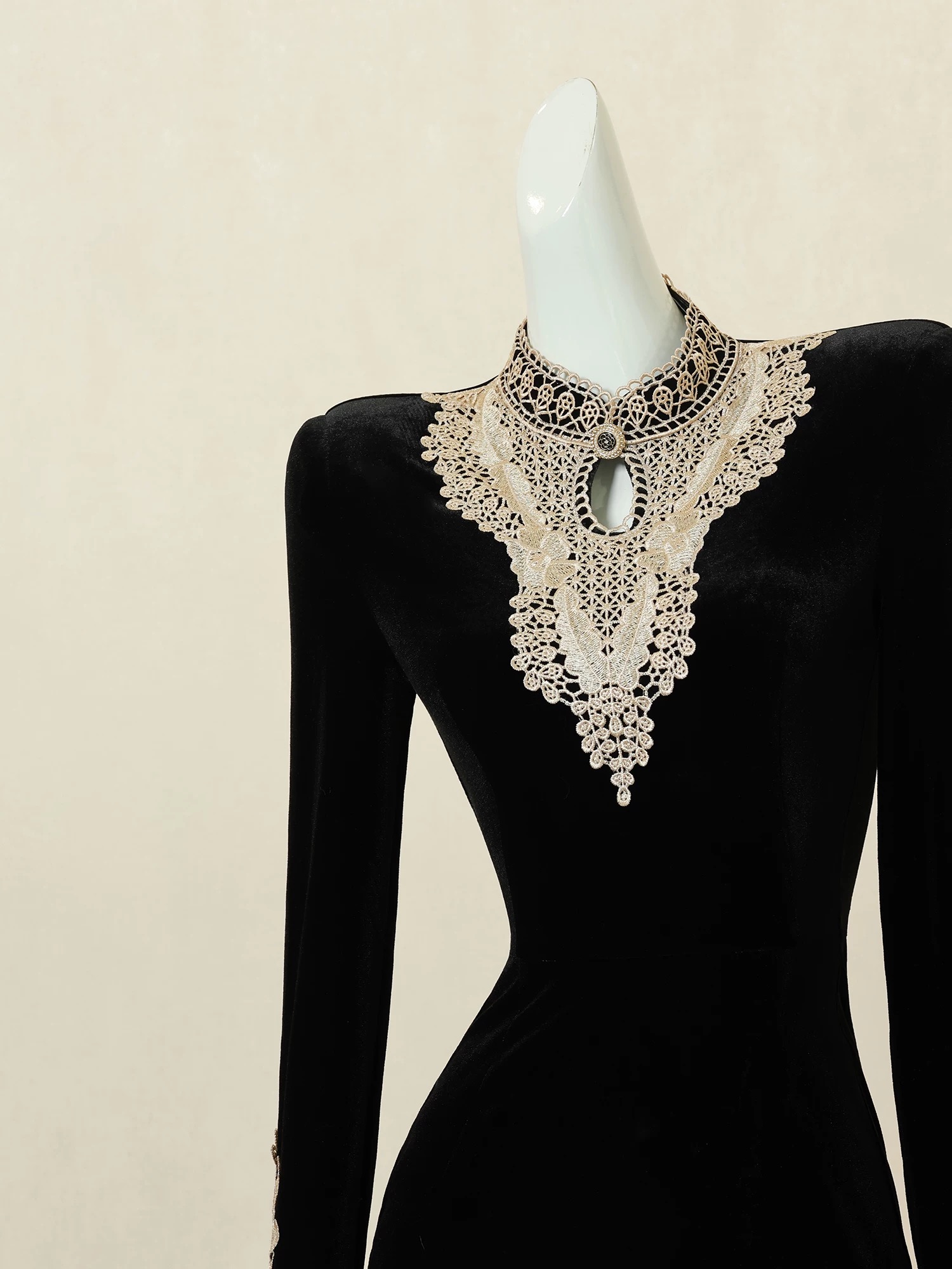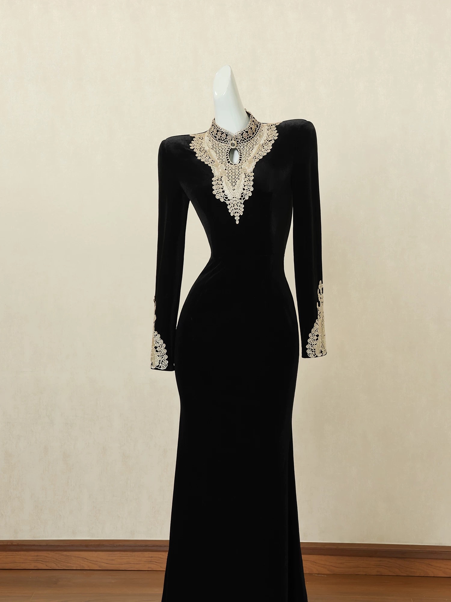 Black Velvet Long Sleeve High Neck Lace Prom Dress