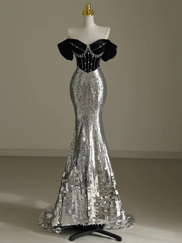 Elegant Silver Mermaid Off Shoulder Evening Gowns Chic Velvet Sequin Long Prom Dresses