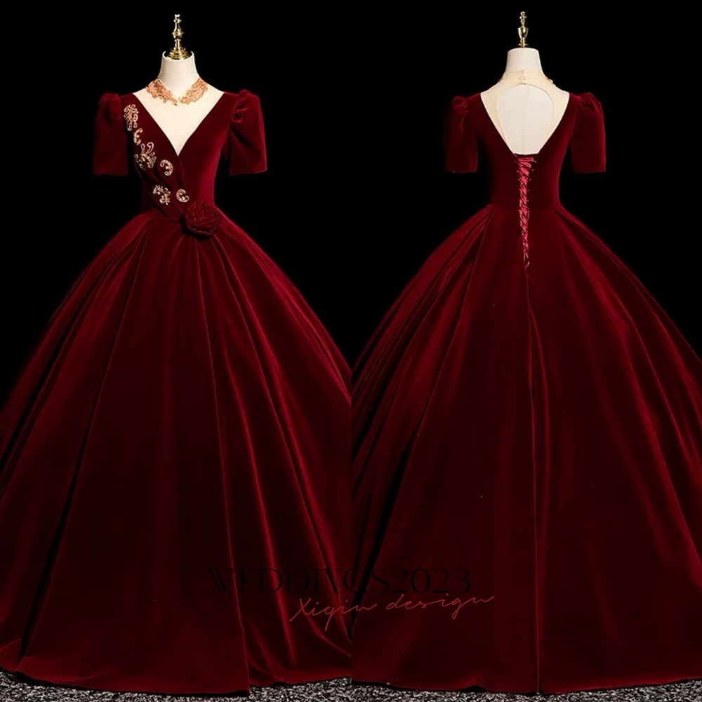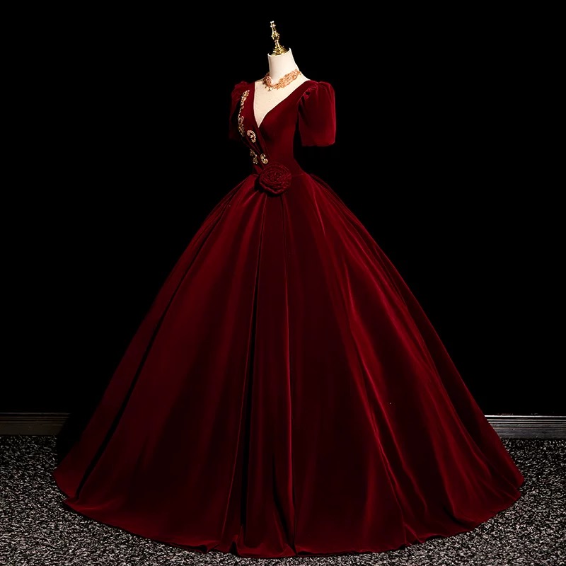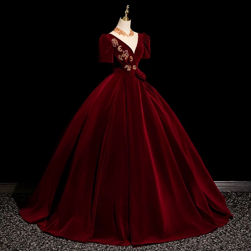 Elegant Burgundy Lace Flower Velvet Prom Dresses Ball Gown Scoop Neck Short Sleeve Backless Floor-Length / Long Prom Formal Dresses