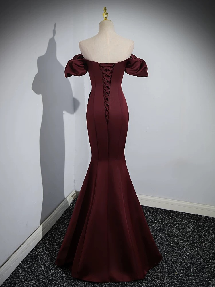 Off the Shoulder Burgundy Satin Long Prom Dresses, Wine Red Mermaid Formal Evening Dresses