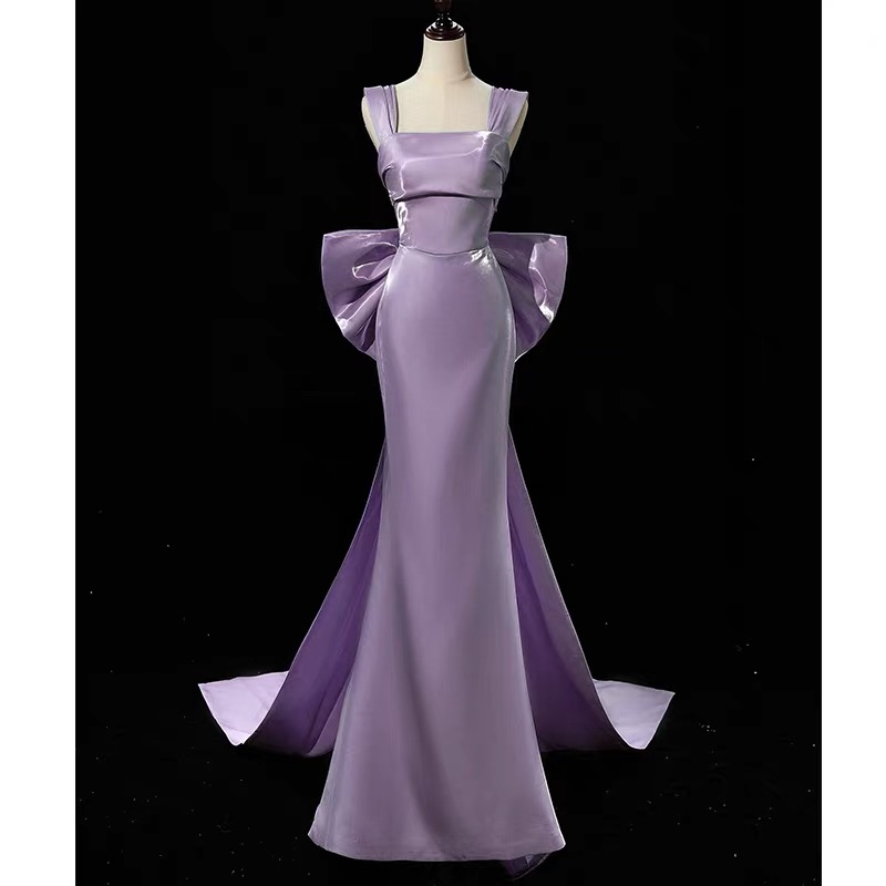 Purple Satin Mermaid Satin Long Party Dress with Bow, Purple Satin Evening Dress Prom Dress