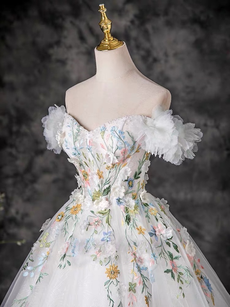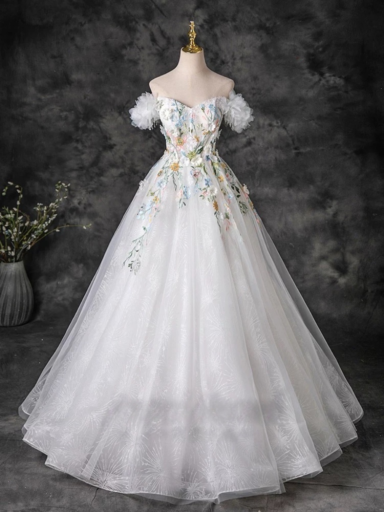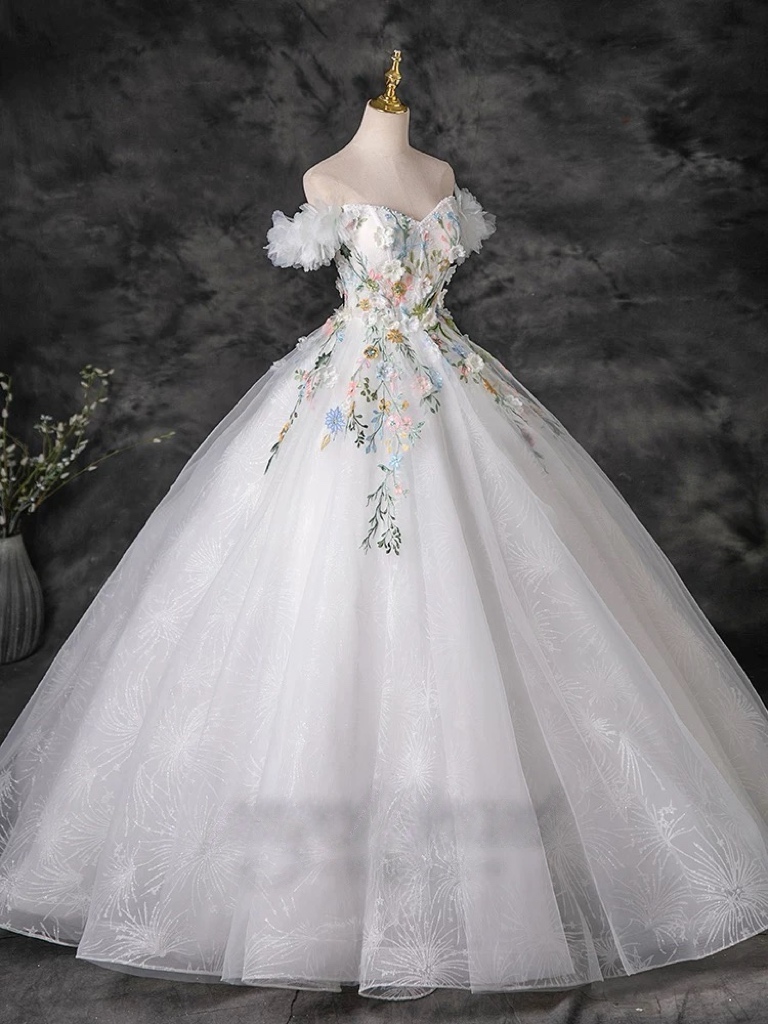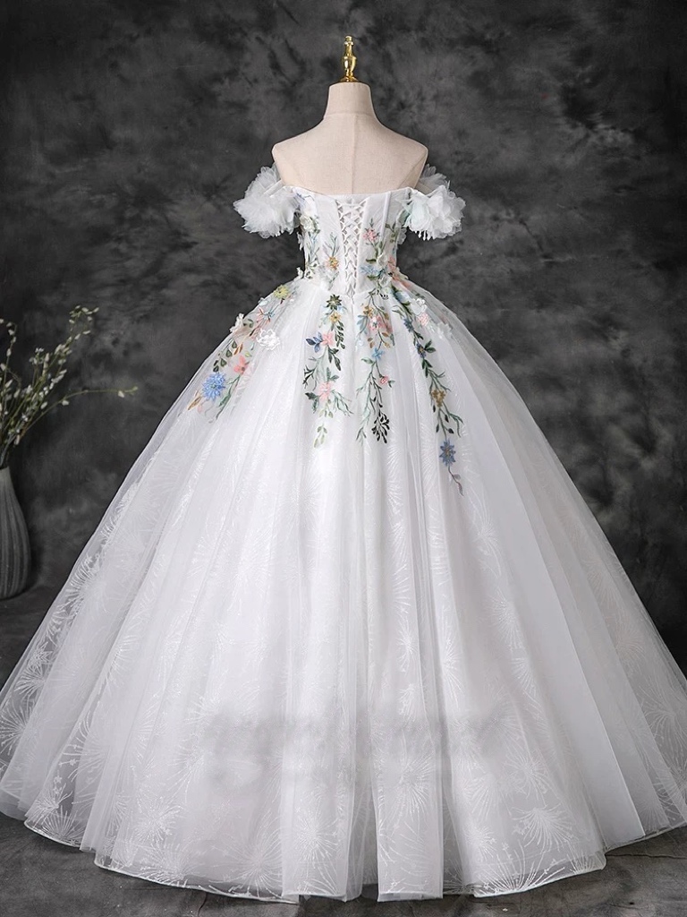 Fairytale Multi-Colors Lace Flower Appliques Pearl White Prom Dresses Ball Gown Off-The-Shoulder Short Sleeve Backless Floor-Length / Long Prom Formal Dresses
