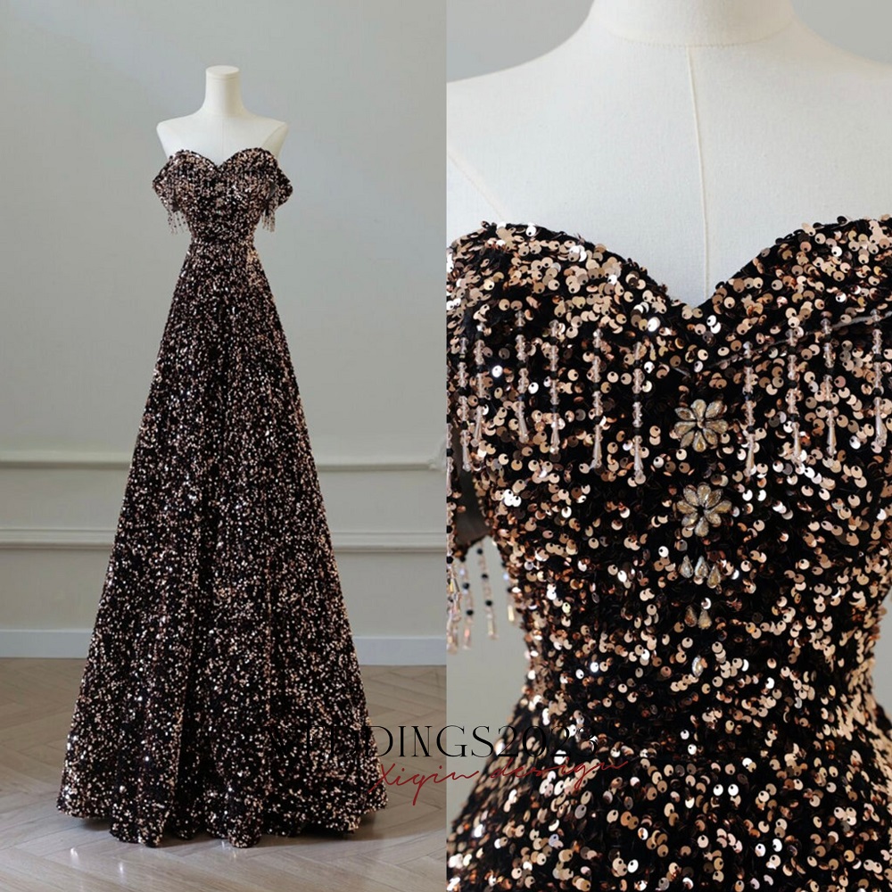 Coffee Gold Evening Dress,Off Shoulder A-Line Coffee Gold Sequin Long Prom Dress ❤ COLOR: Iolor as in picture