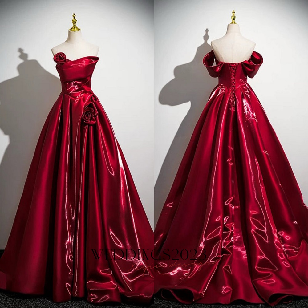 Beautiful Burgundy Sweep Train Prom Dresses Ball Gown Off-The-Shoulder Short Sleeve Backless Formal Dresses