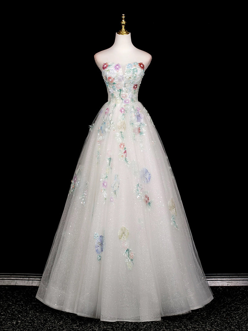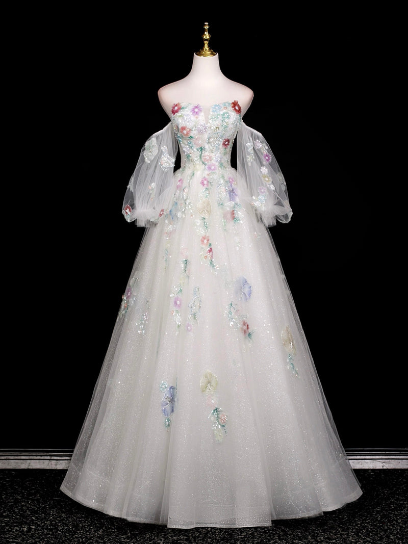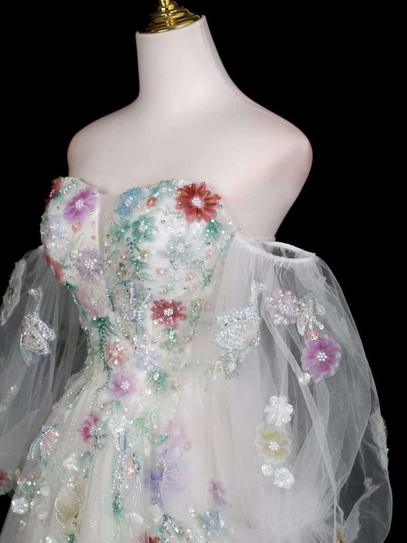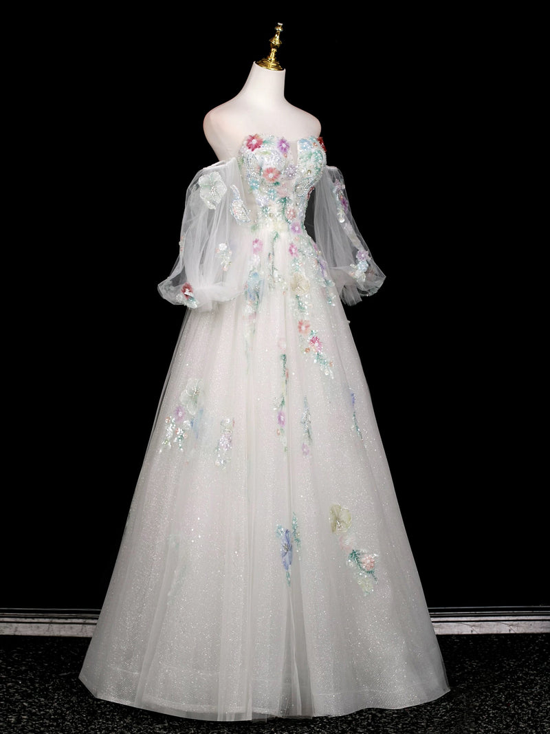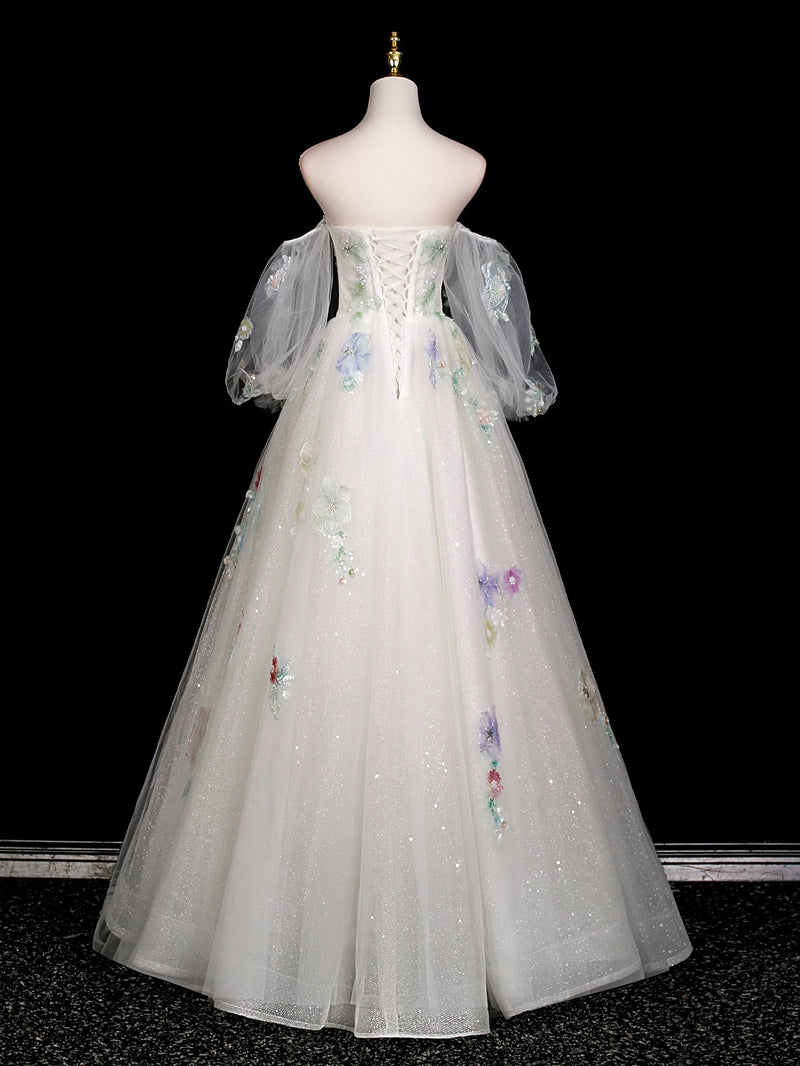 Beautiful Tulle Sequins Long Prom Dress, White Off the Shoulder Formal Dress