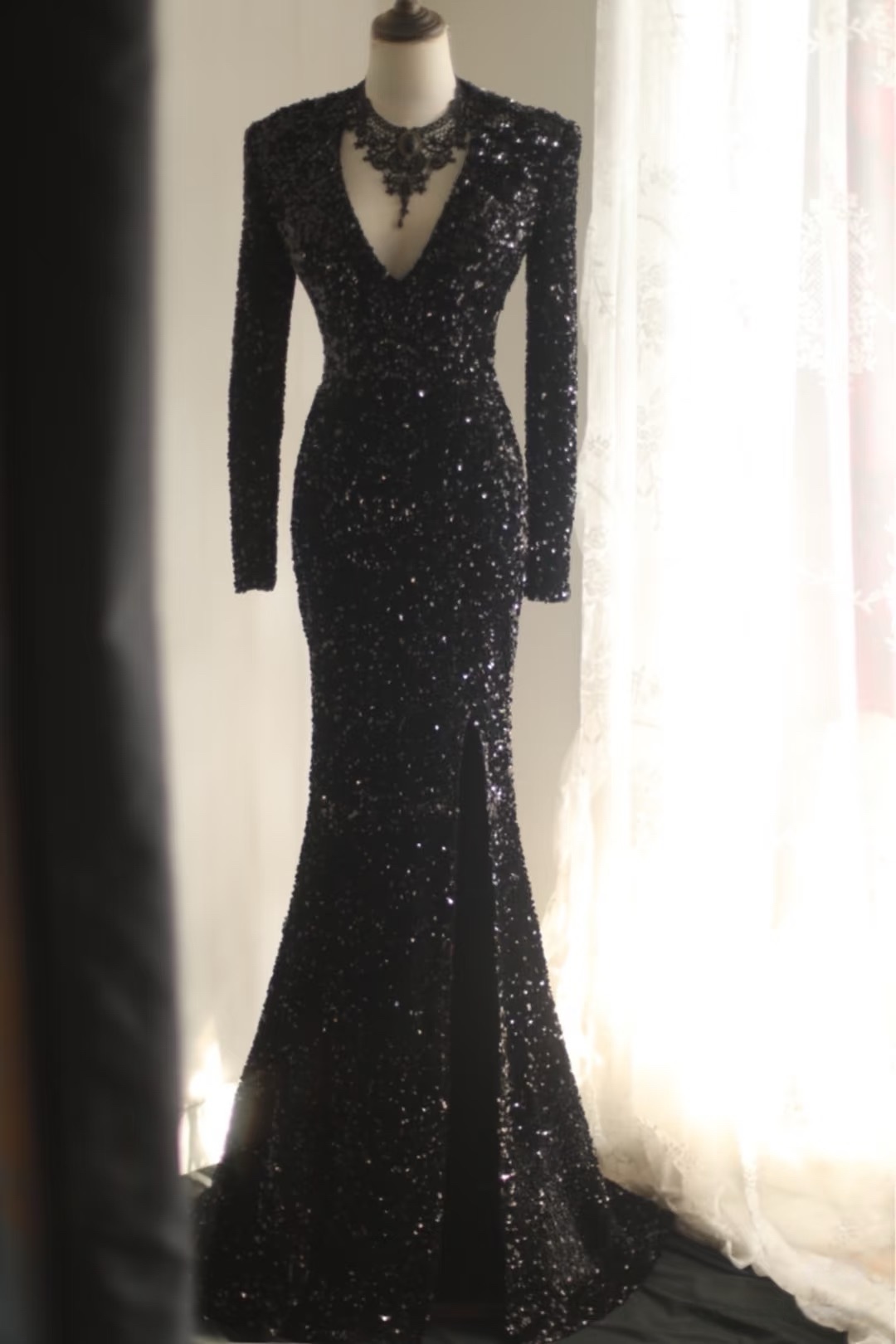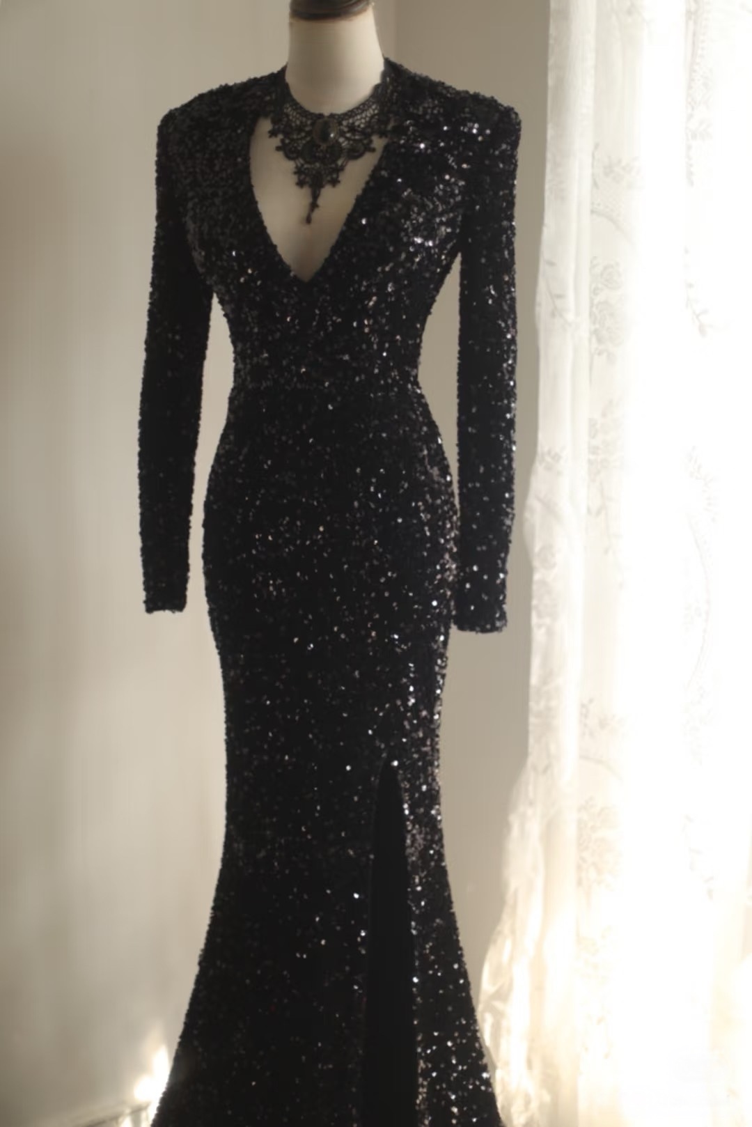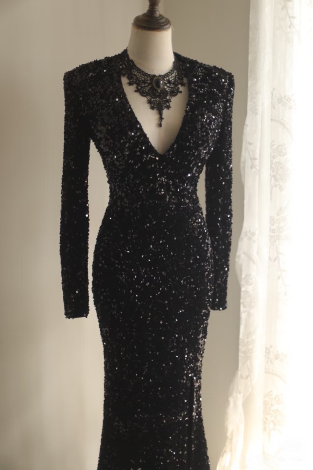 Black Sequin Long Sleeve Dress With Deep V Neck Black Sequin Long