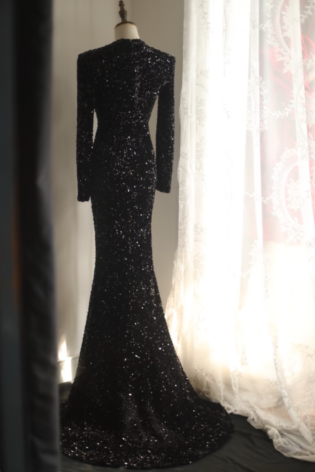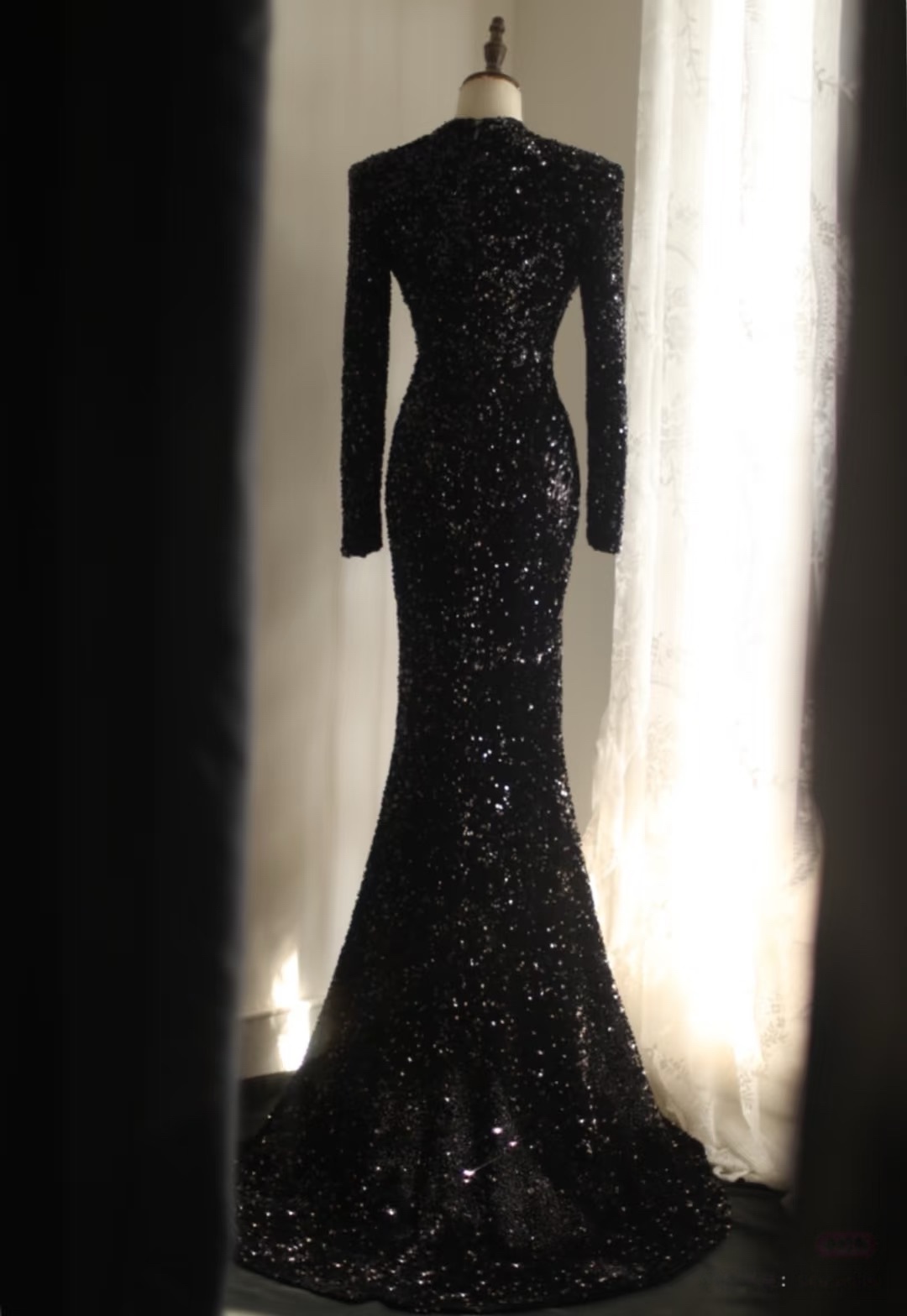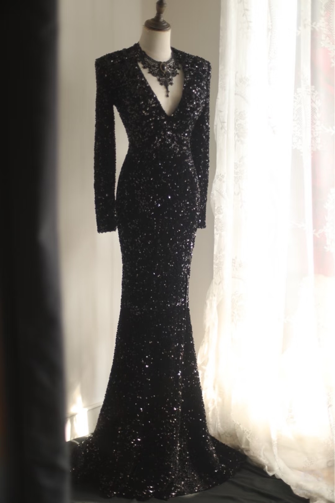 Black Sequin Long Sleeve Dress With Deep V Neck Black Sequin Long