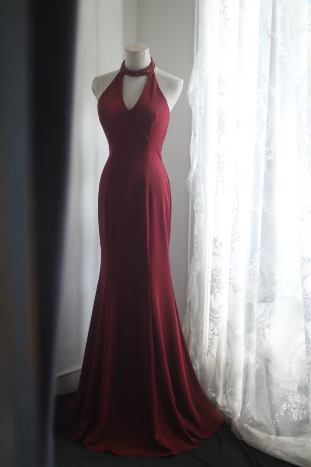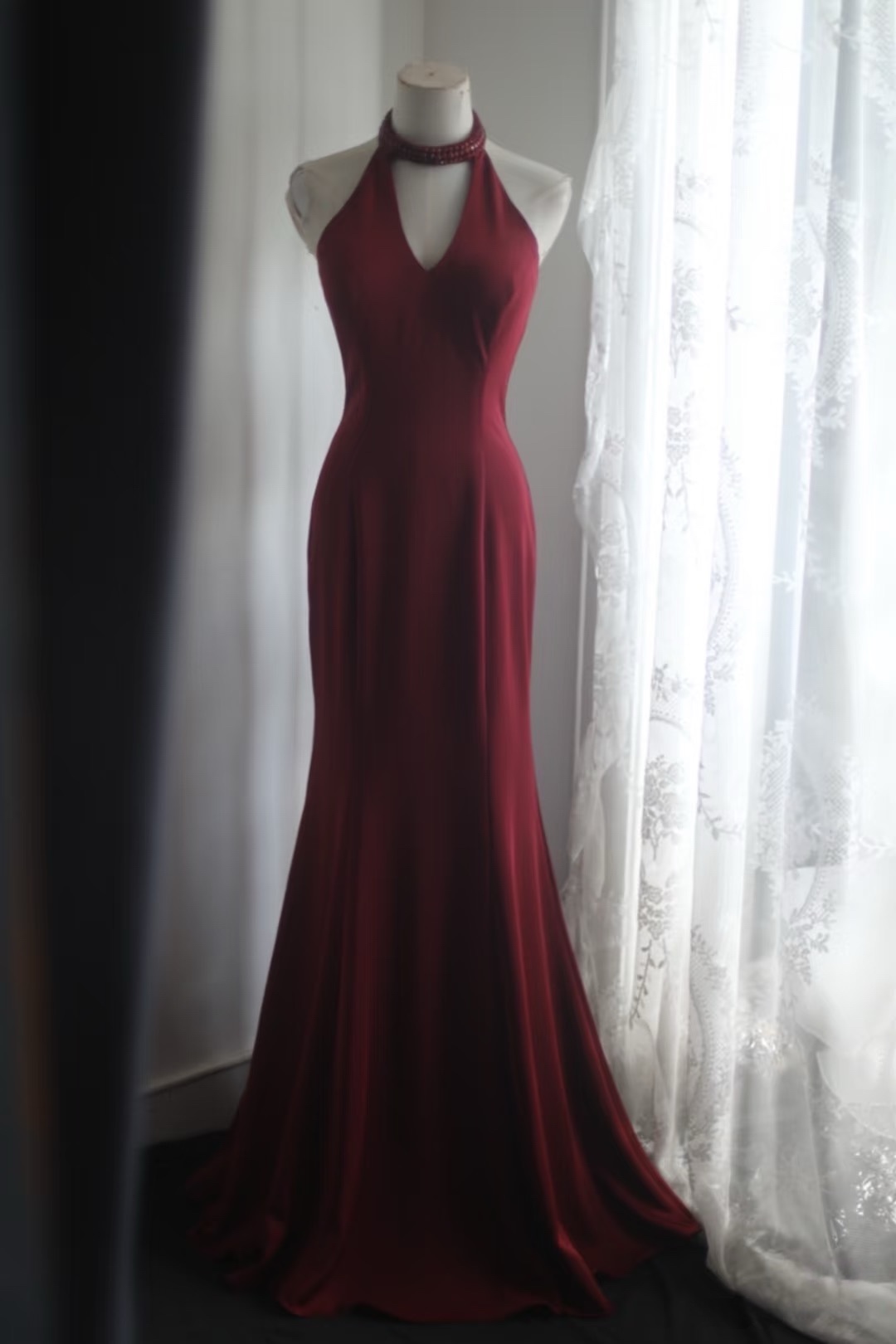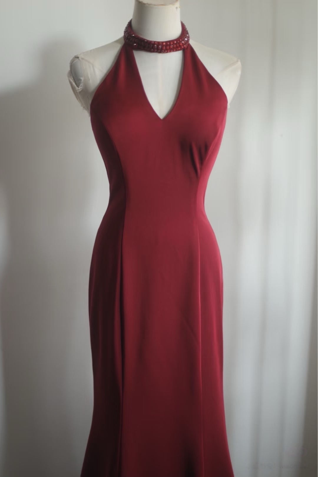 Halter Crimson Deep V-Neck Mermaid Beaded Formal Dress Party Gown