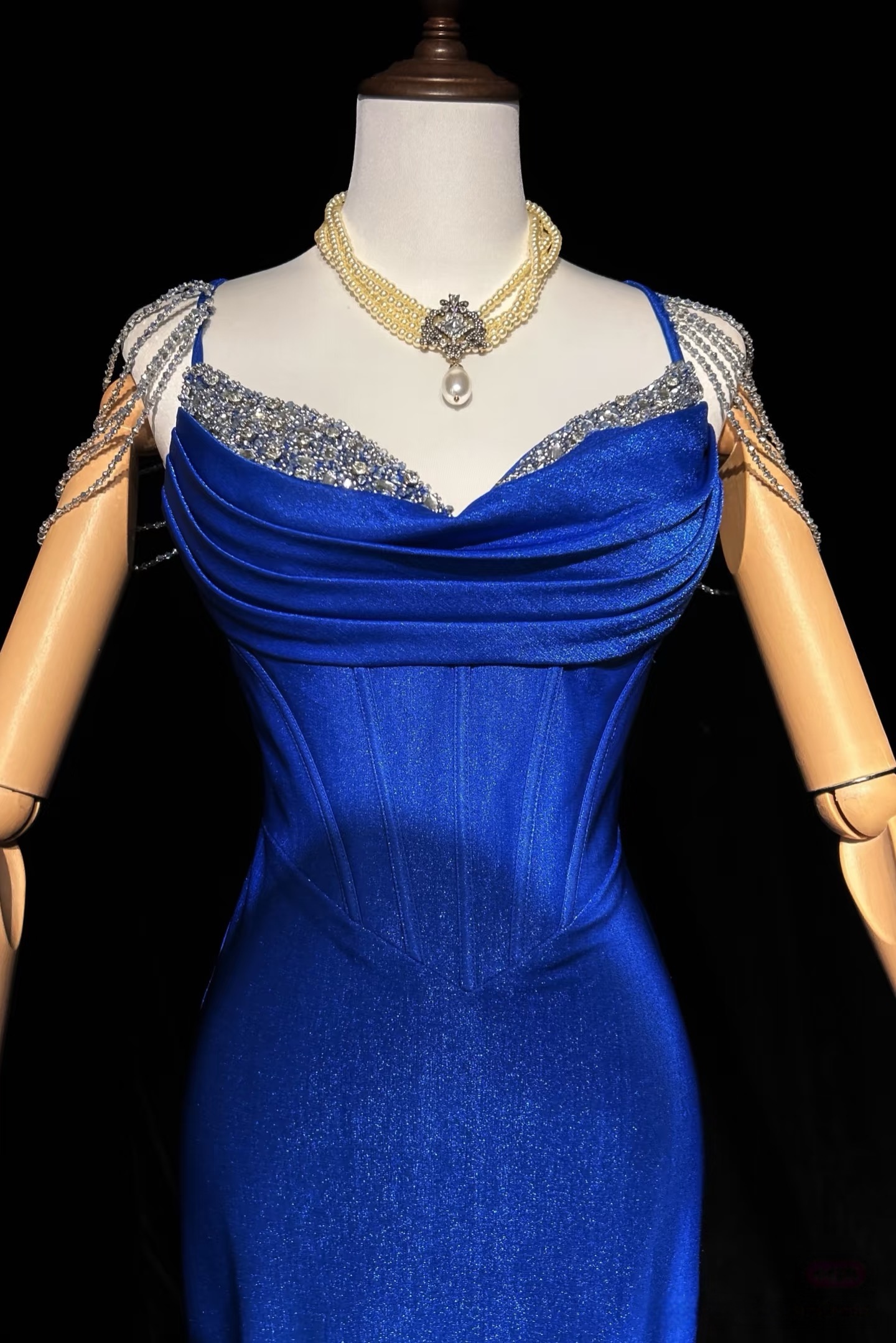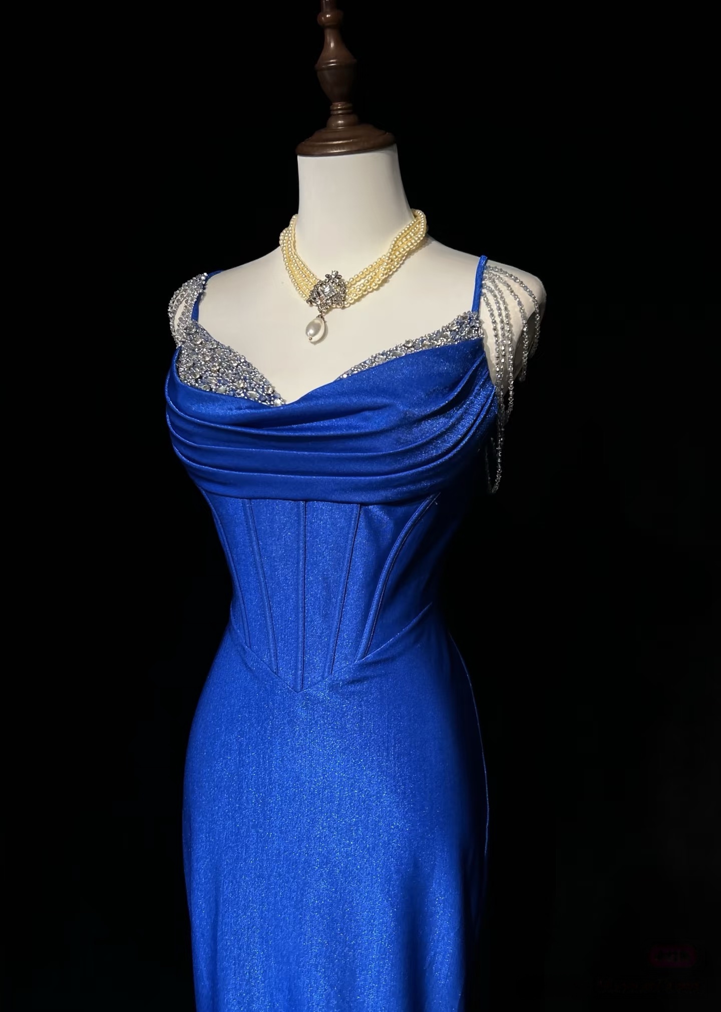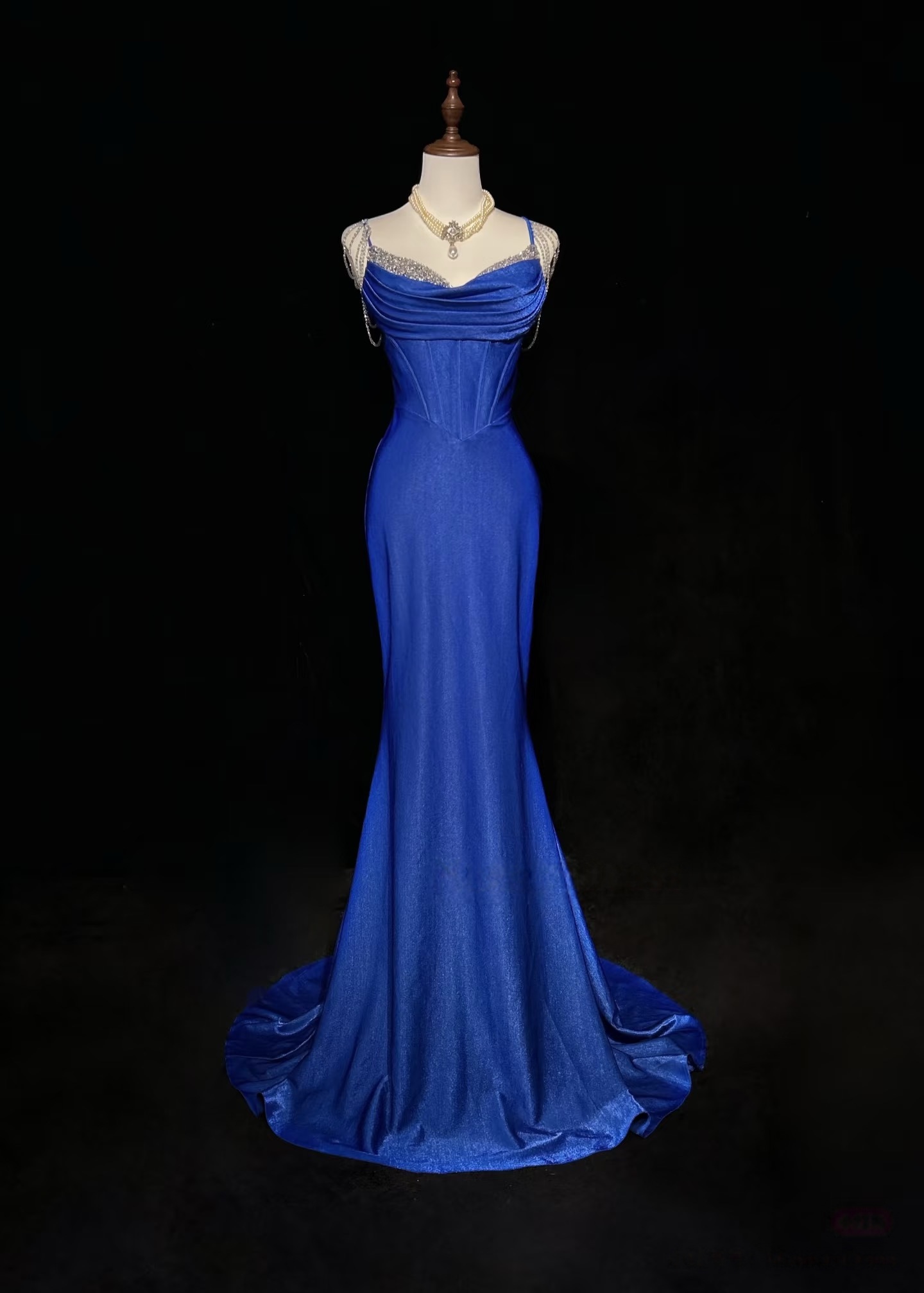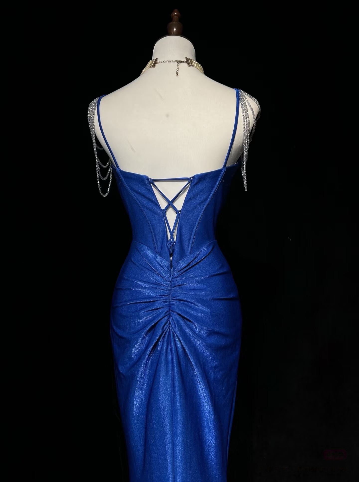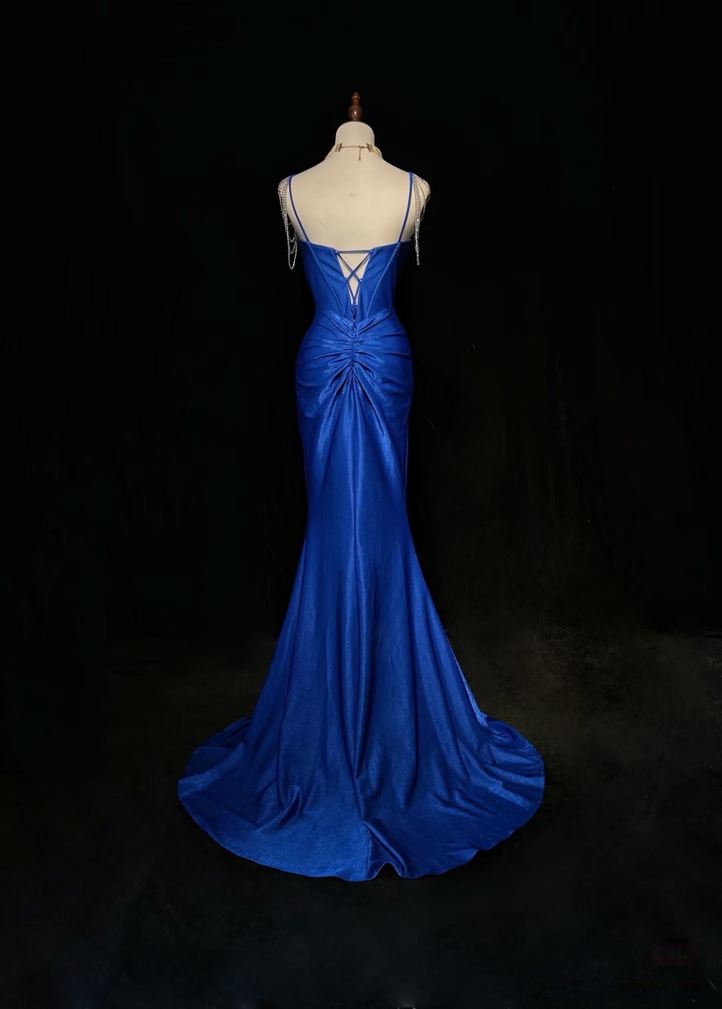 Royal Blue Elegant Mermaid Satin Spaghetti Strap Long Prom Dress Beaded Formal Evening Gown