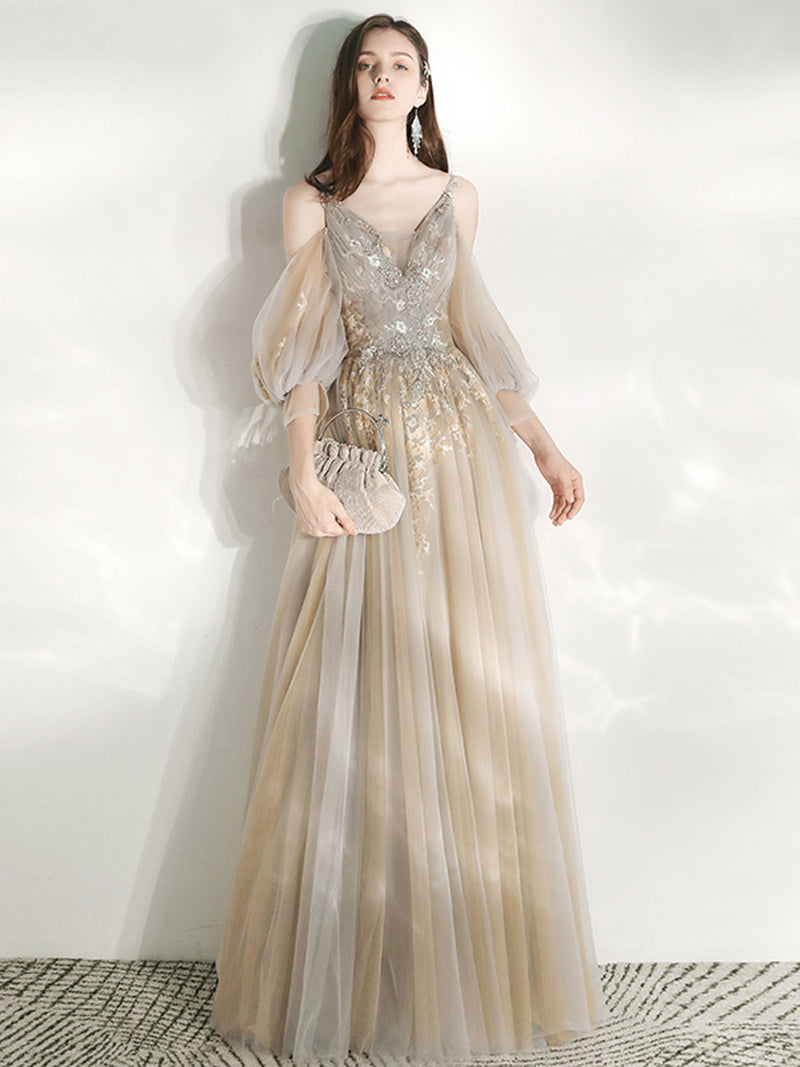 Champagne Dancing Prom Dresses A-Line / Princess Deep V-Neck Spaghetti Straps Puffy Long Sleeve Beading Sequins Floor-Length
